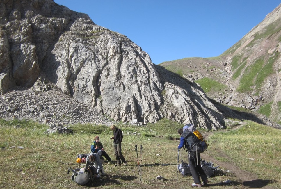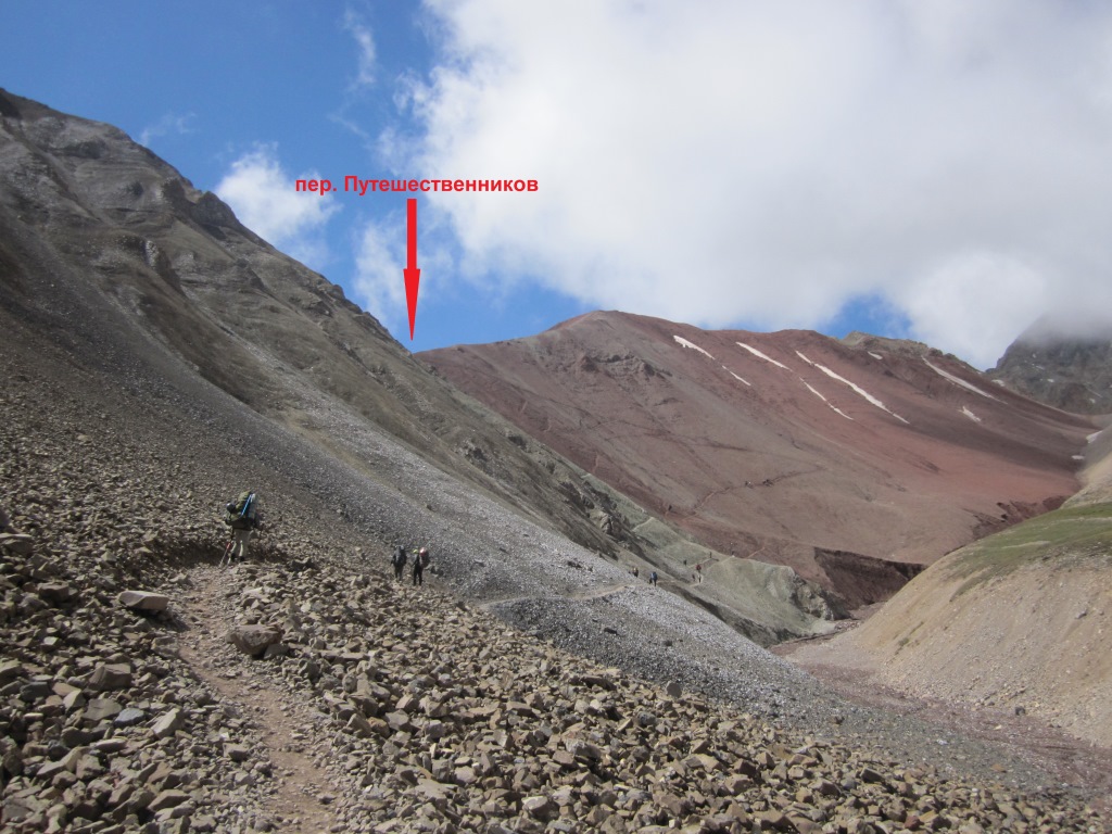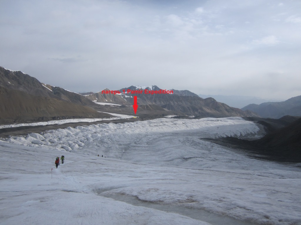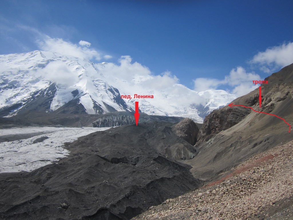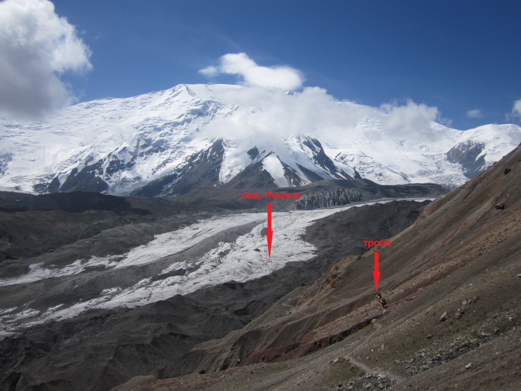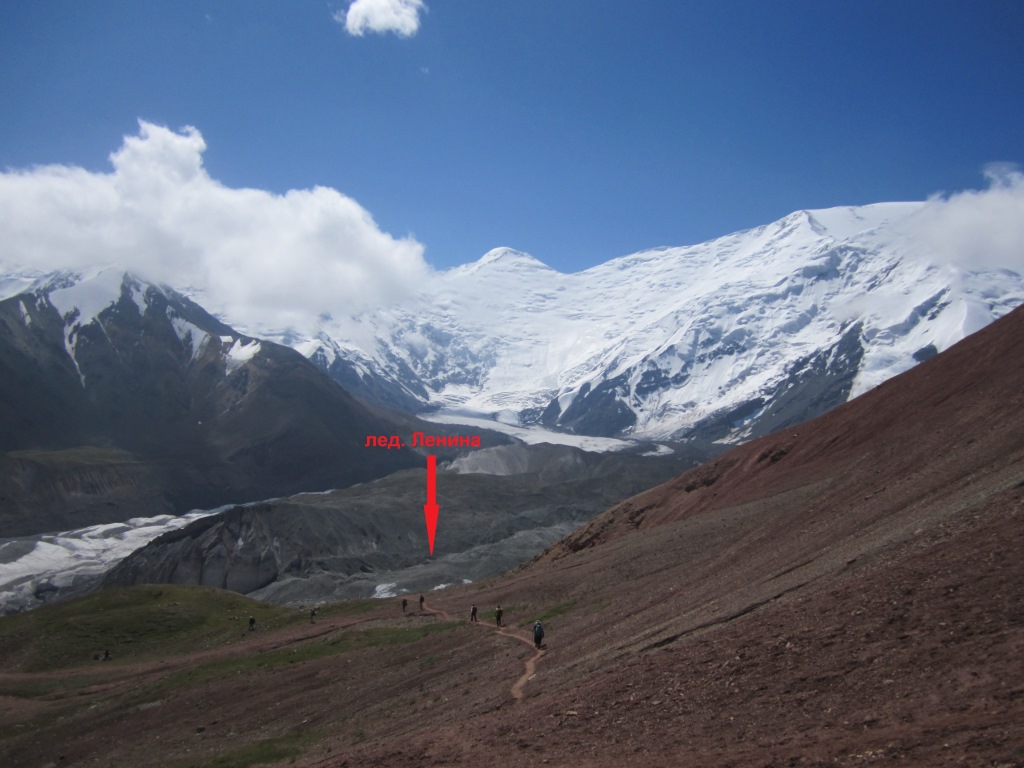 Подъем в 8.00, выход в 10.00. По грунтовой дороге за 2 перехода доходим до Луковой поляны (фото 2) Дальше по тропе обходим водопад слева по ходу движения и движемся также по хорошо набитой тропе к началу перевального взлета (фото 3,4) . Поднимаемся по крутому серпантину по красной осыпи на седловину (фото 5) Спуск с перевала в сторону лед. Ленина гораздо короче подъема, под перевалом есть зеленые ровные площадки, но воды здесь нет (фото 6) Спустившись с перевала Путешественников, тропа траверсирует левый борт долины над лед. Ленина (фото 7, 8) , пересекая порой подвижную осыпь. Здесь следует быть внимательным, иногда сверху сыпятся камни. Однако тропа хорошо утоптана многочисленными лошадями, переносящими грузы в лагерь 1. Далее по тропе спускаемся к реке, вытекающей из левого притока лед. Ленина. Здесь через реку за определенную плату предлагают перевезти находчивые киргизы на лошадях. Мы реку переходим немного выше по течению по камням. Перейдя реку, останавливаемся перекусить, и наблюдаем, как буквально через полчаса уровень воды в реке поднялся, и к месту нашего перехода уже невозможно было подойти. Т.о. реку рекомендуется переходить в первой половине дня. После реки тропа вновь взбирается на левобережные морены и приводит в лагерь 1 под пиком Ленина (фото 9) Мы стояли на территории лагеря ITMC, высота лагеря 4415 м. В лагерь пришли в 17.00.