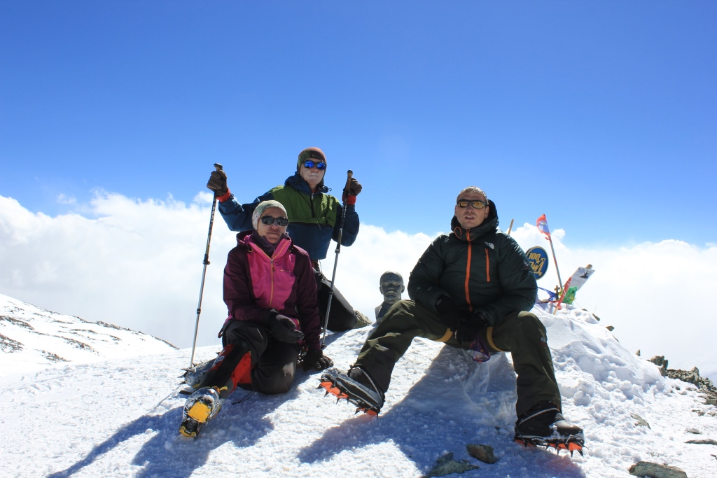 Подъем в 3.00, выходим в 5.10. С вершины Раздельная спускаемся по широкому и пологому снежному склону на седловину (перевал Раздельный) (фото 20) Здесь также некоторые восходители ставят палатки и с седловины стартуют на вершину. На седловине есть трещины. С седловины в сторону пика Ленина уходит некрутой и широкий снежно-осыпной гребень. По нему за 2 часа поднимаемся на плато 6400. Здесь двое участников команды из-за плохого самочувствия поворачивают назад, а трое продолжают восхождение. Протяженность снежного плато около 1 км. Здесь также некоторые восходители организуют биваки, однако надо учитывать, что здесь бывают ураганные ветры. Далее примерно за 1 час пересекаем плато и подходим ко второй некрутой ступени на гребне. Здесь гребень сужается и на коротком участке (30-40 м) образует так называемый «нож», на самом деле, не очень крутой снежный узкий участок гребня (фото 21) Здесь закреплены стационарные перила. Мы воспользовались ими только на спуске. Участок обхода ножа требует аккуратного прохождения ввиду того, что склон продолжается обрывами к лагерю 2. Далее выходим на длинный снежно-осыпной широкий гребень с выходами скал (фото 22) , а по нему на плато 7000 м. После плато идет вершинный купол, представляющий из себя череду снежно-осыпных ступеней. Подъем на купол занял более 1ч при общем перепаде от плато порядка 100 м. Вершина представляет собой снежно-осыпное плато. Тур находится у небольшой груды камней, здесь стоит бюст В. И. Ленина (фото 23) , рядом небольшой обелиск парашютистам. Выйдя из лагеря 3 утром в 5.10, мы достигли вершины в 15.00, затратив на подъем порядка 10-ти часов. Спуск в лагерь 3 по пути подъема занял 4,5 часа.