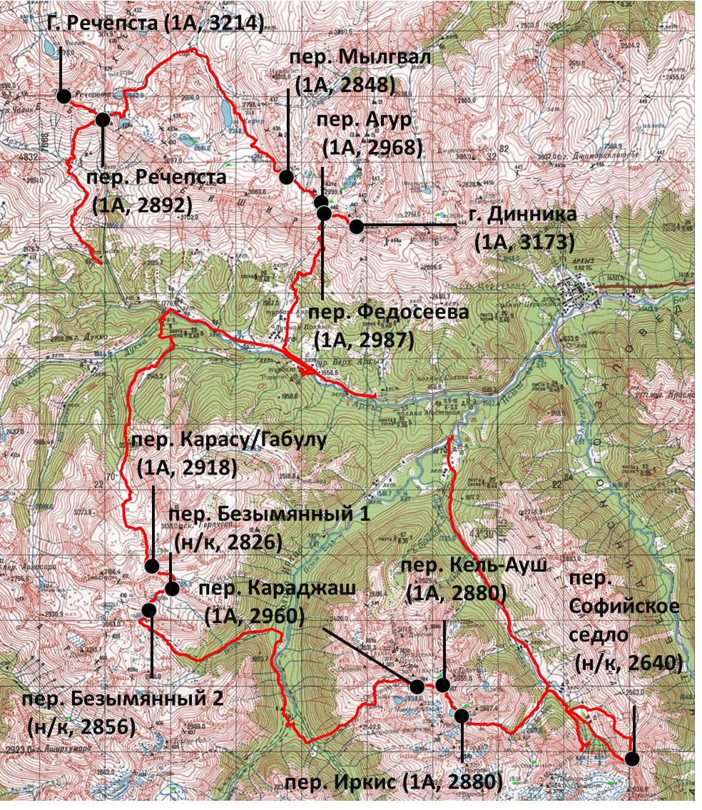 Основные локальные препятствия маршрутаПер. Речепста (1А, 2892). На подъем травянистый склон крутизной до 30 градусов. Необходимое снаряжение: каски, ледорубы/треккинговые палки. Вер. Речепста (рад, 1А, 3214). Подъем по широкому пологому скально-осыпному гребню. Спуск по маршруту подъема. Движение плотной группой в сухую погоду. Необходимое снаряжение: каски, ледорубы/треккинговые палки. Пер. Мылгвал (1А, 2848). Озеро обходится справа по ходу движения по крупной и средней осыпи. Около 100 метров по высоте средней и крупной осыпи крутизной до 25 градусов, далее снежник. Необходимое снаряжение: каски, ледорубы. Связка перевалов 1А пер. Агур (2968)+пер. Федосеева (2987). Снежно-осыпной взлёт около 100 м, крутизной 15 градусов. Траверс осыпного склона отрога хребта Абишир-Ахуба, к пер.Федосеева. На спуск с пер.Федосеева осыпной взлёт протяжённостью 100 м, крутизной до 20 градусов, справа и по ходу разрушенные скалы. Необходимое снаряжение: каски, ледорубы. Вер. Динника (рад, 1А, 3173): На подъем средний и мелкоосыпной гребень, участки разрушенных скал. Необходимое снаряжение: каски, ледорубы. Связка перевалов 1А пер. Карасу (Габулу) (2918)+пер. Безымянный 1 (2826)+пер Безымянный 2 (2856). Подъем по средней и мелкой осыпи, обход слева бараньих лбов. Спуск по средней и мелкой осыпи. Перевалить через невысокий гребень (2826 м.) западнее, затем перевалить через следующий гребень (2856 м.) и по крутому осыпно-травянистому склону (в верхней части более 30 градусов) спустится к Белореченскому озеру. Необходимое снаряжение: каски, ледорубы. Связка перевалов 1А пер. Караджаш (2960)+пер. Кель-Ауш (2880). Подъем на пер. Караджаш по тропе. Спуск с пер. Караджаш 150м крутизной до 35 гр по скально-осыпному языку между снежников Движение плотной группой в сухую погоду. Необходимое снаряжение: каски, ледорубы. Пер. Иркис (1А, 2880). Подъем по снежному склону крутизной до 30 градусов с хорошим выкатом внизу. Спуск 100 м по осыпному склону крутизной от 5 до 30 градусов. Движение в касках и с ледорубами, в произвольном порядке с соблюдением техники безопасности. Пер. Софийское седло (н/к, 2640). Подъем по тропе по травяному склону крутизной 10-15 градусов. Спуск по маршруту подъема. Движение в касках и с ледорубами, в произвольном порядке с соблюдением техники безопасности. Характеристика района походаРайон Архыз является довольно популярным местом проведения горных туристических походов начального и среднего уровня сложности. Привлекательность района складывается из множества параметров. К ним относятся, в частности, мягкий климат с большим количеством солнечных дней летом, транспортная доступность, развитая инфраструктура в низовьях рек Архыз и Псыш. Но, в первую очередь, на наш взгляд, стоит выделить эстетическую составляющую. Заснеженные вершины хребтов, широко раскинувшиеся альпийские и субальпийские луга, множество рек, зелено-голубая вода озер – все это в сочетании формирует ландшафтный облик, захватывающий дух. Архыз хорошо исследован и обладает большим количеством препятствий разного уровня сложности, что открывает широкие возможности при составлении маршрута. Населенный пункт Архыз расположен на юго-западе Карачаево-Черкесской республики, в 52 км к югу от станицы Зеленчукской, в верховьях реки Большой Зеленчук, на высоте 1450 м. Горный район Архыз приурочен к орографической области Западного Кавказа. С севера гран