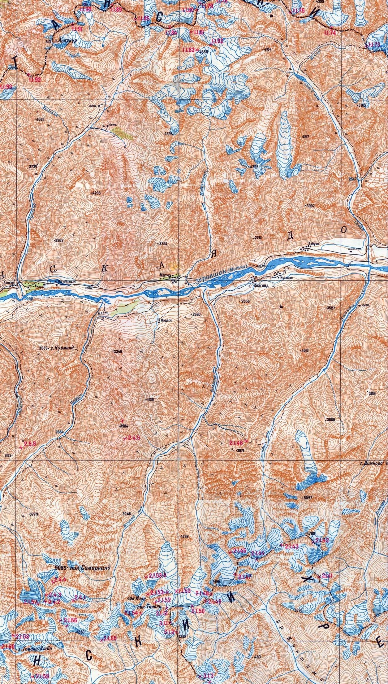 Пер. Голируд З.(1Б, 4100) - пер. Голируд Ц. (1А, 4040)– р. Тавастин Сев. 21 сентября (день 15-ый) С места ночевки выход в 9 ч 15 мин. Идем в восточном направлении, поднимаясь по некрутому скату небольшой узловой вершинки (10 мин., набор высоты 60 м). С вершинки на запад по гребню просматриваются все седловины: пер. 25лет т/к Гастелло, Дочерей, Шаповалова, на восток хорошо видны седловины перевалов Голируд Центр., Последний Привет, Такоб, Любимых. Несложный пологий спуск по разрушенному скально-осыпному гребню. Выходим на явно выраженную тропу, которая режет склон, и траверсом выводит на седловину пер. Голируд Ц. (фото № 35). Пер. Голируд Ц. (1А, 4040 м, лед.-ос.) (по QPS - h=4013м N= 39град15.566 Eо 69град28.648). Расположен в Зеравшанском хребте в 3-3.5 км западнее небольшой узловой вершины, от которой на север отходит отрог, водораздел левых притоков Зеравшана - Тавастина С. и Падаска.Соединяет долину р. Тавастин Сев. (левого притока р. Зеравшан) с юга – с долиной р. Голируд (правого притока р. Ягноб). Перевал имеет и другие названия: Гаваст, Табаспин, местные жители название реки, долины произносят несколько иначе, чем принято в туристской литературе. Они говорят "табаспин", перевода не знают. Южный склон перевала осыпной, нижняя его часть травянистая с выходами скал, а еще ниже - бараньи лбы, обрывающиеся в долину р. Голируд. Седловина перевала хорошо заметна с севера, с юга же ее определение затруднено, т.к. гребень доступен на большом протяжении. Ориентирование склонов С-Ю. Гребень протяженный, скально-каменистый, с выходами разрушенной породы. С перевала хороший обзор на север и юг, частично на запад и восток. Подъемы на перевалы Голируд З. и Голируд Ц. со стороны Ягноба совпадают, и лишь перед самым выходом на гребень Зеравшанского хребта, тропа траверсирует с небольшим спуском в направлении седловины перевала Голируд Ц. Местные издавно через этот перевал перегоняют скот. Тур на перевале Голируд Ц. находится посередине гребня. Записки в туре не было. На перевале есть удобные для установки палаток площадки, но площадки лучше ближе к западной части. С северной стороны почти вплотную подходит ледник, густо усыпанный овечьим пометом. Поэтому снег для воды следует брать как можно дальше от перевала. Спуск с перевала по плотному снегу вдоль левого (орографически) склона ледника, крутизна склона до 40град, ледник открытый, затем ледник становится пологим (уклон от 10 до 30град). Далее лучше идти ближе к склонам, так как в центре ледника много трещин. Ниже ледник закрыт моренными камнями. Идем по моренной гряде – отсюда хорошо видна вост. ветвь ледника Тавастин Ц. ведущая на пер. Последний Привет (фото № 36). Слева скала в конце отрога, разделяющая ледник Голируд Западный и западную ветвь ледника Тавастин Ц. Ближе к правому краю спускаемся и выходим на хорошую тропу. Склон, крутизной 35-400 с множеством бараньих троп выводит на правобережную террасу р. Тавастин Ц., где находится пастушья ночевка. По правому берегу реки видна хорошо утоптанная тропа. От слияния рек Тавастин Ц. и Тавастин Сев. спустились чуть ниже (20 х\мин) и встали на ночевку на правом берегу р. Тавастин Ц. в 17 ч 55 м, h=3288 м. Перевал Голируд Ц. проходится за 1 день без организации ночлега, при необходимости установка палаточных биваков возможна на большей части пути через перевал, в том числе и на перевальном гребне.