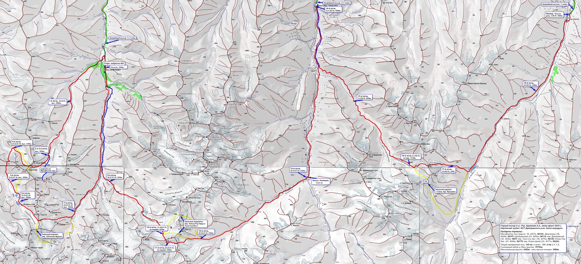 *С учетом коэффициента 1.2, без учета повторяющейся части маршрута по долинам и радиальный выход в одну сторону. В скобках указан общий пройденный путь с К 1,2, Подробная нитка маршрута. Заявленная: г. Москва – г. Бишкек - а/л «Ала-Арча» (2160м) - д.р. Адыгене – пер. Мин-Джылкы Ашу (1Б, 4055м, радиально) – пер. Джеламыш (1Б, 4100м) – лдн. Гюзели - пер. Центральный (2А, 3900м) – долина притока р. Чон-Тор – пер. Эстонский (1Б, 3900м) – д.р. Ала-Арча (заброска 1) – д.р. Туюк – лдн. Туюк-Су Сев. – пер. Туюк-Суу Зап. (1Б, 4000м) – лдн. Туюк-Суу Южн. (Геофака) – пер. Алтын-Тор Зап. (2А, 4050м) – д.р. Алтын-Тор – д.р. Аламедин – слияние с р. Салык – радиально: т/б «Теплые ключи» (заброска 2) – д.р. Салык – лдн. Салык Вост. – радиально, связка 1Б: – пер. Проценко – в. Физматовец (1Б,4500м) – пер. Искра Центр. (2А, 4350м) – лдн. Ивероновой (Искра) – д.р. Ыссык-Ата – кур. Ыссык-Ата – г. Бишкек – г. Москва. Пройденная**(см. изображение 1). г. Москва – г. Бишкек - а/л «Ала-Арча» (2160м) - д.р. Адыгене – пер. Мин-Джылкы Ашу (1Б, 4055м, радиально) – пер. Джеламыш (1Б, 4100м) – лдн. Гюзели - пер. Центральный (2А, 4050м) – долина притока р. Чон-Тор – пер. Дмитровский (1Б, 3928м) – д.р. Ала-Арча (заброска 1) – д.р. Туюк – лдн. Туюк-Су Сев. – пер. Туюк-Суу Зап. (1Б, 4076м) – лдн. Туюк-Суу Южн. (Геофака) – пер. Алтын-Тор Зап. (2А, 4050м) – д.р. Алтын-Тор – д.р. Аламедин – т/б «Теплые ключи» (заброска 2) – д.р. Салык – лдн. Салык Вост. – пер. Искра Центр. (2А, 4377м) – лдн. Ивероновой (Искра) – д.р. Ыссык-Ата – кур. Ыссык-Ата – г. Бишкек – г. Москва. По плану: пер.2А – 3 шт. пер. 1Б – 4 шт. радиально связка 1Б – 1щт. Пройдено: пер. 2А – 3 шт. пер. 1Б – 4шт. ** Маршрут пройден без отклонений от заявленного, за исключением, отказа от радиального выхода на пер. Проценко и в. Физматовец. Радиальный выход на пер. Проценко и в. Физматовец, по согласованию с МКК, проходился только при условии хорошего резерва по времени и силам. Учитывая сложные погодные условия, в которых проходил поход, надобность в усложнении маршрута отпала сама собой, и радиальный выход был отменен. Различие в названиях: в заявленной части пер. Эстонский, а в пройденной - пер. Дмитровский, из-за существующей путаницы с этими перевалами! По факту мы прошли тот перевал, который и планировали, но из-за неточностей на фотографиях и в описаниях по этим перевалам, по ошибке назвали перевал при планировании похода - «Эстонским». Большинство групп, на пер. Дмитровский, поднимаются радиально и в виду большой камнеопасности перевала на спуск и отсутствия должных описаний, продолжают маршрут, через пер. им. 100-летия гор. Фрунзе. Одна из задач похода, была, разобраться по точному месторасположению перевалов Эстонский и Дмитровский и по возможности пройти перевал насквозь. Это удалось осуществить, составлено важное описание перевала Дмитровский, уточнено его точное месторасположение. Кроме того, была проведена определенная работа по установлению того, кто и когда прошел перевал Дмитровский впервые. (Подробнее об этом будет изложено в п. 2.1. - элементы новизны и в 2.6 - техническое описании). Обзорная карта региона с указанием маршрута, подъездов и отъездов. К отчету прилагается карта-хребтовка с ниткой маршрута (изображение 1) и электронный файл изображения карты размером 7070х3220 пикс. скачать картуИзображение 1. Нитка маршрута с местами ночевок, запасными и аварийными выходами с маршрута на карте-хребтовке Киргизского хребта (оригинал в Приложе