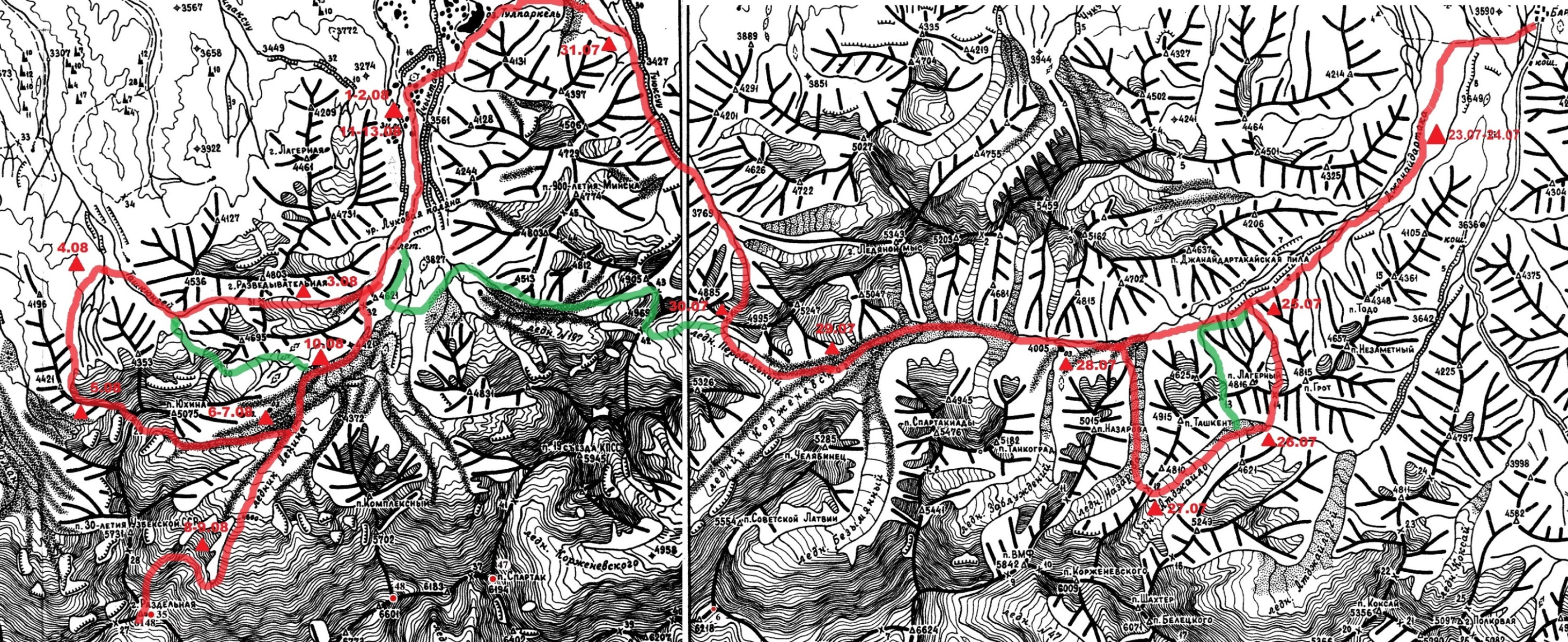 Заявленный и пройденный маршрут Нитка маршрута заявленная: г. Ош – погранзастава Бардоба – д/р Джанайдартака – пер. Сыпучий (2А, 4592) – лед. Атджайло – пер. Назарова (2Б, 4670) – лед. Назарова – лед. Корженевского – Запасные варианты перевалов: пер. Лагерный (2А, 4547), связка пер. Мира Зап. (2А, 4900) + пер. Золотой телёнок (2Б, 4735), пер. Минский (1Б, 4389), пер. Ташкюнгей (2А, 4539). Нитка маршрута пройденная: г. Ош – погранзастава Бардоба – д/р Джанайдартака – пер. Сыпучий (2А, 4592) – лед. Атджайло – пер. Назарова (2Б, 4670) – лед. Назарова – лед. Корженевского – Изменения маршрута 1. Один запасной день был потерян из-за накладки с билетами, т.к. первый день пришлось посвятить закупке продуктов. 2. Один запасной день был потерян из-за непогоды под перевалом Туюксу. 3. Отказ от прохождения перевала №44 был обусловлен отставанием от запланированного графика движения. 4. Во время спуска по долине реки Туюксу, после прохождения первой части маршрута, у одного из участников дала о себе знать, старая травма колена. В связи с чем, было принято решение задержаться на 1 день в базовом лагере, чтобы дать больше времени на восстановление. 5. В связи с отставанием от графика движения, на втором кольце у нас был выбор: отказаться от прохождения пер. Разведывательный (2А) и пер. 60 Лет Октября (2Б) или же отказаться от восхождения на вершину Раздельная (2Б). Так как одной из основных задач данного похода являлась получение нового высотного опыта для всех участников, то мы решили отказаться от прохождения 2-х перевалов в пользу вершины Раздельная. Организация похода. Маршрут группы начинался от погранзаставы Бардоба, которая находится в 210 км от г. Ош. Авиабилеты До Оша добирались самолетом Москва-Ош. Билеты брали 19 февраля авиакомпании Вим-Авиа. Три человека из группы билеты брали с вылетом из Москвы 21 июля в 18.20 и прилетом в Ош 22 июля в 1.30. Стоимость билета составила 5663 рубля. Это было сделано, чтобы в Оше закупить продукты и горючее, чтобы к прилету оставшихся участников можно было сразу ехать к месту старта нашего маршрута. Оставшиеся двое участников взяли билеты на 22 июля с вылетом из Москвы в 19.50 и прилетом в Ош в 23 июля в 3.00. Однако нашим планам не суждено было сбыться, за неделю до вылета выяснилось, что все рейсы компании Вим-Авиа в Ош отменены. Авиакомпания об этом никого не предупреждала, как они потом сказали, что они предупреждают ближе к дате вылета, видимо в день вылета. На наш запрос в авиакомпанию, предложили вернуть деньги. За три билета деньги вернули. Двое других участников решили попробовать запросить пересадку на другой рейс. Их пересадили на рейс компании Aviatraffic с вылетом 22 июля в 22.30 и прибытием в 5.35, правда, нормативный бесплатный вес багажа вместе с ручной кладью у них был 20 кг. Троим, сдавшим билеты, удалось купить другие билеты только на 22 июля с вылетом в 19.35 и прилетом 23 июля в 2.40. Стоимость билета составила С обратными билетами сложностей не возникло. Часть участников летели авиакомпанией S7, а другая часть компанией Aviatraffic. Билеты брали 4 апреля. Стоимость билета авиакомпанией S7 составила 12672 руб., стоимость билета авиакомпанией Aviatraffic - 10520 руб. Трансфер О трансфере, покупке газа и об оформлении погранпропусков договаривались - трансфер для группы из 5 чел. Ош - Бардоба (УАЗ 7 мест) - 200 долларов США - организация продуктовой заброски в базовый лагерь Ачик-Таш (попутно - трансфер г