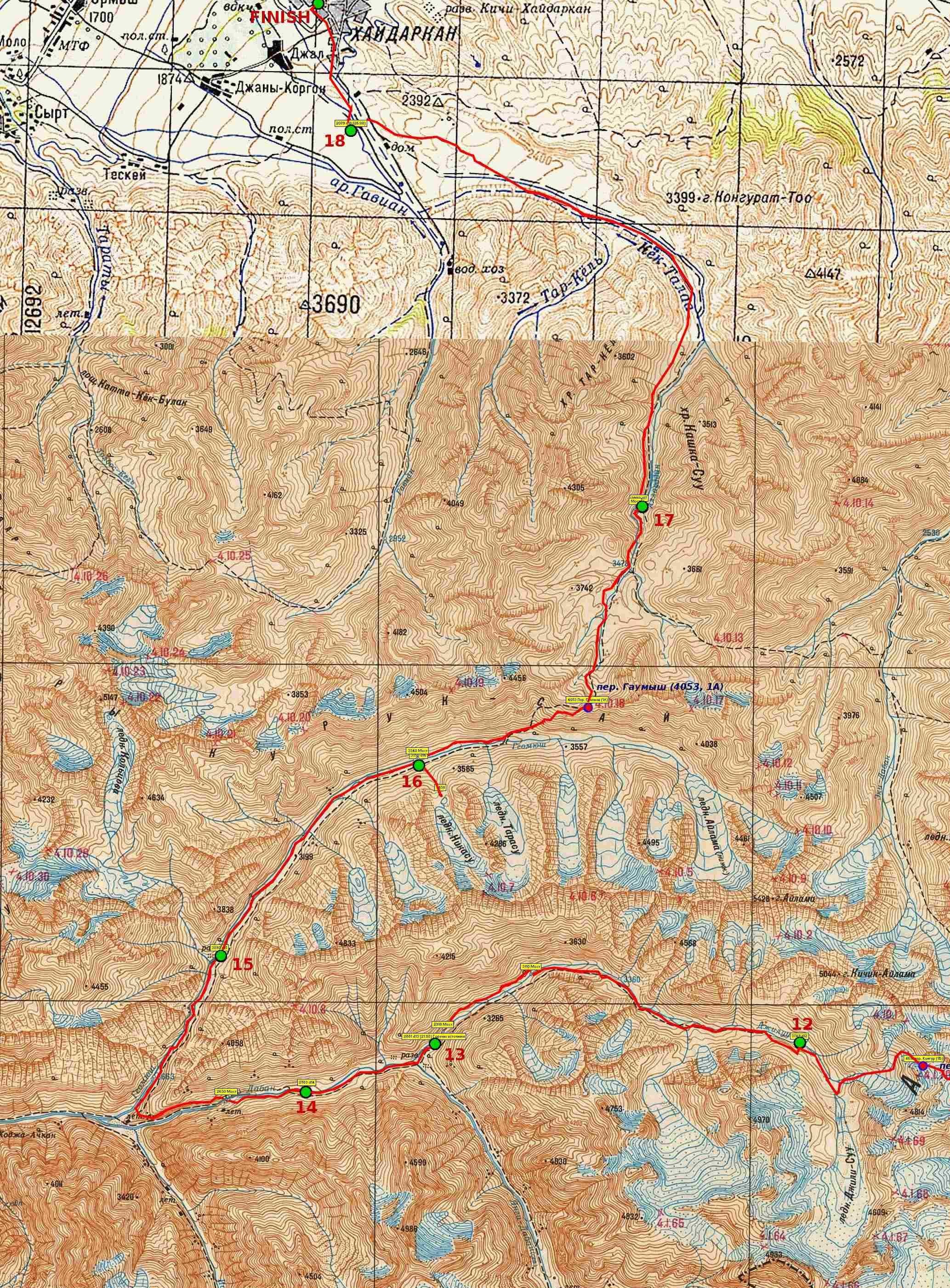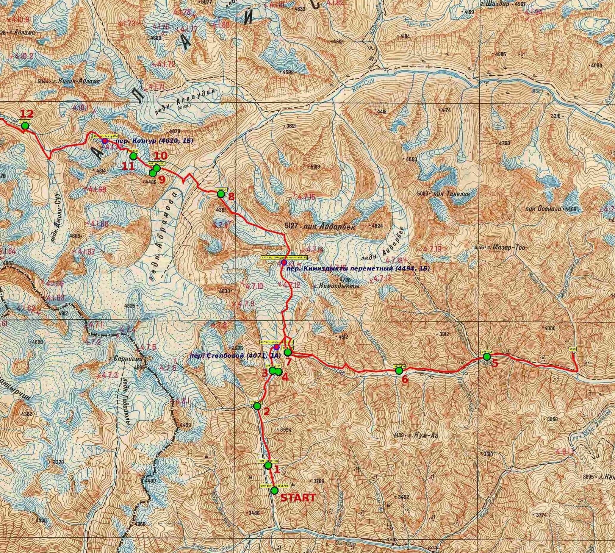 В зачет 118,05 * 1,2 = 142 км. Фактически пройденный путь 148,23 * 1,2 = 178 км. Суммарный набор высоты - 6912 м Средняя высота ночевок - 3377 м ССЫЛКИ 1. Л.Д. Подкопаева. Бассейн р. Кызылсу. Каталог ледников СССР, том 14, выпуск 3, часть 7. Гидрометеоиздат, Ленинград, 1976. 2. Ю.А. Зенцов. Отчет о горном походе 5 к.с. по Алаю, 1989 http://www.tlib.ru/doc.aspx?id=36422&page=1 3. А.А. Лебедев. Отчет о горном походе 1 с эл. 2-й к.с. по Алаю, 2015. http://static.turclubmai.ru/papers/2211 Акклиматизация и неудавшееся кольцо. 1.1. Челнок с заброской через перевал Столбовой. Утром 08.07 мы приземлились в Ошском аэропорту, к обеду мы уже въехали в Алайскую долину и ближе к вечеру прибыли в селение Карамык, которое расположено в долине р. Кызылсу в трёх километрах от границы Киргизии и Таджикистана. Около селения Карамык в Кызылсу впадает крупный правый приток Аксу. В долине Аксу, менее чем в километре от Карамыка, находится кишлак Кара- тейит, в котором мы отпустили ошского водителя и пересели на местную кошевую машину. На этой машине (портере) мы проехали еще 15 км вверх по долине Аксу и еще 1,5 км вдоль её левого притока - Кутургана. Мотор у портера на подъёмах периодически глох, поэтому приходилось вылезать из кузова и толкать машину. Уже смеркалось, когда на очередном подъёме портер начал глохнуть, даже будучи облегченным. Это случилось в километре от кутурганского коша - запланированного места старта нашего похода. Мы распрощались с водителем и разбили лагерь на высоте 3017. За водой пришлось спускаться к реке. 09.07. Первый день похода начался с челнока. За две коротких ходки мы перенесли груз за кош и поставили лагерь чуть выше коша, в 60 метрах от самой верхней юрты. Высота 3074 м. Затем мы познакомились с обитателями коша и попросили их в наше отсутствие присмотреть за лагерем, после чего отправились с заброской вверх по долине.