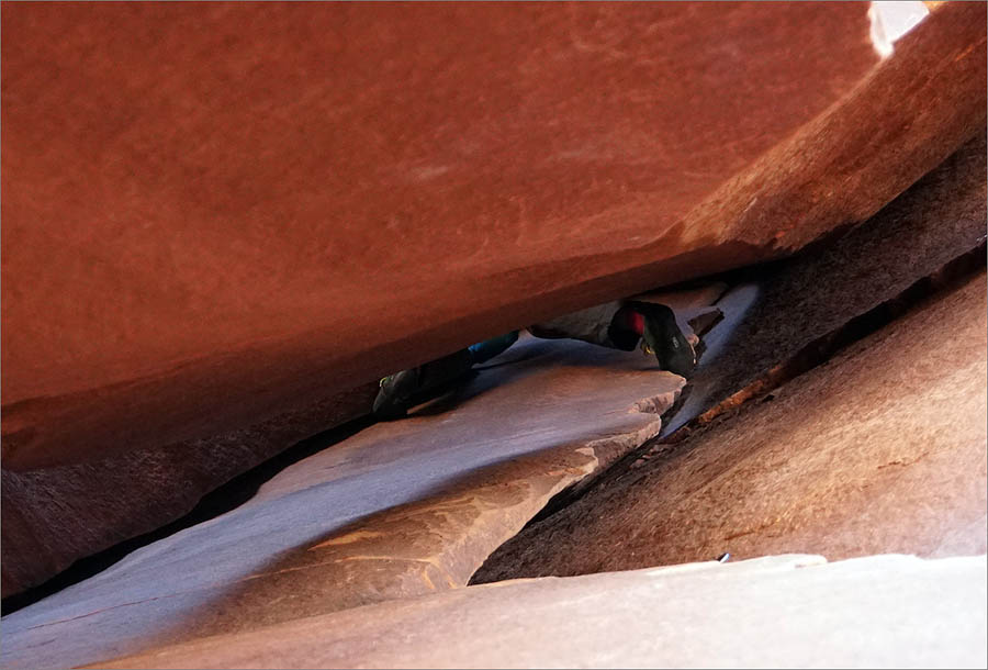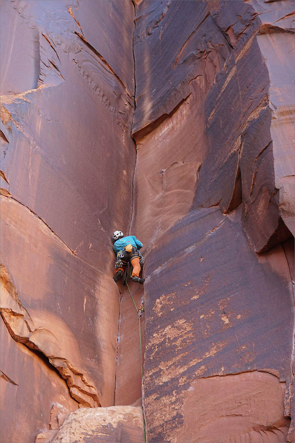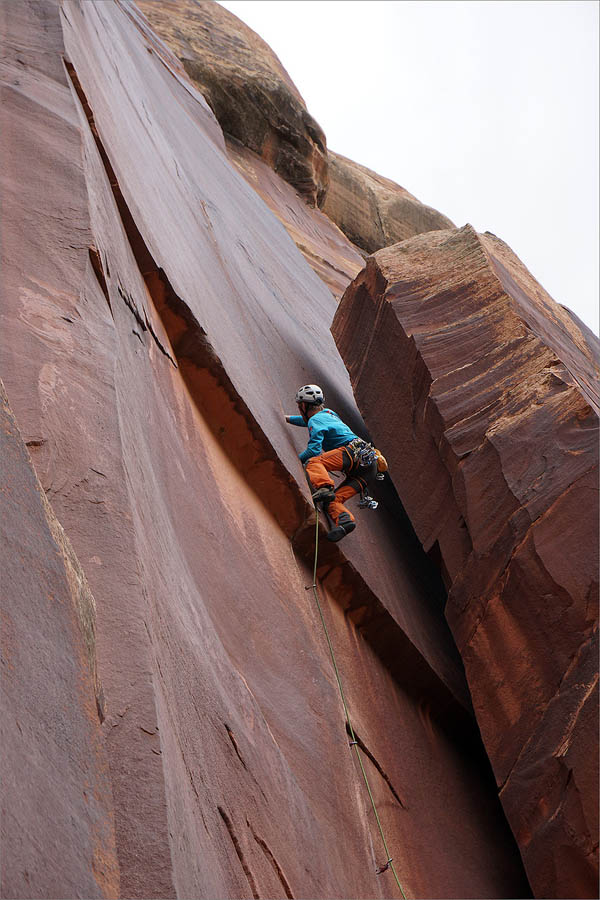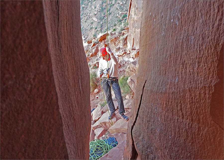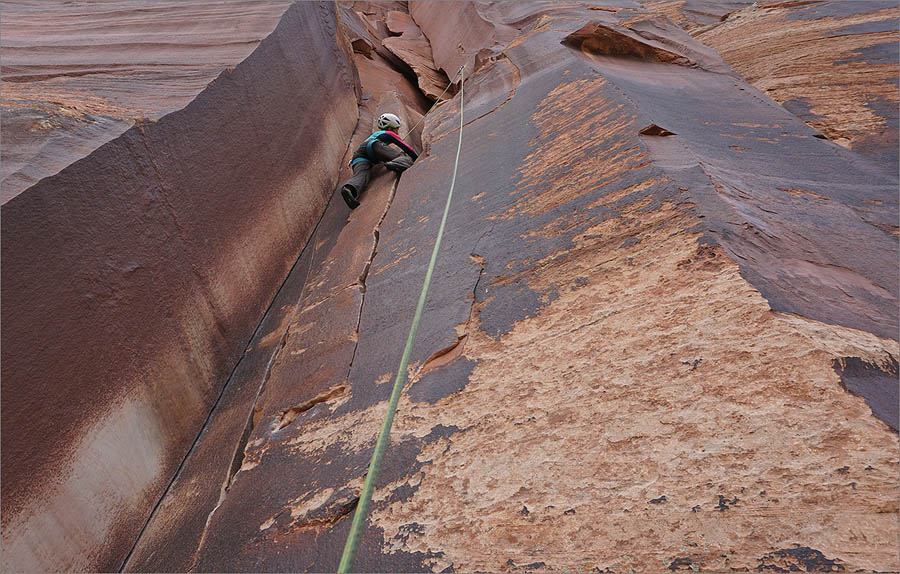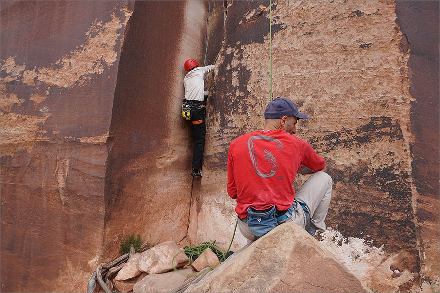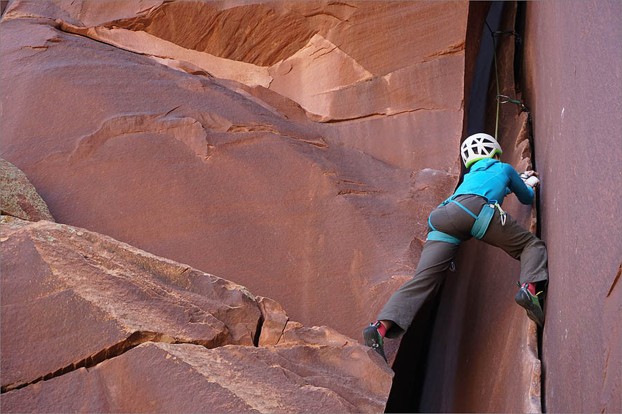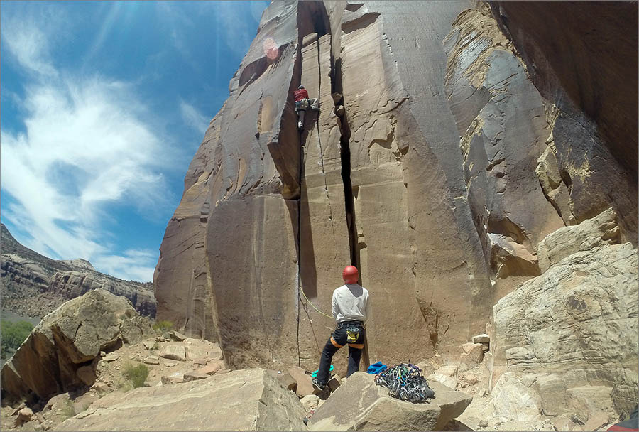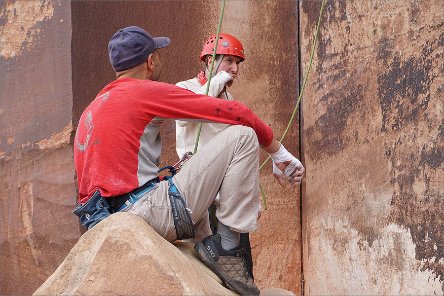 Тут надо заметить, что лазают здесь не по зацепкам, а по щелям. Ну и страхуются соответственно не за стационарные надежные шлямбура, забитые заботливыми трассёрами, а за то чем сам себя порадуешь. Ну и сильно важно быть богатым или иметь сто друзей так как каждый камалот на вес золота, а их надо много! Вот к примеру - полезу-ка я воот эту трассу то бишь щель. Открываю ipad и смотрю в mountain project, который надо заблаговременно скачать. Нахожу там трассу, смотрю что пишут. Ага - взять 3 зеленых, 4 красных 4 желтых и не помешают парочку синих. Ну и я сразу докидываю штук несколько разных - потому что америкосы то лазать умеют - а я то нет - вот и получается штук 15 камалотов. А весят они не как 15 оттяжек) Кроме того - надо замотать конечности верхние пластырем или пользоваться новомодными перчатками для лазания по щелям. Пластырь материал расходный так что надо запасаться. Изыскивать варианты купить подешевле - в Моабе рулон стоил 3 бакса в среднем.