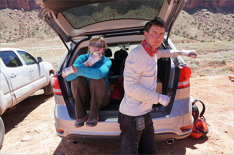 Помучившись пару дней решили что баста - надо что то делать с обувью. В день отдыха поехали в Моаб, походили по магазинам и купили Аньке какие то более плотные скальники eVolv, а я себе купил б/у скальники за 20 баксов. На них не было живого места - но как показала дальнейшая практика - дыры им можно простить!