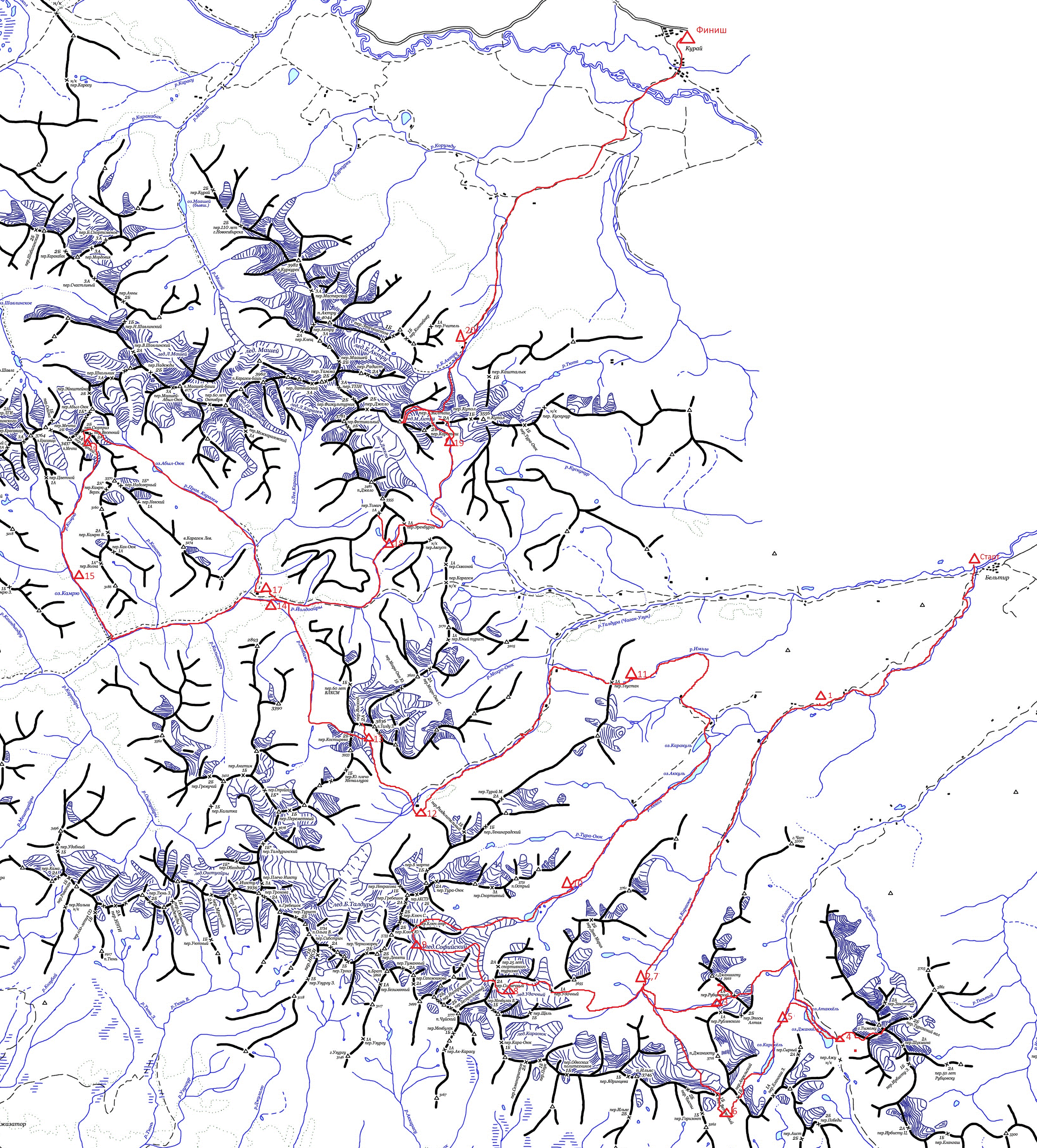 Подробная нитка маршрута: Пос. Бельтир - вверх по р. Аккол - р. Караоюк - пр. приток р. Караоюк рад. Выход на плечо в. Джаникту (1Б, 3655) - пер. Рубцовск (1Б) - р. Елангаш - оз. Джанкель - рад. восх. на в. Ирбисту(2А) - восх. на в. М. Попова(1Б) - р. Елангаш - пер. Апрельский (1Б) - истоки р. Аржан - пер. Ветреный (2А) - р. Караоюк - пер. Удачный (1А) - лед. Удачный - пер. Солнечный (2А) - Софийский ледник - пер. Ключ Отрожный (1Б) - вниз по р. Аккол - оз. Аккуль - пер. в ур. Шалтра (1А) - р. Имеле - пер. Теустан (1А) - р. Талдура - лев. пр. р. Талдура рад. выход на пер. Восход (2А) - пер. Костырева (3А) - р. Атбажи - р. Иолдо-Айры - р. Карагем - оз. Камрю - вверх по р. Камрю - р. Лев. Камрю рад. выход на пер. Весенний (2А) - пер. Сюрприз (2Б) - р. Пр. Карагем - р. Карагем - р. Иолдо-Айры - истоки р. Иолдо-Айры рад. выход на пер. Томич (1Б) - пер. Оренбурга (1Б) - р. Джело - вверх по левому притоку р. Джело рад. выход на пер. Кзылташ (2А) - пер. Караташ (2Б) - рад. выход на в. Снежная (2А) - р. Актру - Курайская степь - р. Чуя - пос. Курай. Карта похода