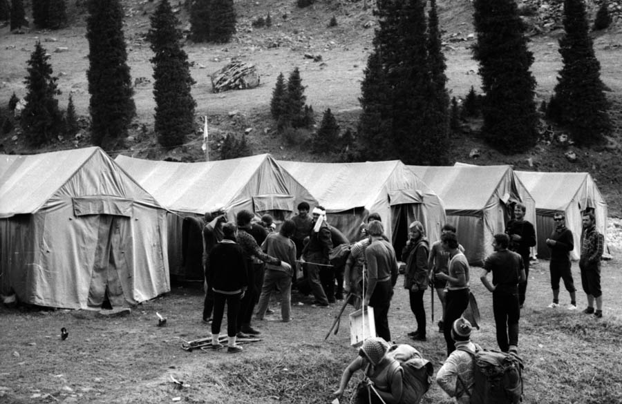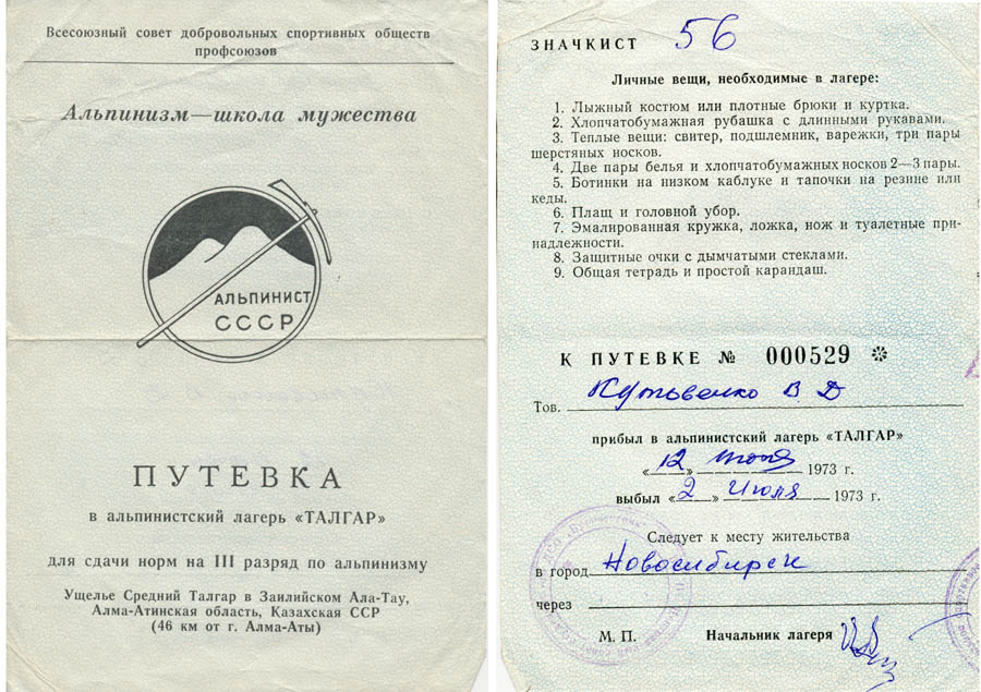 10 июня выехали мы с моей подругой Таней Титовой поездом из Новосибирска в Алма-Ату. Перед этим мы с Татьяной за день сделали то, что в другом случае делали бы месяц. Поезд проходил через г.Бердск, где я окончила школу и где жила моя семья. И они, конечно же, пришли к поезду с горячими пирожками и другой едой. До Алма-Аты доехали быстро и без проблем. От вокзала благополучно добрались на 4 троллейбусе до площади Абая, на котором стоит Дворец Ленина. Сразу за ним располагается городская база альплагеря Талгар. В ней мы поселившись в палатке, сделали себе страховку за 400 рублей. Страховым агентом был тот же, что и в прошлом году.