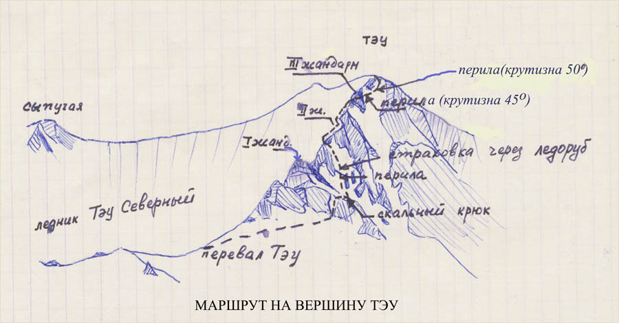 Маршрут начинается с морены ледника Южный ТЭУ. Держать направление и выходить на гребень на перемычку между II и III жандармами по широкому осыпному кулуару, или по выходам скал. Ориентиром может служить жандарм в виде пальца. Видно с ледника, он остается справа. На перемычке сложен I тур. От перемычки двигаться к Пальцу, который обходится справа. Четвертый жандарм обходится справа по заснеженным скалам, на длину 3х веревок. Скалы сильно разрушены, нужна попеременная страховка. Следующие жандармы: 5,6,7 обходятся справа, без выхода на перемычки с последующим выходом на гребень по внутреннему углу (страховка попеременная). Большой 8-й жандарм в виде бастиона обходится слева по скалам средней трудности. На гребне после 8-го жандарма сложен 2-й тур. Затем по гребню восточного плеча. Вначале скалы, потом небольшое снежное плато. Плато переходит в снежный гребень с рядом жандармов, которые обходятся. Здесь можно допустить одновременное движение. Гребень приводит к широкому скальному взлету высотой 70 – 80 метров. Подъем на взлет по осыпным кулуарам и скалам с выходом на боковой гребень и по нему на взлет. Страховка попеременная. По разрушенному гребню с последующим спуском вправо, выходить на снежно-ледовый склон. При этом организуются перила. Следующий 9-й жандарм обходится справа по границе скал и снежно-ледового склона на крюковой страховке (2 -3 штуки). Затем небольшой участок скальных плит средней трудности и спуск на перемычку перед предвершиной. Спуск удобнее произвести между двух огромных плит, привалившихся одна к другой и образовавших своеобразный шатер.