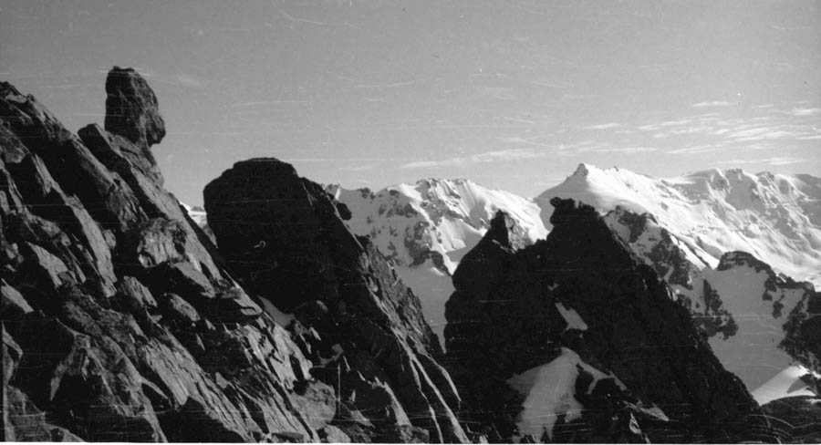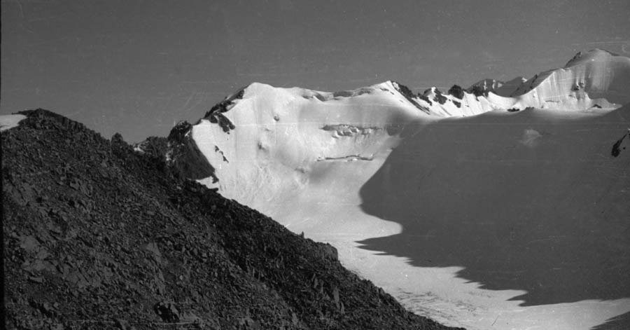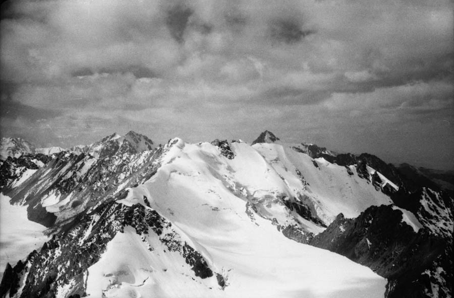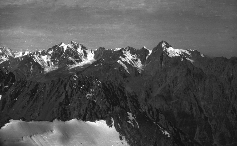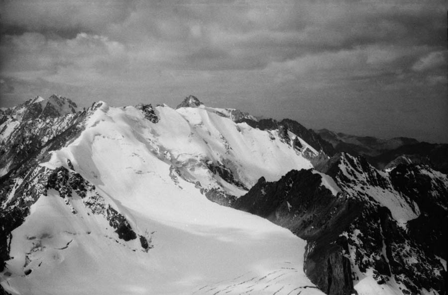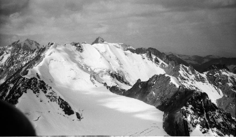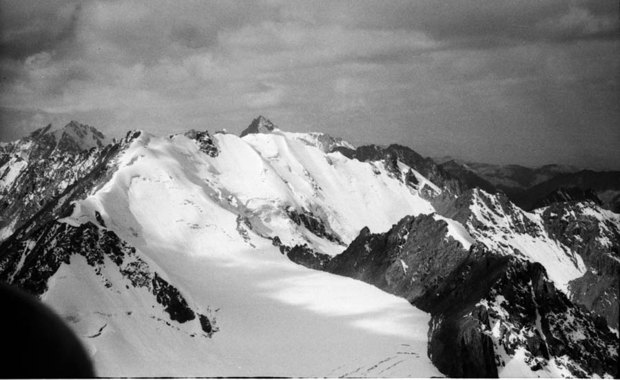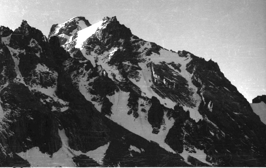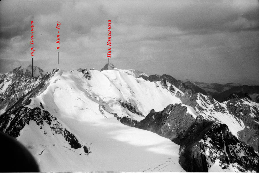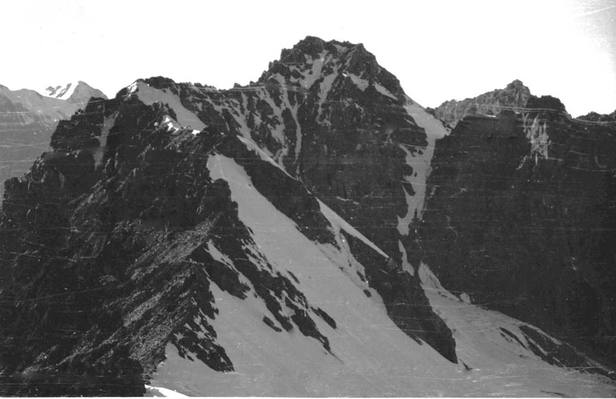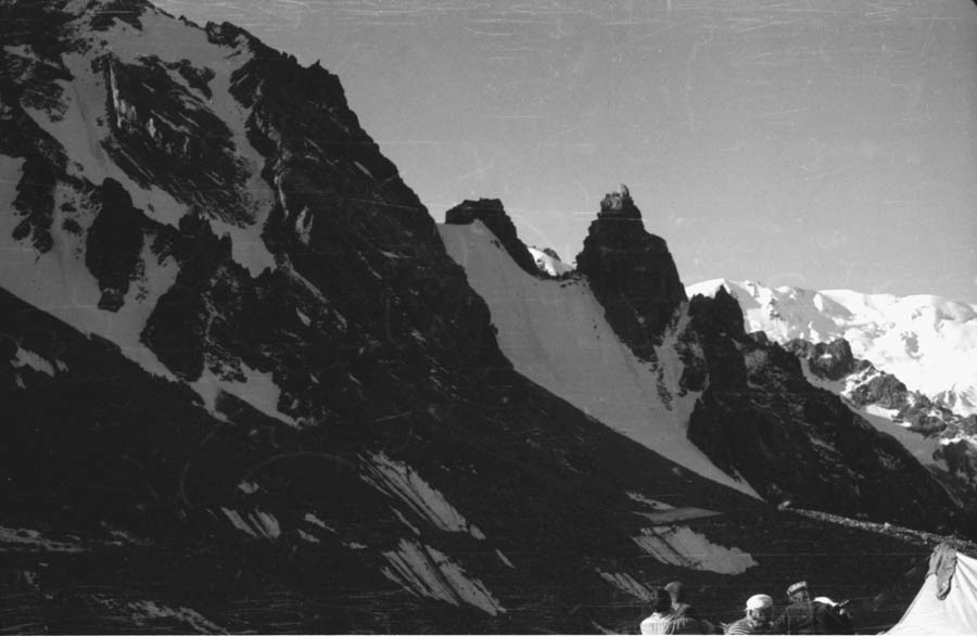 От подножья гребня до перевальной точки от 40 минут до 1 часа ходьбы. Высота – 3700 метров. С перевала до вершины идти по гребню с жандармами, которые обходятся справа по крутому склону и сильно разрушенным скалам. При обходе I жандарма страховка через скальный крюк. На II и III нужна попеременная страховка. Участок с жандармами занимает 2 – 2,5 часа. Дальнейший путь к вершине идет по гребню, где скалы перемежаются со снегом. Выход на вершину по крутому левому склону. В конце сезона нужна крюковая страховка (1 - 2 крюка). Иногда требуется рубка ступеней или применение кошек. Вершина снежная. Тур ниже на 2 -3 метра. Спуск по пути подъема.