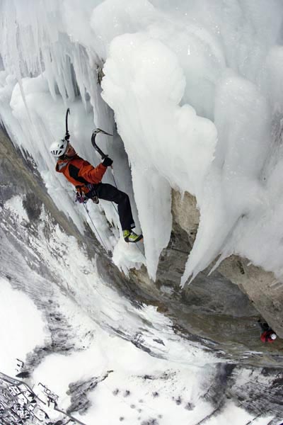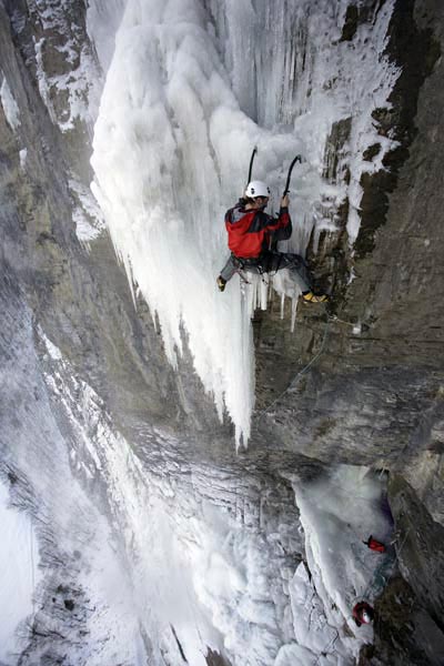 We had to cross barriers with ban signs: no trespassing- Base jumping forbidden! With the light of our head lamps we climbed the ice and after 2ohours we already reached the mixed parts when suddenly the exit icicle in the size of a truck passed us. It felt as if the whole waterfall was collapsing at once. We reached the last pitch this day but without ice this was a dead end road. Our rappel down nourished the rumors in Lauterbrunnen from where one could see the flashing lights of our headlamps. When we returned with the photographer Klaus Fengler and having climbed for the shout all Great pitches it was only that dammed last one missing- the ice was wet- I had to do it and only wanted to climb these few last meters up this icicle and than down again to the belay- Markus lowered me down and as I reached the Band the icicle hit it the same moment just beside me. It’s a wonder I’m still alive and a clear sign that we spent too much time in this Ban zone.