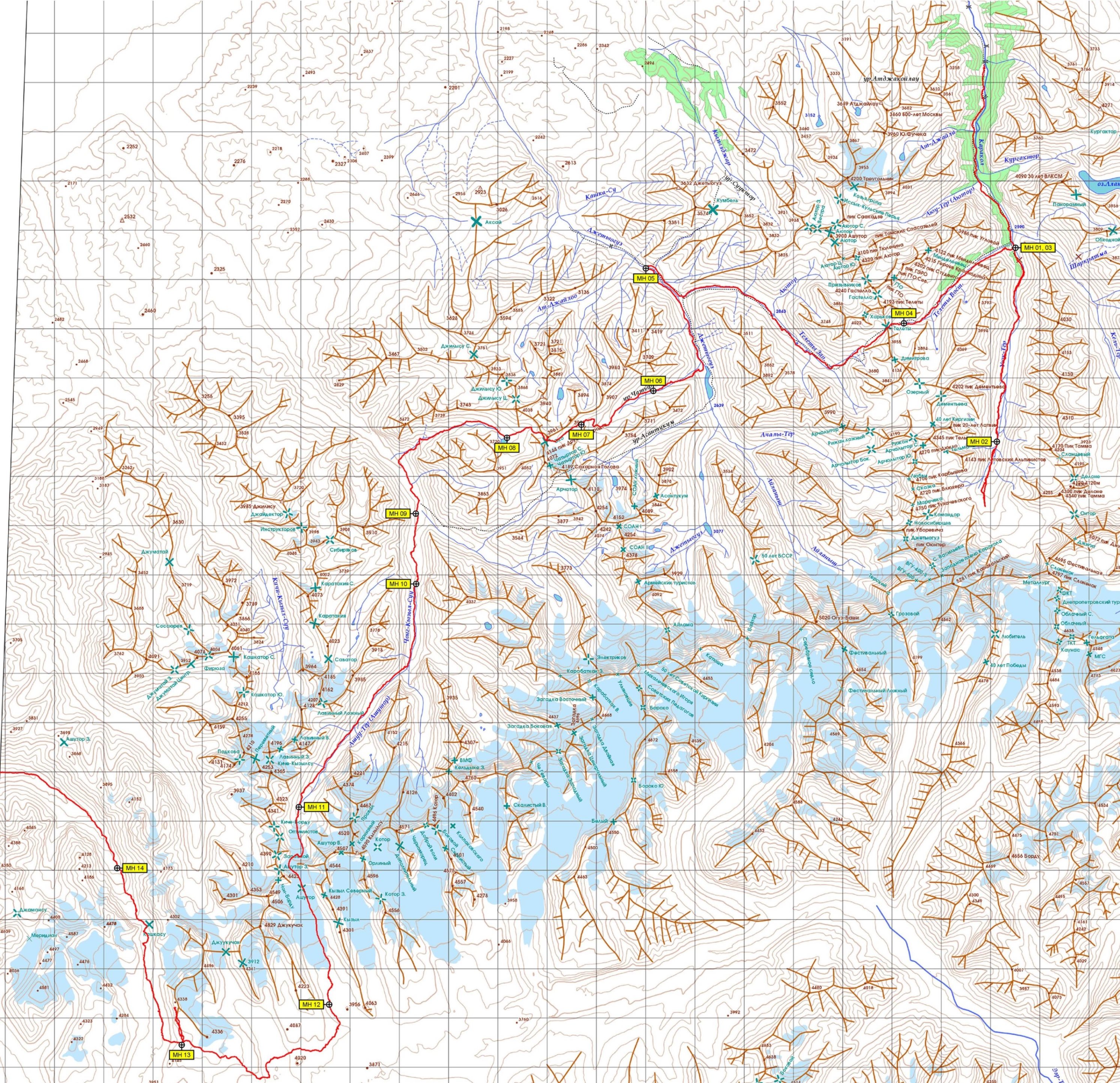 Каракол – а/л «Каракол» – радиальный выход на ледник Онтор – пер. Телеты (1А, 3785) – р. Телеты Зап. – р. Джеты-Огуз – пер. Эхо (1А, 3915)– радиальный подъем на обзорную вершину 3974 (н/к) – р. Шатылы – р. Чон-Кызыл-Су – ФГС – лед. Ашутор Сев. – пер. Ашутор (1Б, 4165) – лед. Ашутор Юж. – р. Арабель – пер 3986 (н/к) – в. Марс (1А, 4344) – пер. Кашкасу (1А, 3862) – слияние рек Джууку и Джуукучак