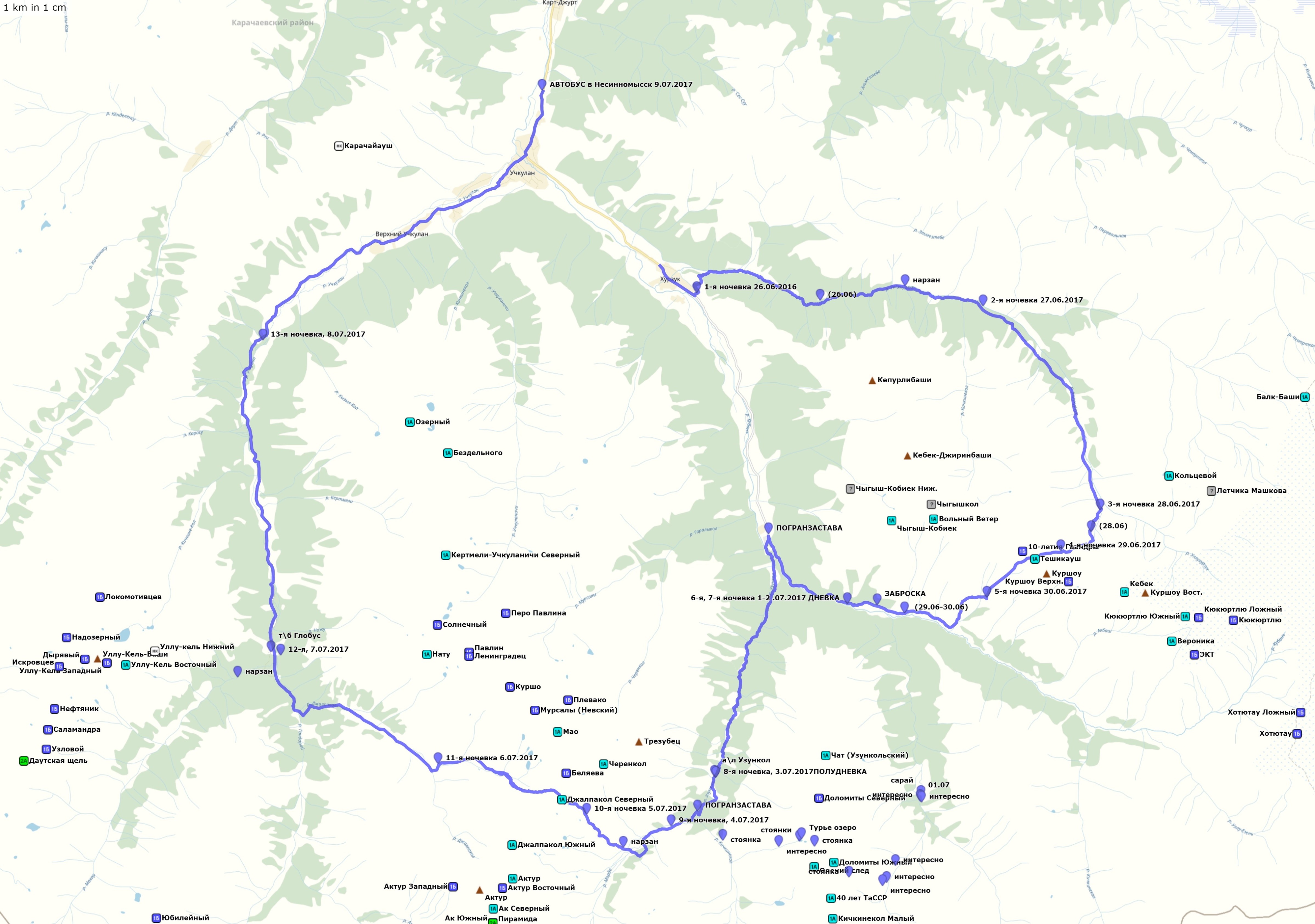 Смысловая идея похода. Смысловая идея похода заключалась в желании показать юным горным туристам настоящие горы, ведь до этого они были только в Калужской и Брянской области, а теперь они могут сказать, что видели Эльбрус. Запасные варианты. Аварийные варианты Запасные варианты движения предусматривали в первую очередь изменение пешеходной части с исключением перевала Доломиты Южный и выход к перевалу Джалпакол Северный через ущелье Узункол. Что собственно мы и сделали. Аварийные варианты предусматривали выход по долинам рек Уллухурзук, Узункол, Учкулан, в долину Кубани с последующим движением в сторону Карачаевска, Черкесска и Невинномысска. Подготовка к походу проходила в течение 2 лет в рамках первенства по туризму г. Москвы среди учащихся и оказалось вполне достаточной. Выражаем благодарность за консультации Мартынову В.В.. и Александрову Н.В., Щербина А.В. Список сокращений Направление движения группы, кроме особо оговоренных в тексте случаев, дается орографически. Расстояние определялось по показаниям прибора GPS «Garmin Montama 650», высотные характеристики указаны также по показания навигатора с учетом классификатора перевалов и топографических карт, при определении перепада высот мы пользовались показаниями GPS. ЧХВ — чистое ходовое время, т.е. время непрерывного движения град. — градус гор. — гора ст. – станция г. — город ф. — фото пер. — перевал руч. — ручей р. — река Юж. — Южный Сев. — Северный Зап. — Западный Вост. — Восточный 11. Описание маршрута. Хронометраж. Прибытков Кирилл. Навигация. Коркишко Даниил. Дневник Андреянова Дарья. 26.06-27.06 1-я Ночёвка - Река Кубань п.Хурхук. 15:45 1480 м N 43*25.313' E 042*09.341' Наш поезд Москва-Невинномысск №034СА скорый прибыл в Невинномысск практически ночью в 2-35 26 июня 2017 г. Ехать в Черкесск и далее в Хурзук смысла нет - рано. Погранслужба и ПСС работают с 9-ти утра. Поэтому еще в Москве мы сначала нашли в интернете адреса и телефоны школ Невинномысска и созвонились с руководством ближайшей к ж\д вокзалу школой №5. Пять часов, проведенные в школе использовали с пользой - спали, готовили заброску, перебирали продукты. Часть лишних вещей и продуктов договорились оставить в школе и забрать через две недели, так как уезжать должны будем отсюда же. В 8-00 утра приехал наш водитель на микроавтобусе с автоприцепом. В Черкесске, пропуска, заказанные заранее, ждать долго не пришлось - минут 15-20 от силы и это нас вдохновило и обрадовало. Заехали в ПСС, отметились, узнали прогноз погоды и поехали дальше в Хурзук. В Хурзуке стали лагерем на берегу пруда и с нашем же водителем отправились оставлять заброску. На заставе пограничников в Актюбе около 30 минут потратили на проверку документов и регистрацию. Погранцы сказали, что мы на своем Форде не проедем ни в Узункол, ни к Ворошиловским кошам и порекомендовали нам местного фермера с Уазиком. Долго ждали его. Затем долго развозили две заброски. Одна к слиянию Кубани и Чиринкола, вторую в, а\л Узункол. По пути наш Уазик чуть не улетел в реку вместе с нами, т.к. выяснилось, что у нашего Уазика нет тормозов. В результате вернулись в Хурзук поздно и, выходить на маршрут решено было на следующий день.