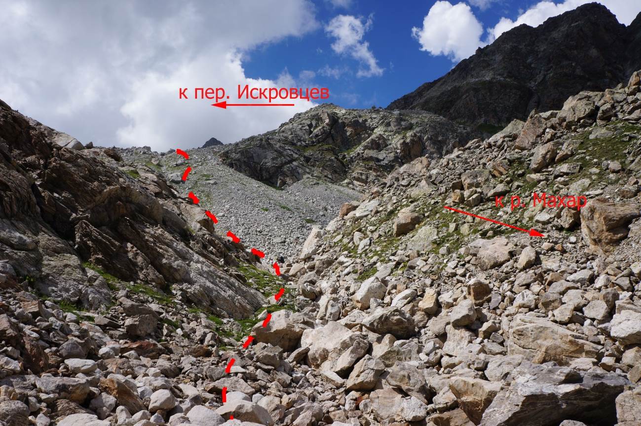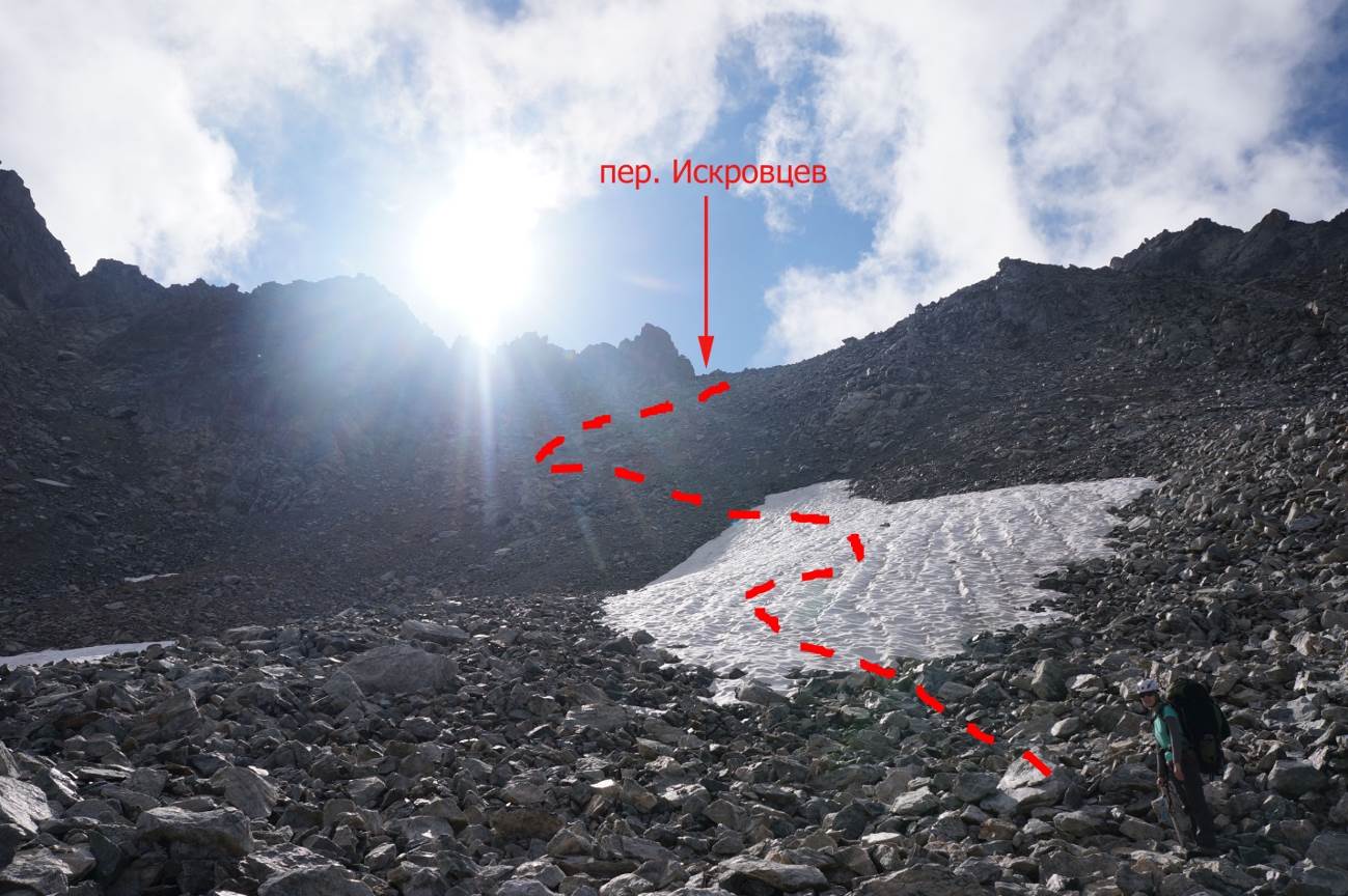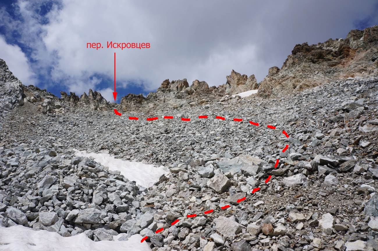 Перевал Искровцев расположен в Даутском хребте, к югу от в. Рынджи-Аге. Соединяет долины р. Искровцев (р. Даут) и Трехозерной (р. Махар). Ведёт от оз. Искровцев к северному истоку р. Трехозерной, ориентация склонов З-В. Седловина широкая. Тур расположен в северной части. На подъем и спуск представляет собой крупную и среднюю подвижную осыпь крутизной до 30°. Перевал пройден группой в направлении З-В 10 августа 2017 г. Снята записка группы т/к «Крокус», г. Краснодар, рук. Фолина И.В. от 31.07.2017 г. Описание дается от спуска из ур. Джугу-Турлучат. По правому берегу р. Даут подниматься по долине. Тропа идет вдоль реки и выводит к слиянию р. Даут и р. Рынджи, 2 часа 30 минут. Можно найти места для стоянки (МН№4 N43 19.121 E41 52.876, 2410 м.) Продолжить движение по правому берегу р. Даут, подняться на травяную ступень долины, 30 мин. (Фото. 10) Дойти до ручья стекающего с перевала Искровцев, правый приток реки Даут. Подняться по травянистому склону время от времени меняя направление движения, держась правого берега ручья, в висячую каменную долину р.Даут, 1 час 30 мин. Пройти по дну каменной долины и подняться на скальную ступень (Фото. 11), 1 час. Перед моренными валами, ведущими к перевалу, есть место для стоянки (МН№5, N43 18.931 E41 54.500, 3500м). Далее двигаться по моренным грядам до перевального взлета (Фото. 12), 1 час. Перевальный взлет представляет собой крупную и среднюю подвижную осыпь, со снежником в нижней части. Подниматься на перевал плотной группой, в касках, самостраховка ледорубом. Сначала по снежнику, потом по осыпному склону к правому плечу перевала (налево-вверх по ходу движения) подойти под крупные скалы. Далее держа направление на центр перевала, идя направо вверх по ходу движения, выйти на перевал, 1 час 45 минут. Группа поднялась на перевал в 10:30. Седловина широкая, тур расположен в северной части. Спуска с перевала (Фото. 13) представляет собой подвижную осыпь крутизной до 30°. Спуск производить плотной группой, самостраховка ледорубом, сначала траверсом вниз влево обойдя особо подвижный склон, потом вниз право на закрытый ледник Трехозерный. (Фото. 14) По закрытому леднику вниз время от времени меняя направление спуститься на дно долины. По дну долины дойти до начала травянисто осыпного склона (Фото. 15), 1 час от перевала. В левой части склона начинается спуск, превращающийся в тропу. По тропе спуститься до конца склона и по дну долины выйти к Северному Трехозерному озеру, 1 час. На расстоянии 40м от озера на левом берегу ручья есть стоянки. Далее траверсом левого берега озера выйти на травянистый слон на левом берегу ручья. Спускаясь по склону, подсечь коровью тропу, забирающую траверсом налево. По ней идти пока она не потеряется, далее по травянистому склону спуститься вниз до р. Трехозерная, 40 минут. Следуя по левому берегу реки выйти на тропу. Тропа разветвляется и может уйти на плечо долины, нужно держаться ближе к реке и дойти до зоны леса. Минуя лес выйти к кошу (Фото. 16), 40 минут, от которого начинается конная тропа до р. Махар. По тропе спуститься до р. Махар и выйти на грунтовую автомобильную дорогу, 1 час. По дороге идти вниз по долине, дойти сначала до погранпоста (есть стоянка в 300 метрах ниже погранпоста, в лесу, слева от дороги, МН№6 N43 18.215 E41 58.041, 1860 м.), а затем до тур. базы Глобус. 1 час 30 минут. Расчет ходового времени
