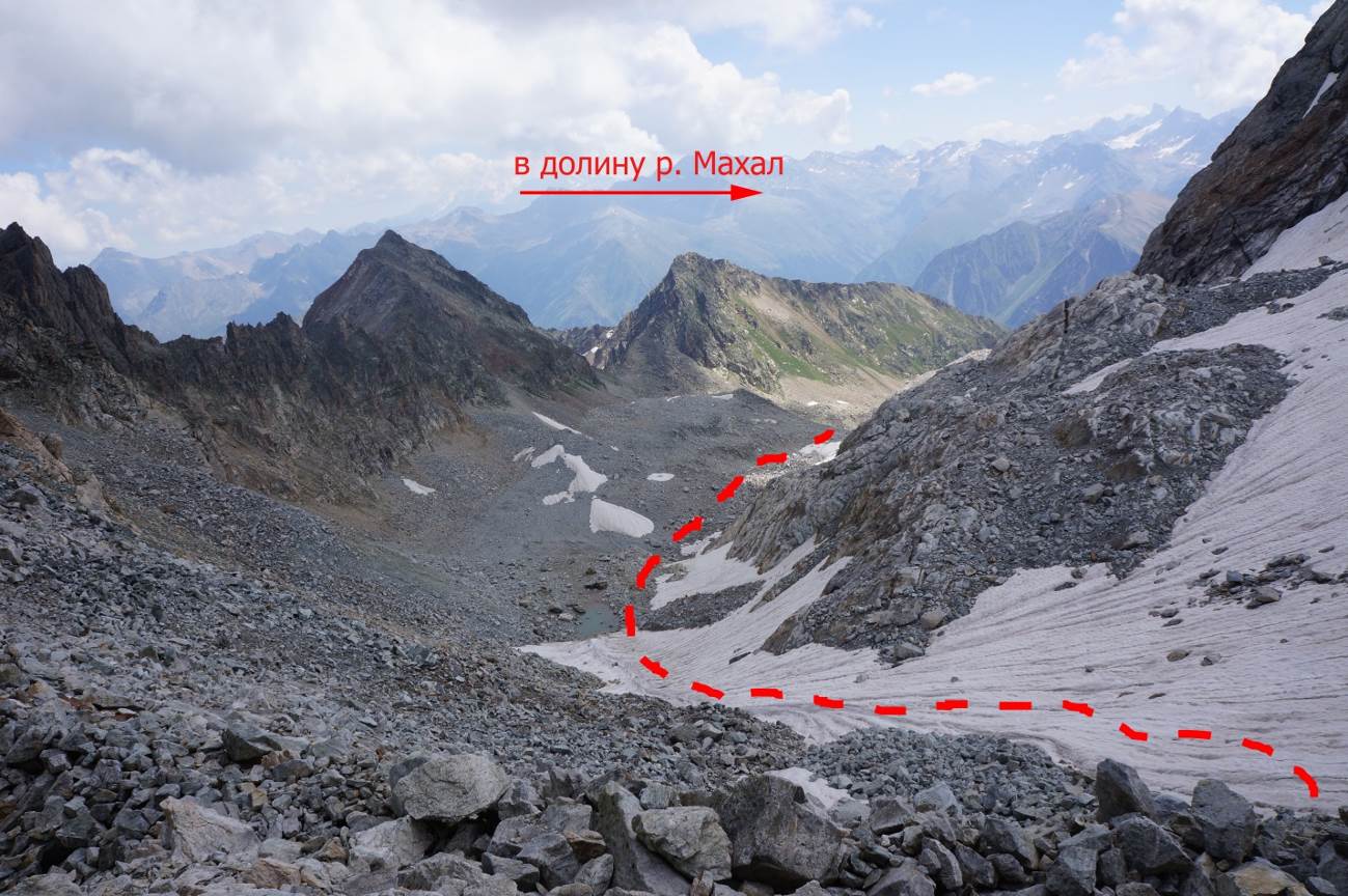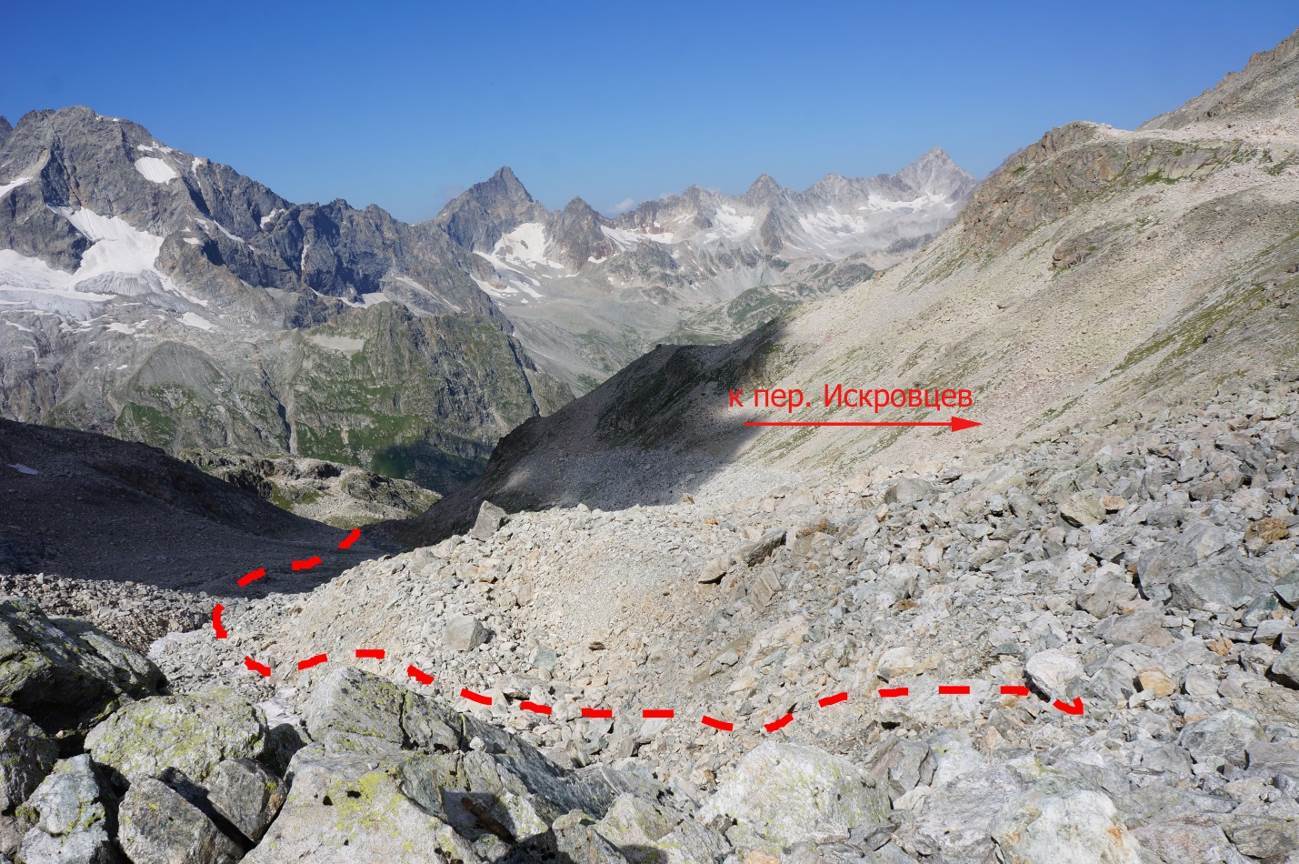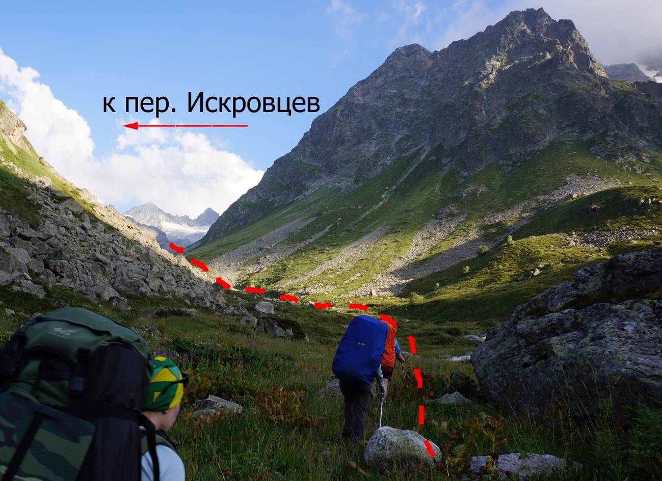 Перевал Искровцев расположен в Даутском хребте, к югу от в. Рынджи-Аге. Соединяет долины р. Искровцев (р. Даут) и Трехозерной (р. Махар). Ведёт от оз. Искровцев к северному истоку р. Трехозерной, ориентация склонов З-В. Седловина широкая. Тур расположен в северной части. На подъем и спуск представляет собой крупную и среднюю подвижную осыпь крутизной до 30°. Перевал пройден группой в направлении З-В 10 августа 2017 г. Снята записка группы т/к «Крокус», г. Краснодар, рук. Фолина И.В. от 31.07.2017 г. Описание дается от спуска из ур. Джугу-Турлучат. По правому берегу р. Даут подниматься по долине. Тропа идет вдоль реки и выводит к слиянию р. Даут и р. Рынджи, 2 часа 30 минут. Можно найти места для стоянки (МН№4 N43 19.121 E41 52.876, 2410 м.) Продолжить движение по правому берегу р. Даут, подняться на травяную ступень долины, 30 мин. (Фото. 10) Дойти до ручья стекающего с перевала Искровцев, правый приток реки Даут. Подняться по травянистому склону время от времени меняя направление движения, держась правого берега ручья, в висячую каменную долину р.Даут, 1 час 30 мин. Пройти по дну каменной долины и подняться на скальную ступень (Фото. 11), 1 час. Перед моренными валами, ведущими к перевалу, есть место для стоянки (МН№5, N43 18.931 E41 54.500, 3500м). Далее двигаться по моренным грядам до перевального взлета (Фото. 12), 1 час. Перевальный взлет представляет собой крупную и среднюю подвижную осыпь, со снежником в нижней части. Подниматься на перевал плотной группой, в касках, самостраховка ледорубом. Сначала по снежнику, потом по осыпному склону к правому плечу перевала (налево-вверх по ходу движения) подойти под крупные скалы. Далее держа направление на центр перевала, идя направо вверх по ходу движения, выйти на перевал, 1 час 45 минут. Группа поднялась на перевал в 10:30. Седловина широкая, тур расположен в северной части. Спуска с перевала (Фото. 13) представляет собой подвижную осыпь крутизной до 30°. Спуск производить плотной группой, самостраховка ледорубом, сначала траверсом вниз влево обойдя особо подвижный склон, потом вниз право на закрытый ледник Трехозерный. (Фото. 14) По закрытому леднику вниз время от времени меняя направление спуститься на дно долины. По дну долины дойти до начала травянисто осыпного склона (Фото. 15), 1 час от перевала. В левой части склона начинается спуск, превращающийся в тропу. По тропе спуститься до конца склона и по дну долины выйти к Северному Трехозерному озеру, 1 час. На расстоянии 40м от озера на левом берегу ручья есть стоянки. Далее траверсом левого берега озера выйти на травянистый слон на левом берегу ручья. Спускаясь по склону, подсечь коровью тропу, забирающую траверсом налево. По ней идти пока она не потеряется, далее по травянистому склону спуститься вниз до р. Трехозерная, 40 минут. Следуя по левому берегу реки выйти на тропу. Тропа разветвляется и может уйти на плечо долины, нужно держаться ближе к реке и дойти до зоны леса. Минуя лес выйти к кошу (Фото. 16), 40 минут, от которого начинается конная тропа до р. Махар. По тропе спуститься до р. Махар и выйти на грунтовую автомобильную дорогу, 1 час. По дороге идти вниз по долине, дойти сначала до погранпоста (есть стоянка в 300 метрах ниже погранпоста, в лесу, слева от дороги, МН№6 N43 18.215 E41 58.041, 1860 м.), а затем до тур. базы Глобус. 1 час 30 минут. Расчет ходового времени