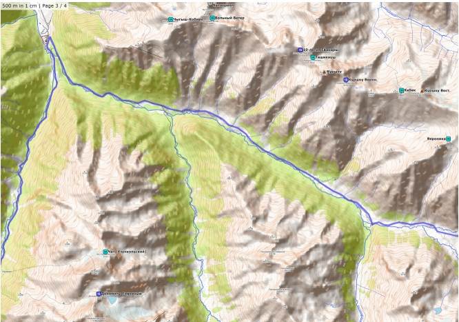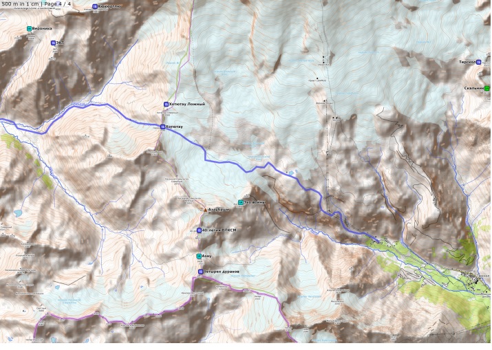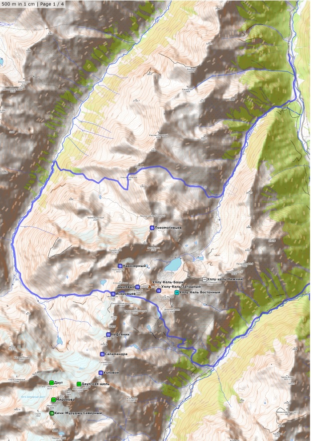 Идея, организация Основной идеей похода, проходившего в рамках школы БУ туристского клуба ФСТ-ОТМ, было посмотреть долину реки Даут, западные отроги Эльбруса и освоить базовые приемы передвижения по горам. Основными задачами были: пройти квалификационный поход 2 к. с., провести технические занятия на различных видах горного рельефа. Разработанный маршрут делился на три линейных части, с промежуточной заброской продуктов. Первая часть включала в себя 2 перевала, обеспечивала акклиматизацию для дальнейшего преодоления более сложных препятствий и включала занятия по передвижению по травянистым и осыпным склонам. Вторая линейная часть предполагала получение опыта хождения на вершины и преодоление ледников. Третья часть представляла собой подход под главную достопримечательность района г. Эльбрус и прохождения по его южному леднику Большой Азау. Заявленная нитка маршрута: Мин. Воды – р. Кичкеникол – пер. Учкулан Южный (1А, 3250м) – д.р. Даут – пер. Искровцев (1Б, 3400м) – пер. Дырявый (1Б, 3300м) – оз. Уллукёль – пер. Уллукёль В. (1А, 2986м) – р. Махар – тур. База Глобус – р. Гонадарай – р. Джалпакол – пер. Беляева (1Б, 3450 м) – в. Узловая (1А, 3660м, радиально) – альп. Лагерь Узункол – пер. Доломиты Северные (1Б, 3450 м) – в. Чатбаши (1А, 3766м, радиально) – р. Чиренкол – р. Кубань – р. Уллу-Кам – пер. Хотютау (1Б, 3530м) – Эльбрусское озеро – пос. Терскол Пройденная нитка маршрута: Мин. Воды – р. Кичкеникол – пер. Учкулан Южный (1А, 3250м) – д.р. Даут – пер. Искровцев (1Б, 3325м) – р. Махар – тур. База Глобус – р. Гонадарай – р. Джалпакол – пер. Беляева (1Б, 3485 м) – в. Узловая (1А, 3650м, радиально) – альп. Лагерь Узункол – р. Узункол – р. Кубань – р. Уллу-Кам – пер. Хотютау (1Б, 3495м) – Эльбрусское озеро – пос. Терскол Причины отклонения от маршрута: 1. Отказ от прохождения пер. Дырявый и пер. Уллукёль Восточный, в связи с камнеопасным путем подъема на момент нахождения у перевала, а так же плохим самочувствием двух участниц, последнее вынудило сбавить темп движения на маршруте. Обходной путь к р. Махар был осуществлен в рамках заявленного запасного варианта. 2. Отказ от прохождения пер. Доломиты Северные связан с плохой погодой и грозовым прогнозом, а так же плохим самочувствием двух участниц. Обходной путь по долинам рек Узункол и Кубань был осуществлен в рамках заявленного запасного варианта. Определяющие препятствия маршрута