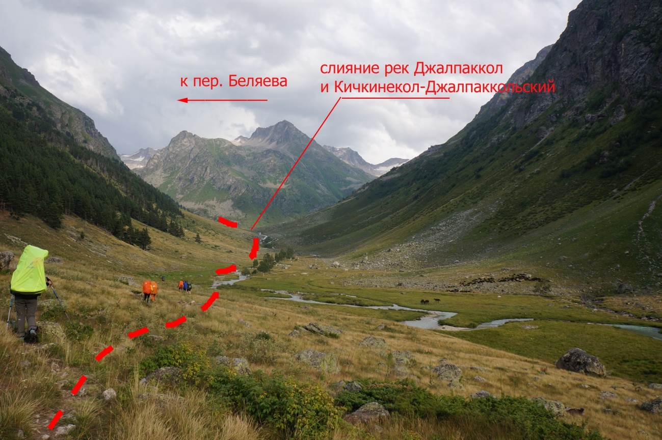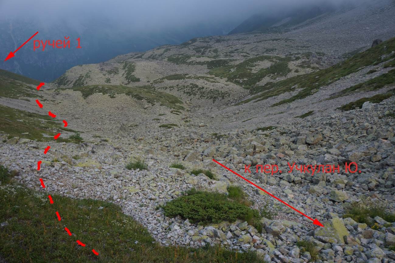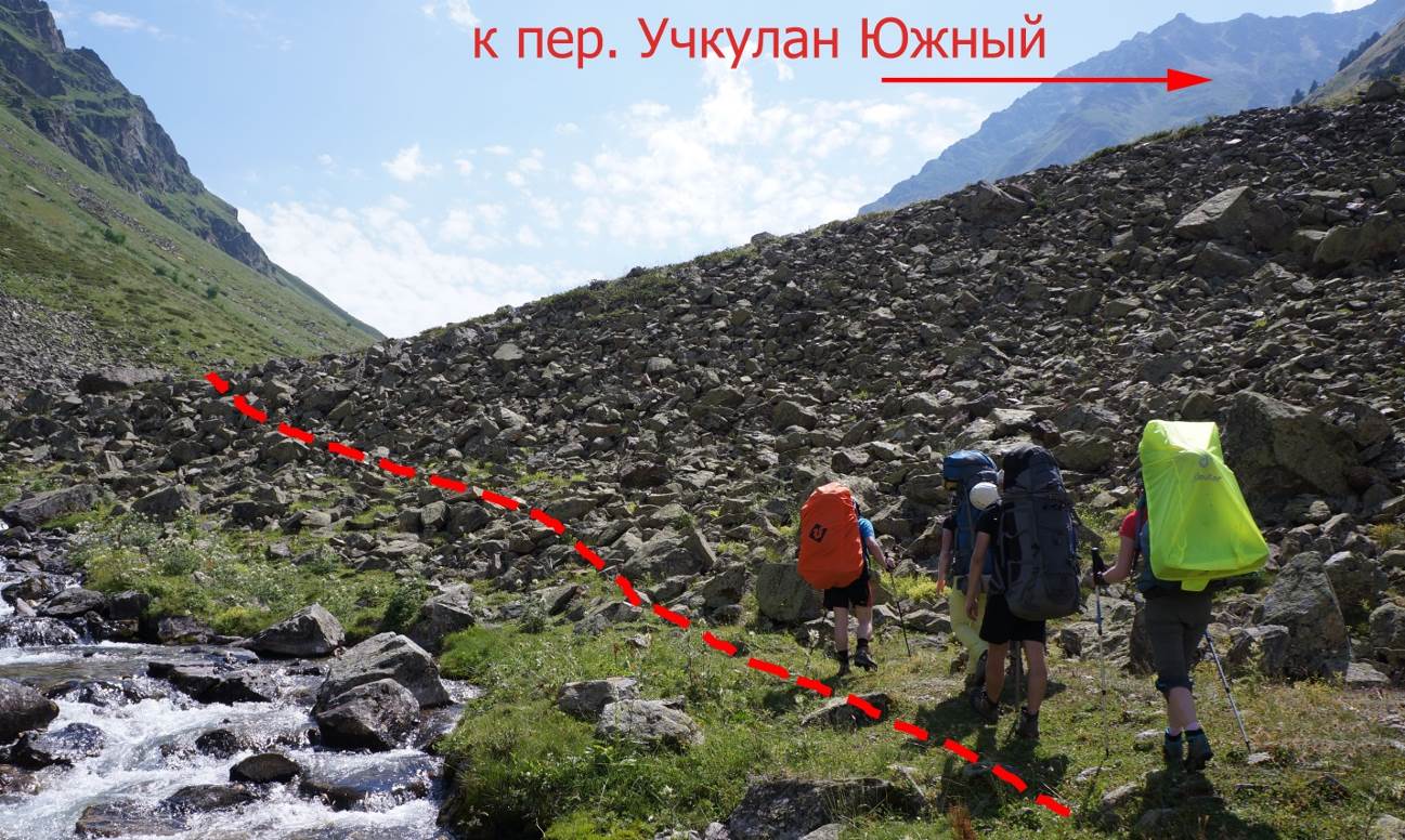 Техническое описание маршрута Заезды, подходы.Заезд осуществлялся через г. Минеральный Воды, куда группа прибыла рейсом авиакомпании «S7». Далее на микроавтобусе добирались до начала маршрута в д.р. Учкулан мост через р. Учкулан близь реки Кичкинакол. Переночевали на ближайших к мосту ночевках. (МН1, координаты N43 23.001 E41 59.413) Утром начали движение по маршруту. На Кавказе группа пользовалась услугами туристической компании «Тау Сервис». Была организована встреча в аэропорту Минеральные Воды, переезд до д.р. Учкулан, постановка забросок в турбазе Глобус и в а/л Узункол, забор газа из магазина в г. Пятигорск. В отчёте указывается ЧХВ (Чистое ходовое время), то есть время отдыха не учитывается (если не указано иное). 5 августа приехали к мосту через р. Узункол в сумерках. Прошли 10 минут по левому берегу р. Узункол в сторону р. Кичкинакол, пересекли ручей стекающий с борта долины и встали на ночлег на берегу ручья. Перевал Учкулан Южный (1А, 3250 м)
