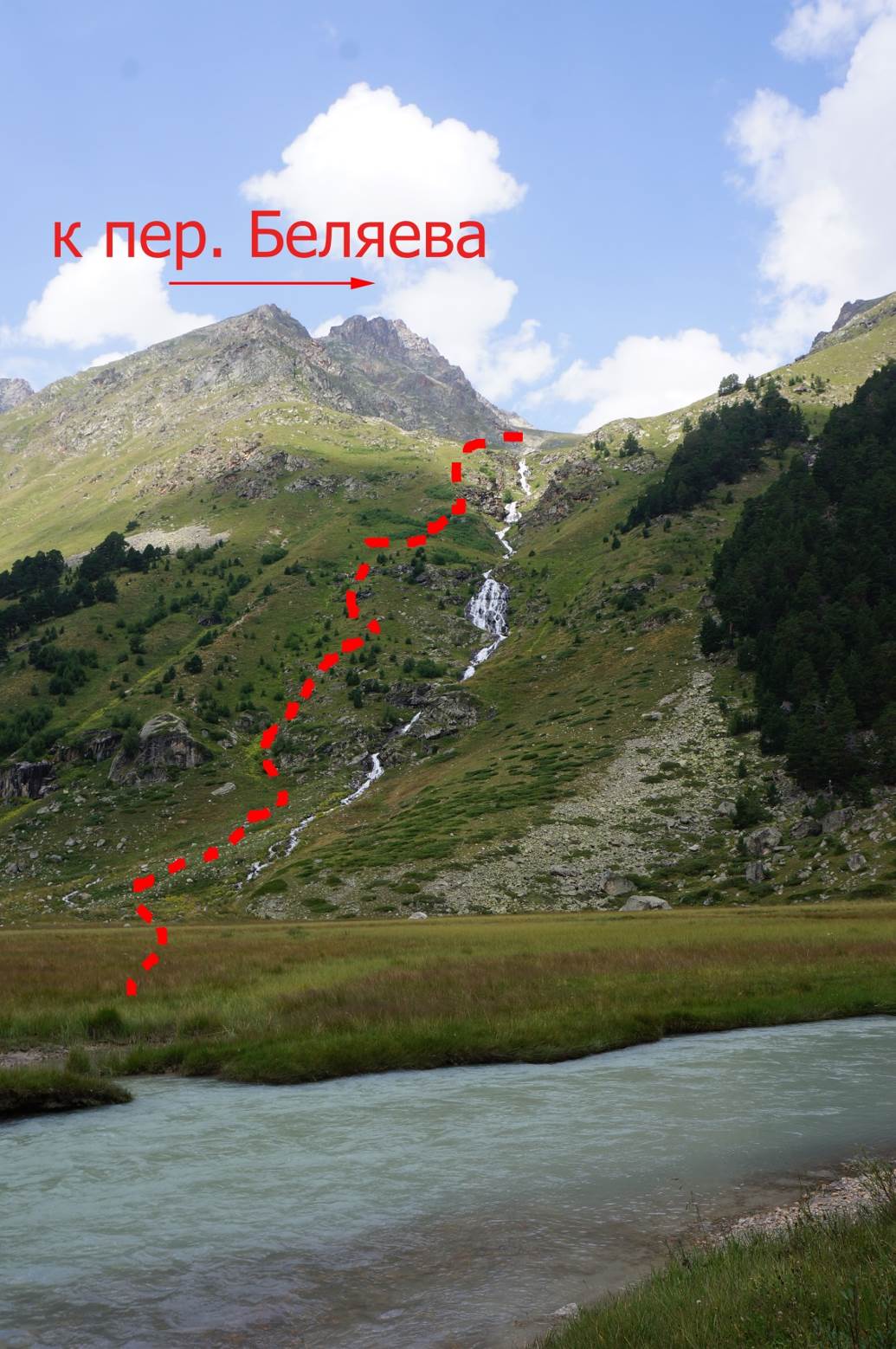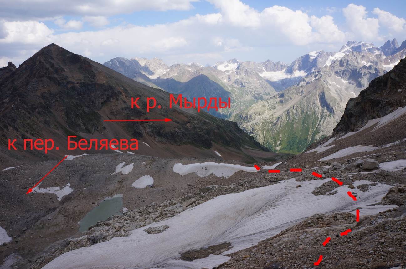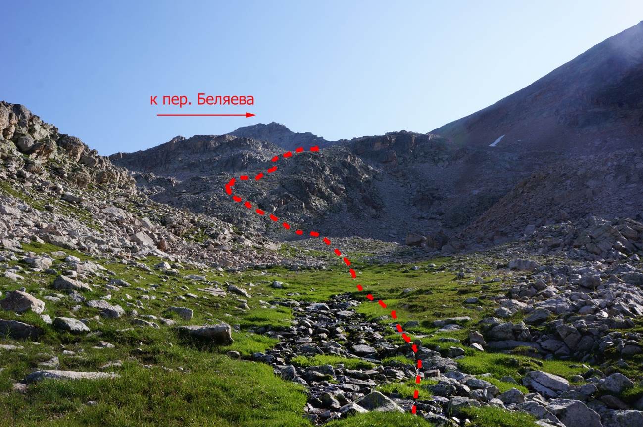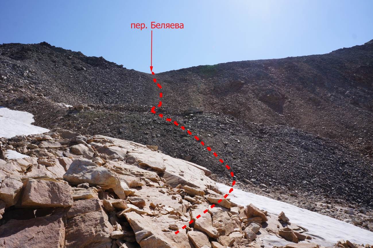 Перевал Беляева соединяет долины рек Джалпаккол и Мырды. Обе стороны перевала представляют собой осыпной склон, седловина – широкое плато, есть места под палатки. С восточной стороны спуск заканчивается закрытым ледником. Описание дается от т/б Глобус. Снята записка группы туристов из Москвы. Вершина Узловая (1А, 3650 м)