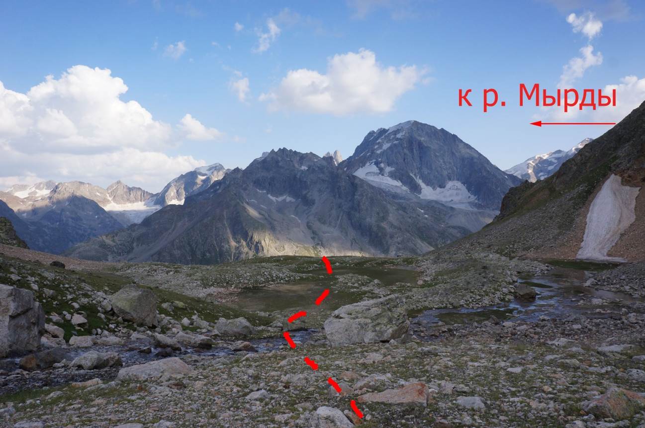 Вершина Узловая находится в северном отроге главного Кавказского хребта, севернее пер. Беляева. Подъем с пер. Беляева представляет собой скально-осыпной склон. Тур находится на вершине. Записки нет. Описание дается от пер. Беляева. От турбазы Глобус идти сначала по дороге под ЛЭП, 10 минут до моста через р. Махар. По мосту перейти через реку и далее идти по лесной дороге. На развилке в лесу выбрать правую дорогу, левая – ведет на турбазу. Идти до мостов через р. Гондарай, 40 мин от турбазы Глобус. Перейти через первый мост (фото 17.) и идти мимо коша к проторенной тракторной дороге (фото 18.), где начинается подъем в долину р. Джалпаккол. По тракторной дороге зайти в долину реки Джалпаккол, 1 час до моста на правый берег реки, продолжить движение по дороге. Через 2 км дорога начнет уходить на борт долины, с этого места уже будет виден кош. Свернуть на тропу в сторону коша и, пройдя мимо коша, по дну долины двигаться вдоль реки. В 200 м от коша, у дальнего мостика на левый берег реки, есть места для стоянок (МН№7, N43 17.803 E42 02.809, 2190м), 1 час от моста. Двигаться по дну долины до слияния рек Джалпаккол и Кичкинекол-Джалпаккольский (Фото 19.). Зайти в долину реки Кичкинекол-Джалпаккольский тут высокая трава и тропу можно найти ближе к правому борту долины. По тропе подняться на травяную ступень долины (Фото 20.) и выйти в цирк пер. Беляева и пер. Джалпаккол, 3 часа от МН№7. (Фото 21.) В цирке есть хорошие места для стоянки. Подняться вдоль ручья, стекающего с правого борта цирка, (Фото 22.) на каменную ступень долины и выйти к озеру под. Пер. Беляева, 1 час. Тут множество мест под палатки (МН№8, N43 17.174 E42 05.980, 3050 м). Перевал от озера не видно его загораживает каменная гряда, поэтому траверсом от озера на юг зайти в цирк перевала, пройти по дну цирка до центральной морены (Фото 23.), 1 час 15 минут от МН№8. Подняться по центральной морене и подойти под перевальный взлет, 1 час. Перевальный взлет (Фото 24.) пер. Беляева с западной стороны осыпной. Плотной группой, время от времени меняя направление движения, подняться на перевал Беляева, 25 минут. Группа поднялась на перевал в 10:20 со стороны р. Джалпаккол, снята записка группы туристов из г. Москва. Спуск с пер. Беляева представляет собой скально-осыпной склон крутизной до 40°. (Фото 25.) По перилам спуститься на открытый ледник под перевалом. Ледник пологий, открытый, трещины просматриваются, передвижение в кошках. Придерживаясь левой части ледника, выйти на скалы и спуститься вниз, забирая к правой части долины. По моренным валам (Фото 26.) выйти к конгломерату и спуститься по склону придерживаясь правой части к площадкам «Футбольные поля» (Фото 27.), тут много мест для ночевок (МН№9 N43 16.766 E42 07.817.), 3 ч от перевала. Далее спуск проходит по травянистому склону, постепенно появляется тропа, которая, петляя, выводит к разливам р. Мырды (Фото 28.), 2 ч от МН№9. Через реку есть пешеходный мост к кошу на правом берегу, откуда начинается тропа, ведущая вниз. Постепенно тропа переходит в грунтовую дорогу и через 1 час 30 минут приводит к а/л Узункол. Там есть платные места под палатки и горячий душ. Стоит 300 р/чел/сут. Далее спуститься по дороге до слияния рек Кубань и Узункол, около 2,5 ч. от а/л Узункол. Вершина УзловаяПодъем на в. Узловая начинается с перевала Беляева (Фото 29.) Движение вдоль гребня сначала слева от гребня, обходя первые жандармы по осыпям. Далее идти по гребню.