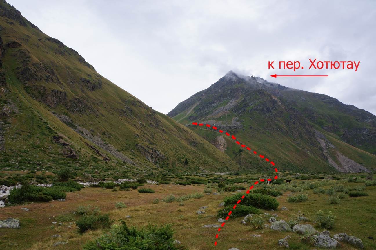 Перевал Хотютау соединяет долину реки Кубань и лед. Азау Большой, пройден группой 17 августа 2017 г. в направлении З-В. С запада склон осыпной, крутизной до 30°, с востока осыпной склон крутизной до 25°, спускающийся на ледник Азау Большой. Тур в центральной части седловины. Снята записка группы туристов турклуба «Ветер» РГАУ-МСХА, г. Москвы и горного клуба «Пилигрим» г. Брянск под руководством Примакова А.П. в кол-ве 13 чевлоек от 13.08.2017. От слияния рек Кубань и Узункол по грунтовой дороге вдоль р. Кубань дойти до Ворошиловских кошей, 5 часов. Пройти дальше по дороге мимо слияния р. Уллу-Езень и р. Уллу-Кам. Перейти на левый берег р. Уллу-Кам по мосту и двигаться по тропе вдоль р. Уллу-Кам. Среди кустов можжевельника есть места для ночевки. (МН№11 N43 17.719 E42 21.221, 2390м) Тропа идет по левому берегу р. Уллу-Кам и серпантином поднимается на крутой взлет на левом берегу ущелья. (Фото 30.) Выйти на выполаживание долины и траверсом левого берега без набора высоты пройти пологие травяные луга, 1 час 30 минут от МН№11. Долина к пер. Хотютау правая по ходу движения, тут есть места для ночевок. Зайти в долину и двигаться по правой стороне долины по тропе. На высоте 3090 м находятся верхние стоянки перед перевалом (МН№12, N43 17.907 E42 23.325, 3090м). Продолжая движение по тропе через осыпи, крутизной до 25°, дойти до перевального взлета и зайти на перевал, 2 ч. 30 мин. (Фото. 31) Седловина широкая, есть места под палатки. Группа (Фото. 32) вышла на перевал 17 августа 2017 года в 10:20 со стороны р. Уллу-Кам. Снята записка группы туристов турклуба «Ветер» РГАУ-МСХА, г. Москвы и горного клуба «Пилигрим» г. Брянск под руководством Примакова А.П. в кол-ве 13 человек от 13.08.2017. Спуск с перевала (Фото. 33) представляет собой осыпной склон крутизной до 25°. Тропа начинается в южной части перевала и выходит на ледник. Далее по леднику (Фото. 34) в кошках в направлении сужения ледника на Ю-В. Приблизительный курс между пер. Эхо Войны и черными шлаковыми моренами слева по ходу. Далее через морену на В в сторону ледника Азау Малый. Ледник разорван. Выйти к моренам, разделяющим ледники малый и большой Азау. Пройти по моренам перпендикулярно леднику Большой Азау и подсечь тропу, идущую к Эльбрусскому озеру, 3 ч. (МН№13, N43 17.073 E42 26.755, 3270 м) По тропе, начинающейся от Ю-В края озера, выйти через морены к канатной дороге. Далее спускаться вдоль канатной дороги к поляне Азау, 1 ч 30 минут. Расчет ходового времени