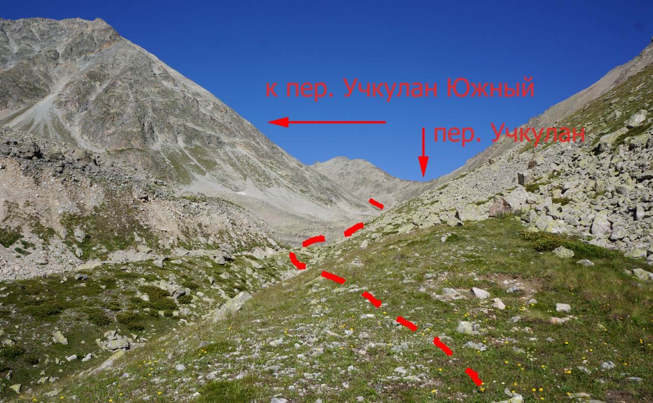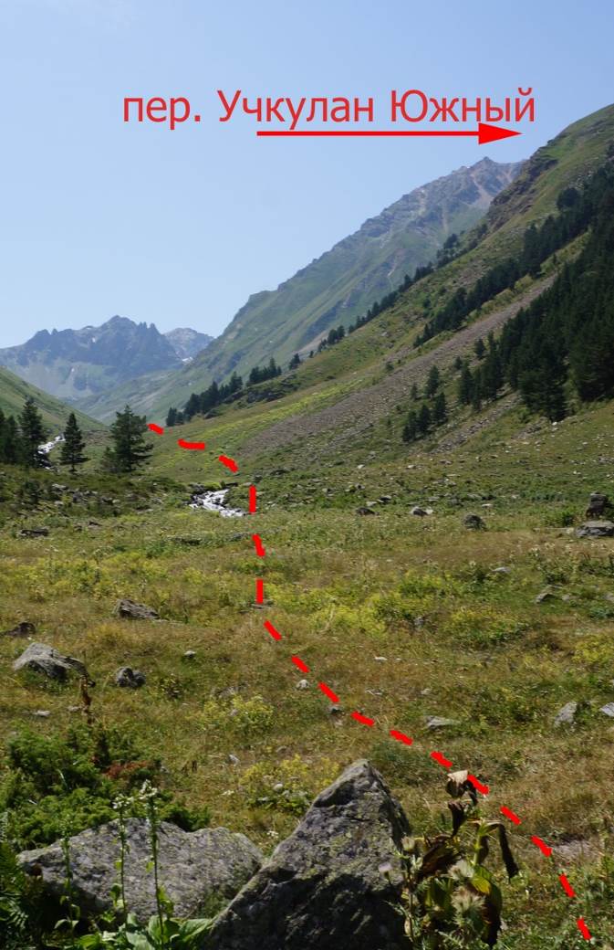Перевал Учкулан Южный - находится в Даутском хребте, разделяющим бассейны рек Даут и Учкулан, северней пер. Локомотивцев и ур. Джугу-Турлучат, является простым путем, позволяющим пройти из долины реки Кичкинакол в долину р. Даут. Перевал пройден группой в направлении СВ-ЮЗ 7 августа 2017 г. Снята записка группы г. Саратов рук. Мульдагалиев Т.И. от 10 июля 2016 г. Описание дается из долины р. Кичкинакол От моста через р. Учкулан, левым бортом долины, по проселочной дороге дойти до коша у р. Кичкинакол, левого притока р. Учкулан, 20 мин от моста. От края коша по набитой тропе подъем через еловый лес в висячую долину р. Кичкинакол, 2 часа. (Фото 1.) Выше границы леса путь выполаживается, тропа идет вдоль левого берега реки. Пройти мимо коша. Недалеко от коша есть удобные места под стоянки (N43 21.233 E41 58.095). Пройти осыпную ступень долины (Фото 2.), справа по ходу движения виден поворот в долину пер. Учкулан Южный, от коша 30 минут. С долины перевала стекает ручей. Сначала подниматься вдоль левого берега ручья, потом, подойдя к деревьям и крутому склону по правую руку, перейти на правый берег ручья и через поле подняться по склону в лоб до набитых коровьих троп, по ним траверсом зайти выше ручья минуя густую растительность вдоль русла. (Ручей уходит под камни, далее вода встречается только в двух местах до перевала.) Выйдя на центр долины подниматься по ее дну. Тропы нет. Через 1,5 часа выходим на первую ступень долины с характерной центральной мореной, поросшей можжевельником. (Фото 3.) На правом по ходу движения борту долины есть ручей, его слышно и видно густую растительность вокруг него, ручей исчезает в земле на середине склона. Подняться по правому борту долины по ходу движения выйти на вторую ступень, 30 минут. (Фото 4.) Тут есть места для стоянки (МН2, координаты N43 20.989 E41 56.756), но за водой придется ходить к ручью ниже, на левом борту долины (30 минут туда обратно). От МН по дну долины выйти в цирк перевала и подняться по левобережной морене. Справа от морены, по ходу движения, видны поля и возможные места для ночевок (возможные ночевки, координаты N43 21.119 E41 56.340, воды нет.) Далее мест для ночевок нет. Воду можно найти двигаясь выше по дну долины 100 м. Подняться на моренный вал забирая ближе к левому борту долины, отсюда хорошо видно весь цирк перевалов Учкулан и Учкулан Южный. (Фото 5.) По плато цирка подойти к перевальному взлету, 1 час от МН2. Далее плотной группой по осыпному склону, крутизной до 35°, периодически меняя направление подъема, подняться на узкую скальную седловину пер. Учкулан Южный, 2 часа. Тур находится по центру перевала. Группа поднялась на перевал в 15 часов 30 минут. Спуск с перевала представляет собой осыпной склон крутизной до 35°. С перевала начать спуск налево по среднему устоявшемуся курумнику (Фото 6.). Далее изменить направление движения и уйти вправо (Фото 7.). Спуск к реке с пер. Учкулан Южный заканчивается крутыми сбросами, ниже по долине есть выполаживающийся травянистый спуск к реке. (Фото 8.) У реки есть места под палатки, 2 часа от перевала (МН3, N43 20.924 E41 54.806, 2770м). Далее вдоль реки, сначала по заливным лугам, потом по руслу реки выйти к ур. Джугу-Турлучат. (Фото 9.) Уйти траверсом, постепенно сбрасывая высоту, на правый борт долины и подойти к зоне леса. (1 час от места ночевки) Идти вниз по долине вдоль леса, спускаясь в естественную луговую ложбинку. По её дну двигать