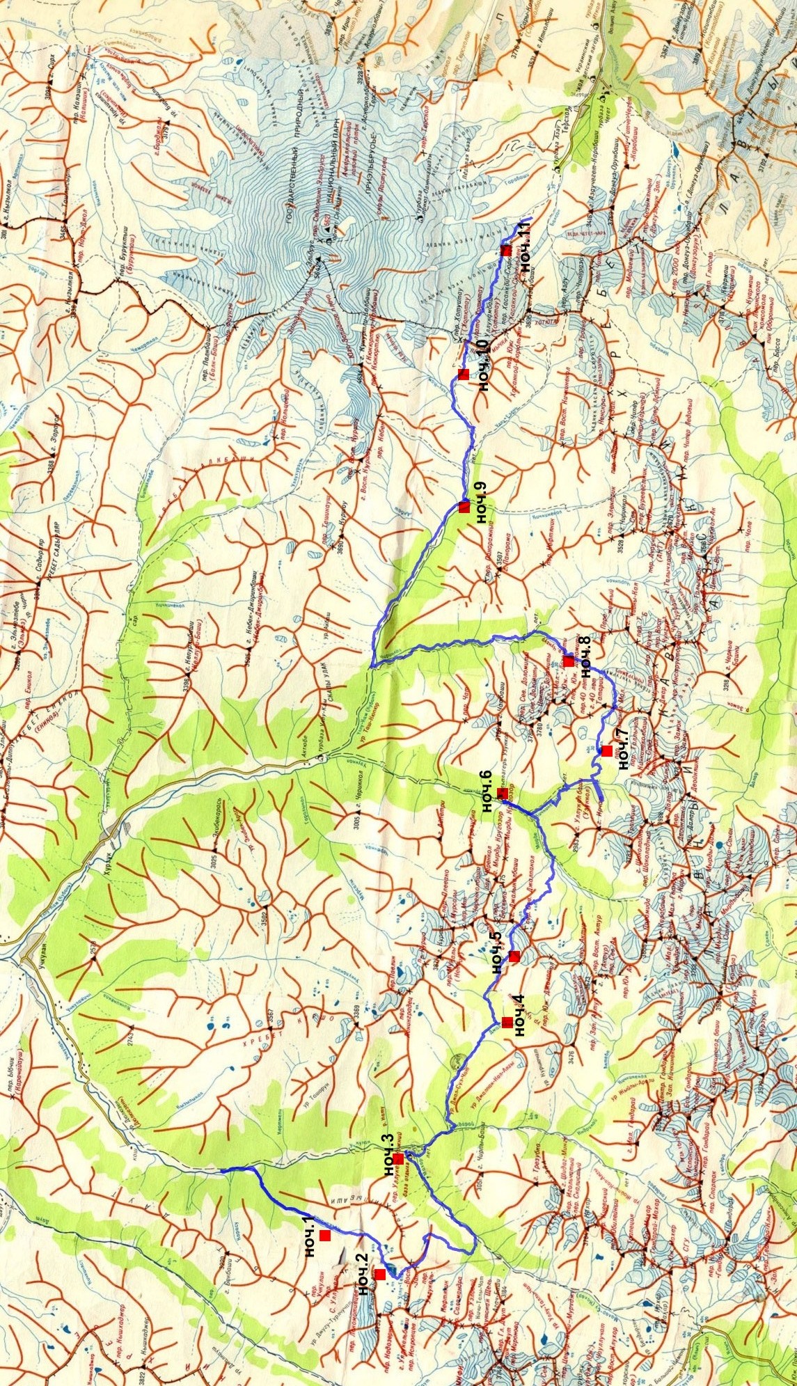 Вводная часть Общая смысловая идея похода Поход проходил в рамках УТП школы БУ т/к «Вестра». Основной целью было показать слушателям школы красоту первозданной природы, достопримечательности этого района: озера, водопады, реки, горные вершины, перевалы и хребты. В задачи входила техническая подготовка участников к походам более высоких категорий сложности, в том числе: - отработка технических приемов на горной местности - получение навыков по ориентированию в горной местности - знакомство с различными формами горного рельефа - научиться быстро ставить и собирать лагерь - получить навыки хождения по снегу, с «вырубанием» ступеней, по осыпным, травянистым и снежным склонам различной крутизны - научится групповому прохождению маршрута («взаимовыручка», «чувство локтя») - получение навыков по организации переправ через горные реки - получение навыков по обращению с ледорубом (движение «на три такта», «зарубание») - получение навыков по хождению в связках по открытым и закрытым ледникам - получение навыков по хождению в «кошках» Маршрут был составлен линейным, с разделением на три этапа. Две заброски существенно облегчили вес рюкзаков, и это дало новичкам возможность легче войти в ритм похода. Обзор района путешествия Из книги П.П. Захарова «Западный Кавказ. Узункол. 1999»: «С белоснежных склонов Эльбруса далеко на западе видна группа вершин, выделяющаяся на фоне неба, - это вершины Западного Кавказа, районов Домбай, Нахар и Гвандра... Почти прямолинейно, на протяжении сорока с небольшим километров, от перевала Азау до Клухорского перевала тянется участок Главного Кавказского хребта (ГКХ), относящийся к району Гвандры. Это самый близкий к Эльбрусу район с высшей точкой Гвандра Главная - 3983 метра над уровнем моря. Вершины этого района занимают всю восточную часть горного региона Карачаево-Черкессии, входящей в состав Ставропольского края России. Далее на запад этот район вплотную соприкасается с Тебердинским и Домбайским районами Западного Кавказа. В районе Эльбруса проходит восточная граница рассматриваемого региона Кавказа. Все реки этого участка ГКХ, стекающие на север, дают начало одной большой реке - Кубани. Собственно исток Кубани находится в верховьях ущелья Уллу-Кам, где на фирновых и ледовых склонах Уллу-Кам-баши рождается горная река Уллу-Кам. Вначале она течет с востока на запад, вбирая в себя воды небольшой, но полноводной реки Уллу-Озень, а из короткого и мрачного ущелья - воды Восточного Кичкинекола. Значительно ниже в него попадают воды реки Чирюкол, протекающей по одноименному, буйно заросшему и удивительно красивому в своей нижней части ущелью. А на развилке двух основных ущелий этой части района - Уллу-Кам и Узункол - с ними сливается река Узункол, которая образуется реками Мырды и Кичкинекол. Неподалеку от места слияния Уллу-Кама и Узункола в ущелье Уллу-Кам находится необычайное явление природы-каньон «окно». Воды реки Уллу-Кам, пробив многометровую толщу камня, проложили себе путь внизу ущелья, а на крыше «окна» растет лес, вьется туристская тропа. От развилки мощный поток поворачивает на север и течет к аулу Хурзук, где пополняется водами реки из длинного и пустынного ущелья Уллу-Хурзук. На стыке трех рек - Учкулан, Хурзук и Кубань - находится аул Учкулан. Отсюда и начинает свой путь река Кубань. А вот местные жи