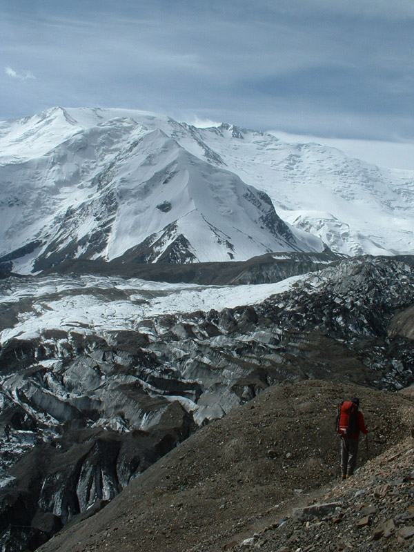 Ровно день мы идем до 1-го промежуточного лагеря, который находится на высоте 4200 м. Ставим палатки, готовим ужин, ночуем и с утра двигаемся дальше. Следующий промежуточный лагерь – на высоте 5300. Второй день работы дается труднее. Надо пройти часть ледника. Ледопад – классика ледового альпинизма. Нет ничего опаснее и труднее прохождения этого горного рельефа. Порою за весь маршрут не встретишь такого количества бездонных трещин, как здесь. И нет никакой уверенности, что в момент, когда идешь по нему, не появится еще одна (между твоей левой и правой ногой). Трещин немного, но их трудно распознать – замаскированы толщей снега. И приходится идти по тонким снежным мостикам, к тому же, это еще и вертикаль. Поэтому одеваем "кошки", связываемся веревкой и дальше двигаемся в связках, вкручивая для страховки ледобуры.