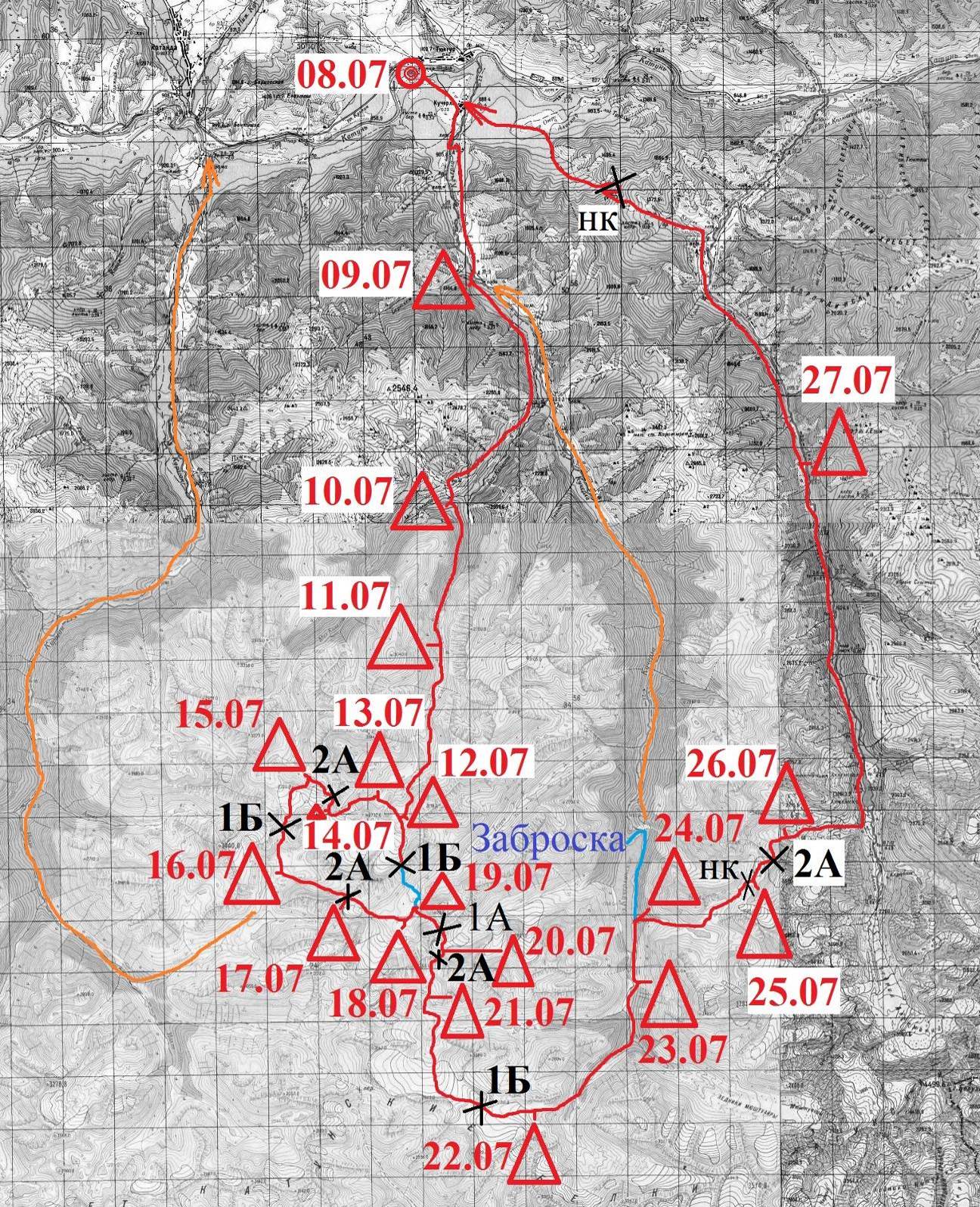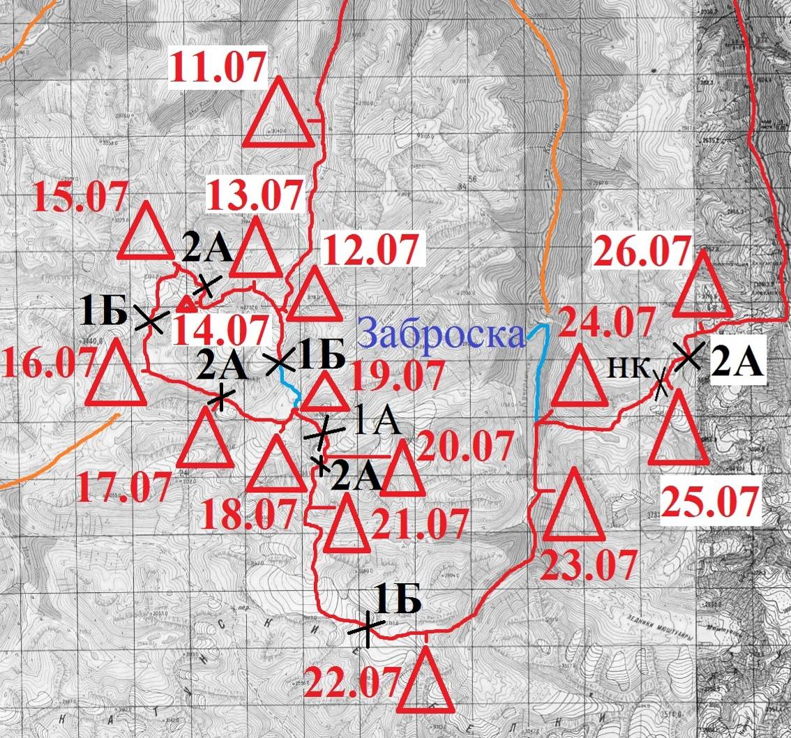 **При радиальных выходах километраж учитывается при движении лишь в одну сторону. В таблице в скобках указан зачётный километраж, без учёта повторно пройденного пути. При этом перепад высот, преодолённый на радиальных выходах, учитывается полностью. План похода на карте Обзорная карта маршрута. Старт 09.07 и финиш 28.07 в пос. Тюнгур на турбазе «Тюнгур». Подъём по долинам рек Кучерла и Б. Колагаш, спуск – по дол. р. Аккем. Красным обозначен пройденный маршрут и сноски на места ночёвок. Рыжим обозначены наиболее длинные аварийные пути (полный список запасных и аварийных вариантов маршрутов см. в п. 3.4). Карта технической части маршрута. 13.07 группа взяла пер. Тренировочный (1Б) радиально с северо-запада, и на юго-восточном склоне перевала организовала Заброску №1 на 100 м ниже седловины. Заброска №2 была организована на Кучерлинском озере при помощи лошадей.