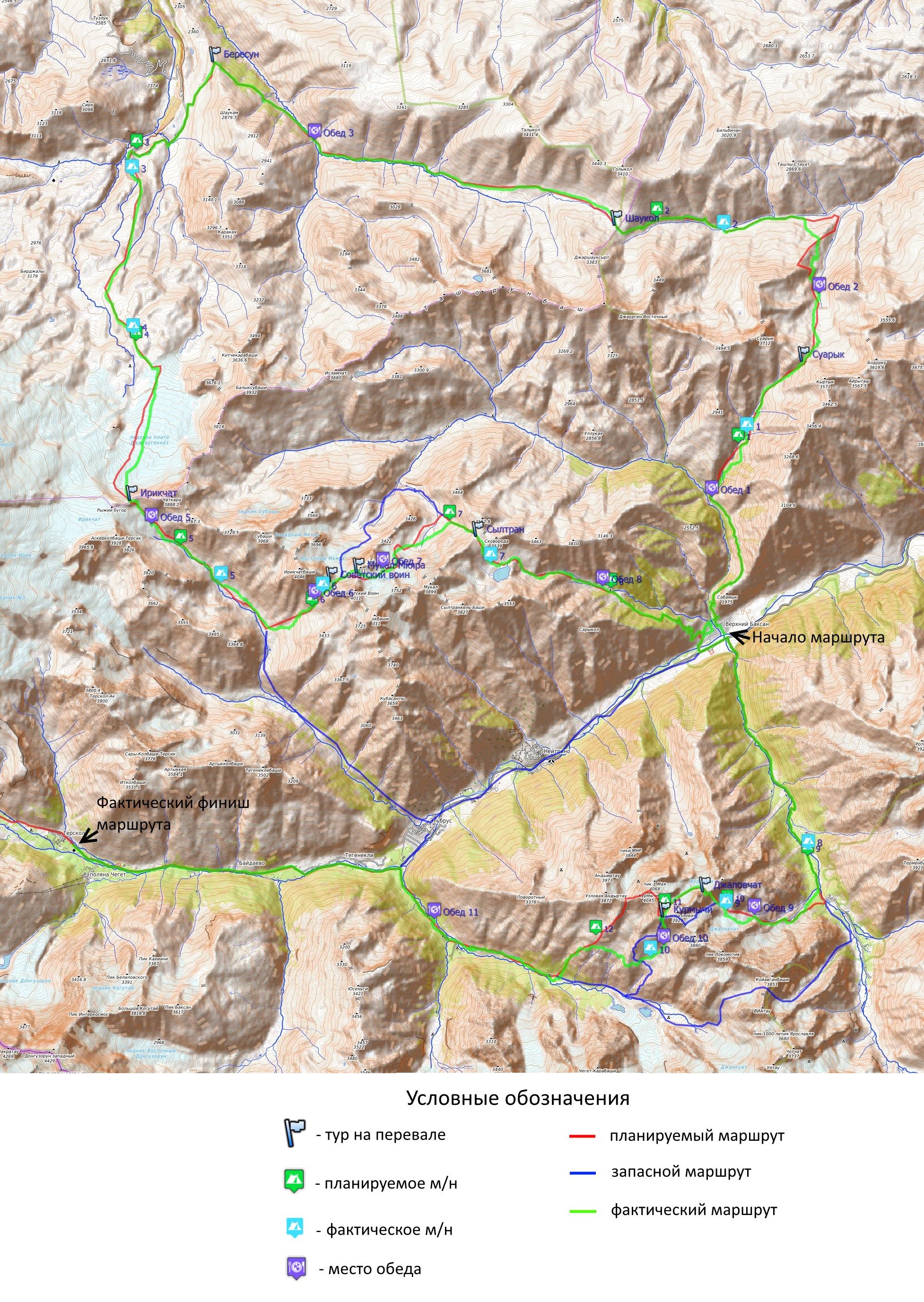 Подробная нитка маршрута.Заявленная: Пос. Верхний Баксан – р. Загулла – пер. Суарык 1А – р. Суарык – р. Ташорун – пер. Шаукол н/к – р. Шаукам – пер. Бересун н/к – р. Малка – лед. плато Джикаугенкёз – пер. Ирикчат 1Б – р. Ирик – пер. Советский воин 1Б – пер. Мукал-Мкяра 1Б – пер. Сылтран н/к – р. Сылтрансу – пос. Верхний Баксан – р. Адырсу – пер. Джаловчат 1Б – пер. Курмычи 1Б – в. Курмычи 1Б – пер. ВЦСПС 1Б – р. Адылсу – р. Баксан – поляна Азау. Пройденная: Пос. Верхний Баксан – р. Загулла – пер. Суарык 1А – р. Суарык – р. Ташорун – пер. Шаукол н/к – р. Шаукам – пер. Бересун н/к – р. Малка – лед. плато Джикаугенкёз – пер. Ирикчат 1Б – р. Ирик – пер. Советский воин 1Б – пер. Мукал-Мкяра 1Б – пер. Сылтран н/к – р. Сылтрансу – пос. Верхний Баксан – р. Адырсу – пер. Джаловчат 1Б – пер. Курмычи 1Б – р. Адылсу – р. Баксан – пос. Терскол. Обзорная карта региона с указанием маршрута, подъездов, отъездов и аварийных выходов (из маршрутной книжки)