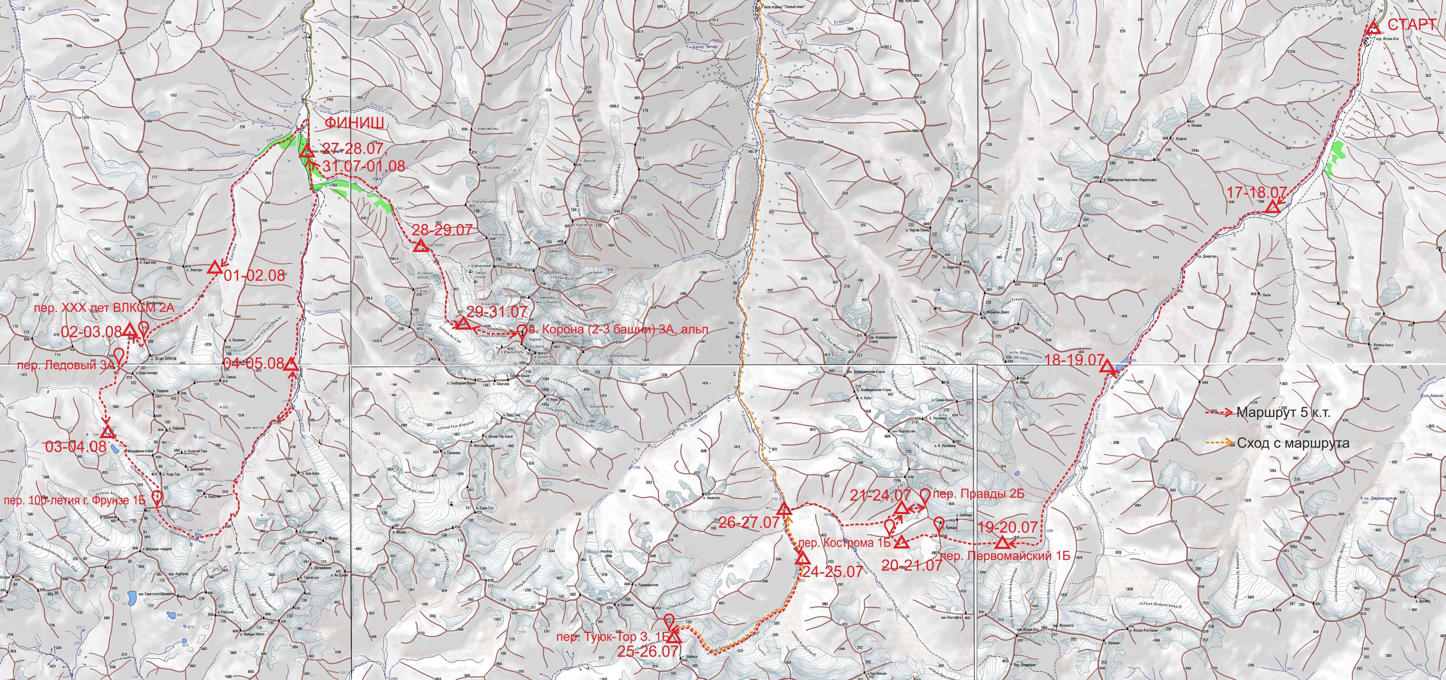 Заявленная: Т/б «Иссык-Ата» – пер. Первомайский (1Б) – пер. Правды. (2Б) – лед. Проценко Ю. – пер. Аламединские Зубья (3А) – лед. Пастухова – долина р. Аламедин – лед. Аламедин Л. – пер. Туюк-Тор З. (1Б) – пер. Ветеранов Туризма (3А*) – долина р. Алтынтор – лед.Кара-тоо (Маяковского) – пер. Корона Юж. (3А) – в. Корона траверс 2-ой, 3-й башен (3А, альп.) – а/л «Ала-Арча» – пер. ХХХ лет ВЛКСМ (2А) – пер. Ледовый (3А) – пер. Дмитровский (1Б) – а/л «Ала-Арча».