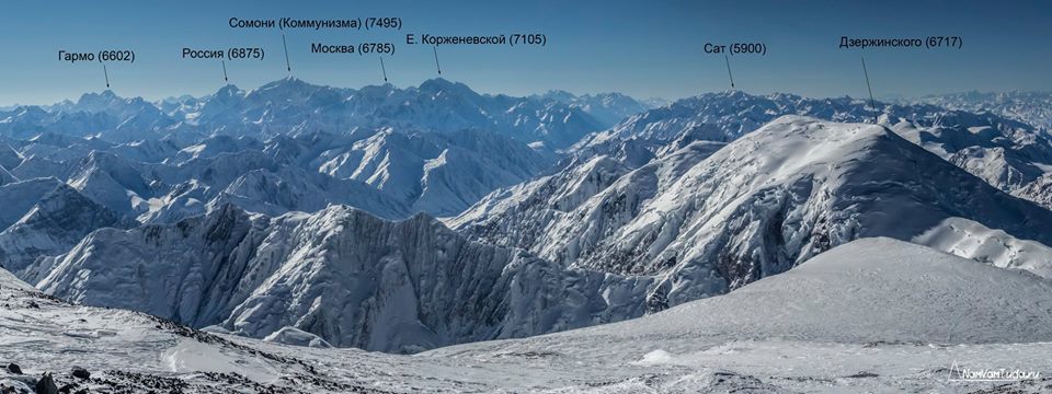 Пики Корженевской (7105 м) и Коммунизма (7495 м) на одной панораме с седловины 6100 под пиком Москва (6785 м). Август 2014
