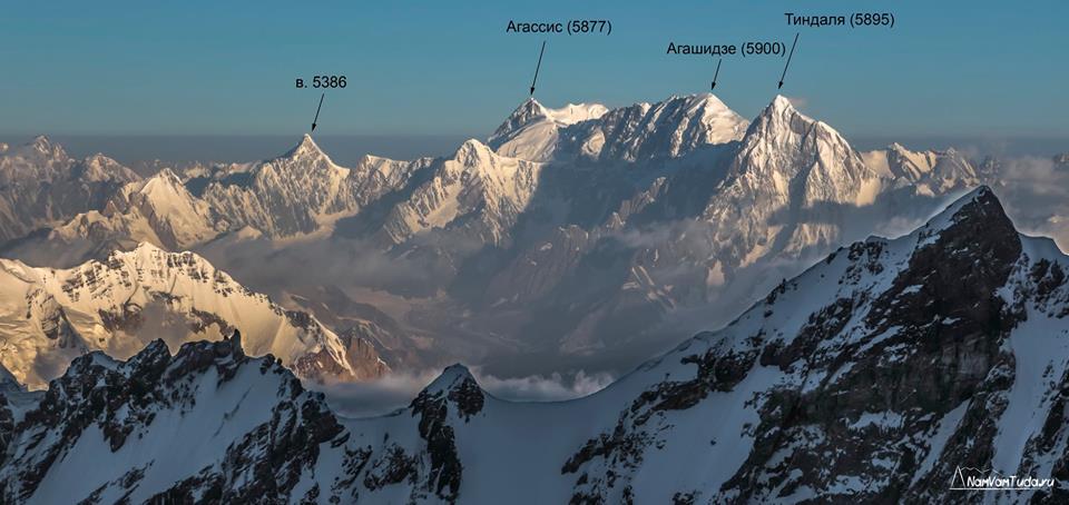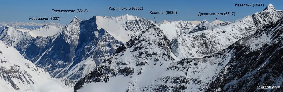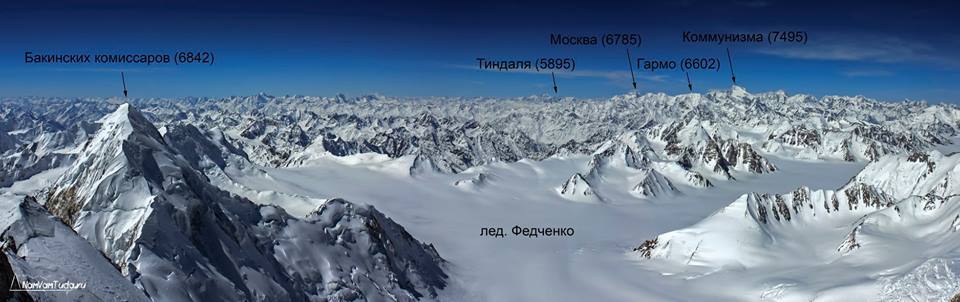 Панорама массива памирских вершин Москва — Ошанина из под пика Тиндаля (5895 м). Июль 2014