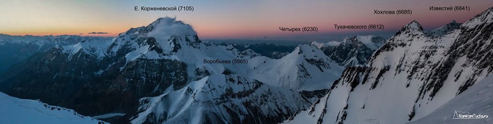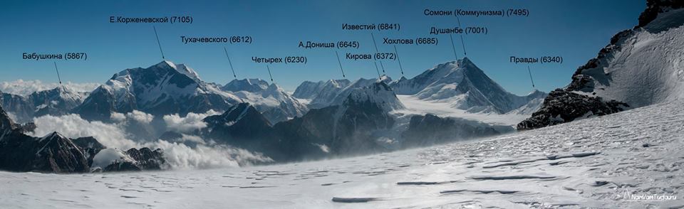 Панорама массива пика Коммунизма (7495 м) с гребня пика Евгении Корженевской. Август 2014