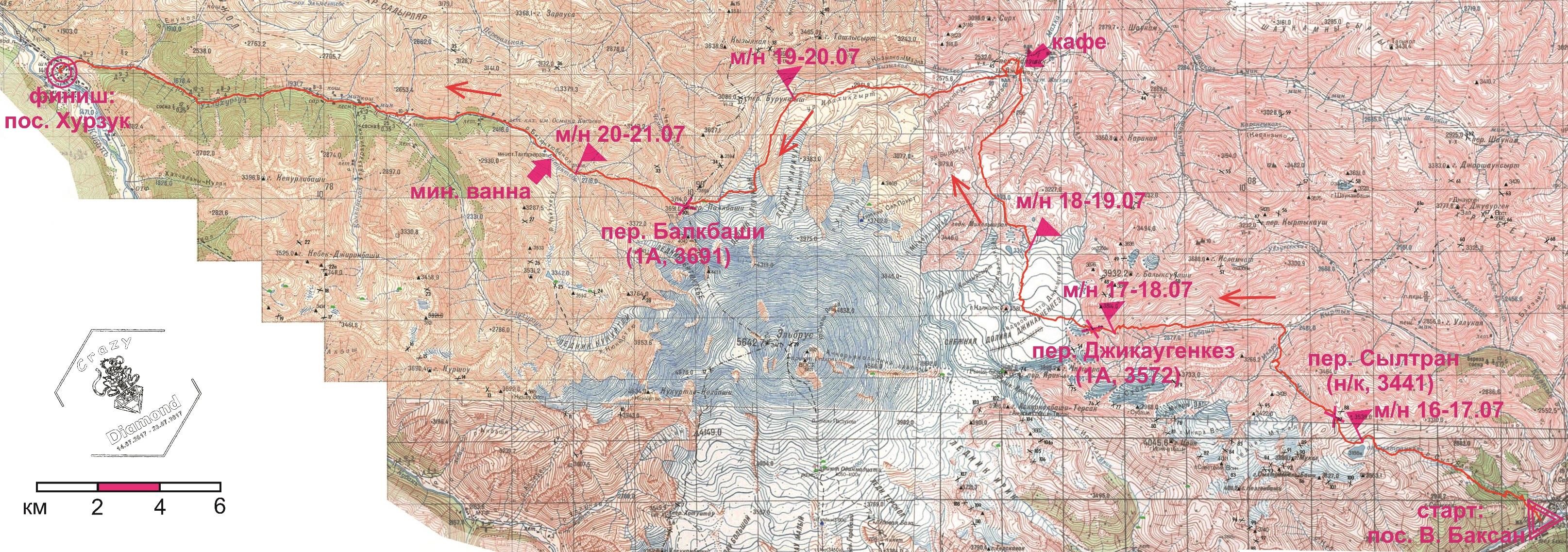 ОБЩАЯ СМЫСЛОВАЯ ИДЕЯ И ОРГАНИЗАЦИЯ ПОХОДА Задумывалась добротная, спортивная и насыщенная 2кс для слушателей ШГТ НУ. Хотелось побывать в Гвандре. Изначально планировался заезд совместно с другими отделениями ШГТ в а/л Джан-Туган для проведения учебных занятий. Автор разработал маршрут со стартом из Джана и финишем в Домбае, но этот вариант МКК завернул из-за пер. Хотютау (1Б) в начале маршрута. Автор не стал идти на ухищрения и предоставил другой, кошеrный маршрут в обход Эльбруса с севера. МКК одобрила данный маршрут, но для его полного прохождения требовались запасные дни, поэтому от тренировок в а/л Джан-Туган пришлось отказаться. Маршрут нарочно минует Тебердинский заповедник, чтобы не оформлять туда путевки. Автор уточнил, что часть маршрута между дол. Кубань и оз. Уллукель проходит в пятикилометровой погранзоне – заказывали погранпропуск на группу. Автор утвердил в МКК запасные варианты обхода ЛП, чтобы не загонять себя в угол на случай непогоды, болезней участников и тд. Прохождение перевалов в целях безопасности было распланировано на утренние часы. Маршрут планировался насыщенный – для облегчения рюкзаков на середине маршрута было организовано две продуктовых заброски: в а/л Узункол и на т/б Глобус, чтобы преодолевать наиболее трудные препятствия налегке. Предварительно костяк группы автор успешно сводил спортивную 1кс по Архызу на майские праздники: группа показала себя хорошо, за 10 ходовых дней должна была акклиматизироваться к 3000 м. Чтобы не сдуться на маршруте, автор провел для группы 10 ПВД по Подмосковью протяженностью 20-55 км каждый: восемь до майского похода и два 2-3-дневных изнуряющих между майским и данным. Упор делался на повышение выносливости, личной техники и экспедиционных навыков группы. Помимо этого, штурманом группы организовывались еженедельные беговые тренировки и тренировки по веревочной технике, участники похода успешно сдали штурману кросс 5/10 км и сдали зачет ШГТ. В поход из специального брали, веревки, комплекты ИСС и железа для связок, альп. кошки, 2 лавлиста, 4 комплекта газовых горелок и газ из расхода 50 г/чел/день (на все дни похода, включая запасные). АВАРИЙНЫЕ ВЫХОДЫ И ОБХОД ПРЕПЯТСТВИЙАварийные выходы с маршрута возможны по дол. р. Кыртык, Субаши, Каракаясу, Малка, Уллухурзук, Узункол, Кичкинекол, Мырды, Учкулан, Даут в пос. Верх. Баксан, Сев. Приют, Джылысу КБР и КЧР, пос. Хурзук, пос. Актюбе, пос. Даут, пос. Учкулан, а/л Узункол, т/б Глобус. Были заявлены варианты обхода ЛП: