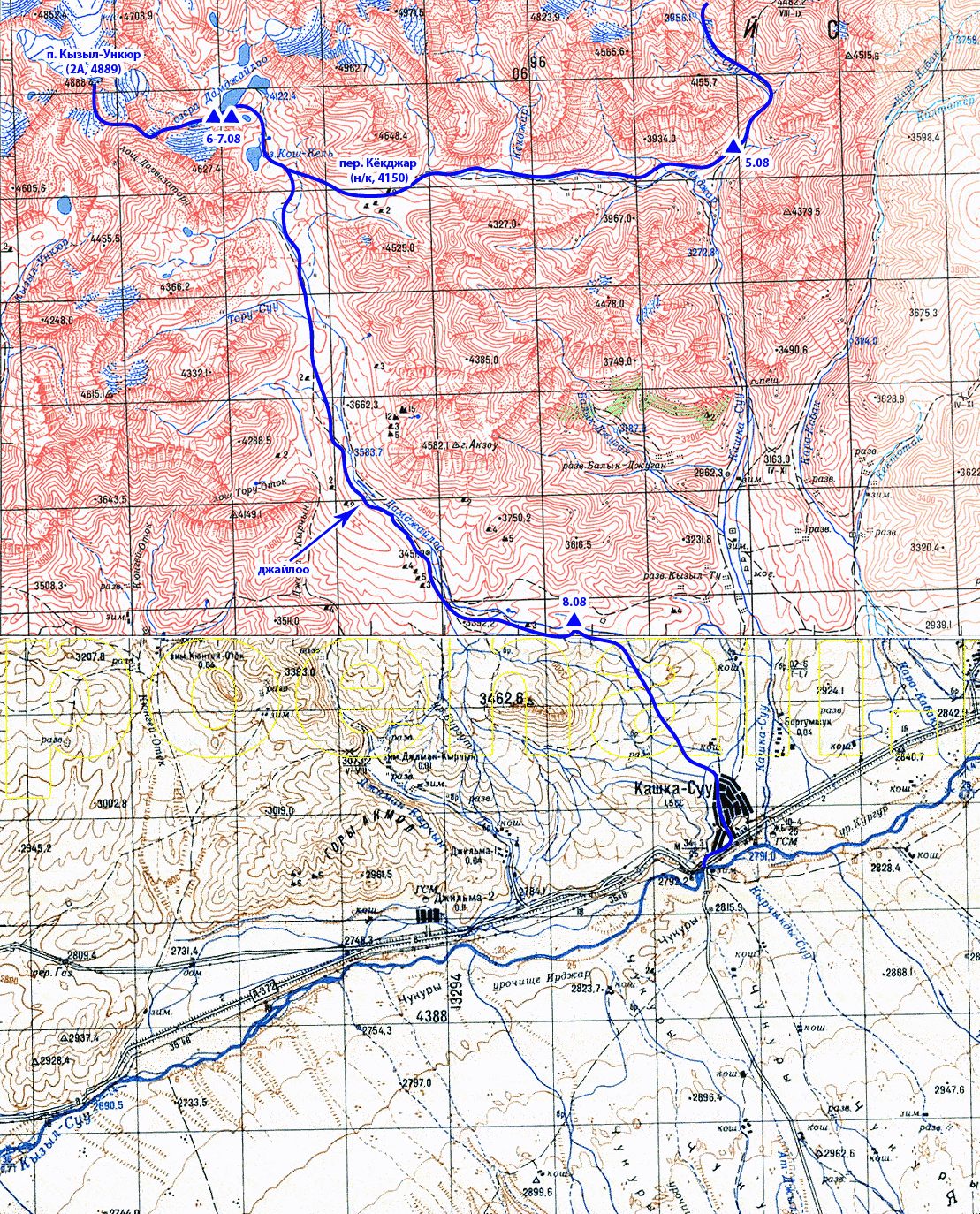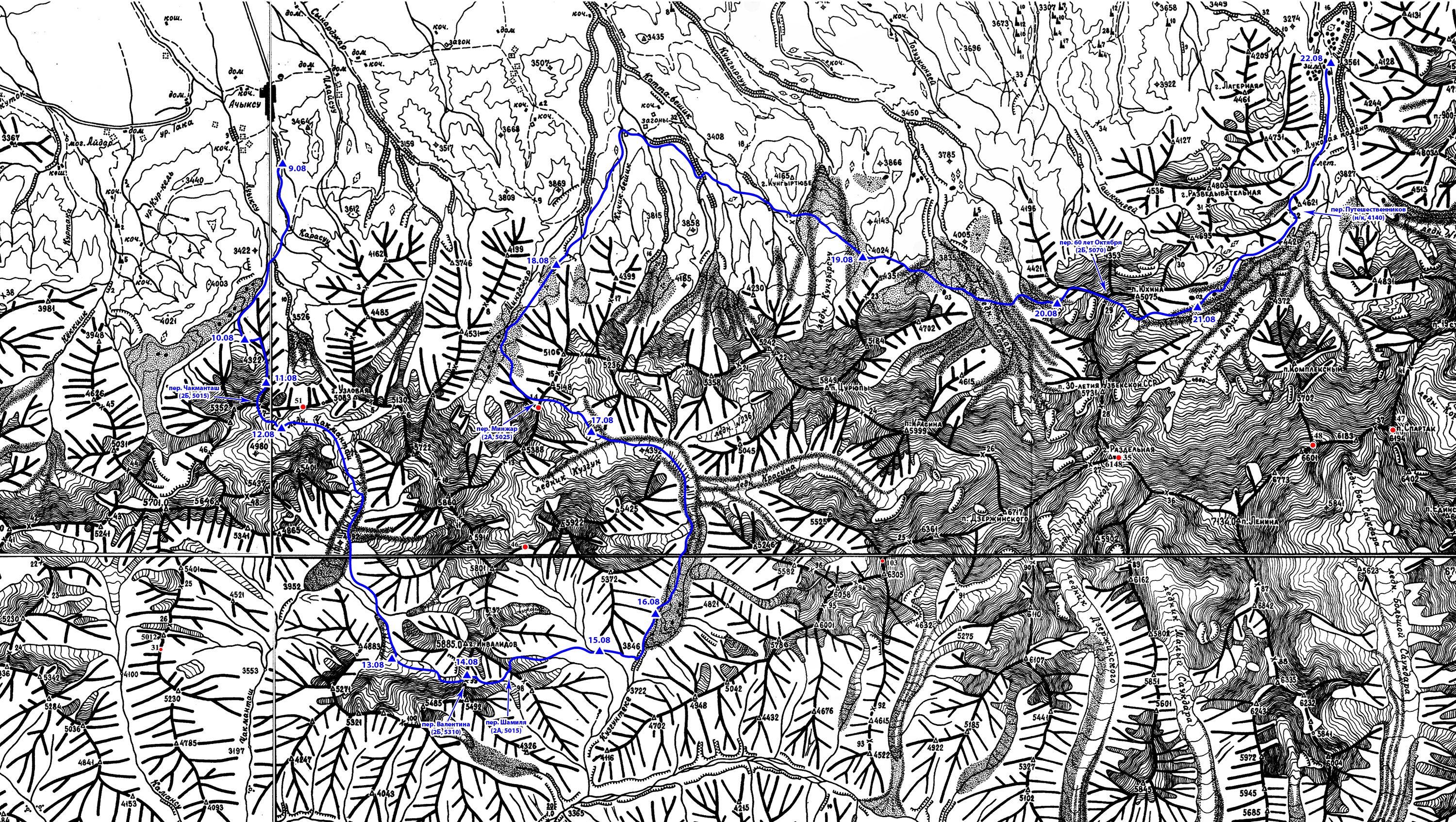 Нитка маршрута: Ош – р. Киндык – пер. Г.Г. Маркеса (1Б*, 4565 м, п/п) – р. Кашкасу – р. Кёкджар – пер. Кёкджар (н/к, 4155 м) – озёра Дамджайлоо – восхождение на пик Кызыл-Ункюр (2А, 4889 м, рад.) – р. Дамджайлоо – пос. Кашкасу – переезд в пос. Ачиксу – р. Карасу – р. Ачиксу – пер. Чакманташ (2Б, 5015 м) – лед. Чакманташ – пер. Валентина (2Б, 5310 м) – пер. Шамиля (2А, 5015 м) – лед. Кузгун – пер. Минжар (2А, 5025 м) – лед. Минжар – р. Катта-Бешик – лед. Кунгыр – лед. Коман – пер. 60 лет Октября (2Б, 5070 м) – лед. Ленина – пер. Путешественников (н/к, 4140 м) – МАЦ «Ачик-Таш» – Ош.