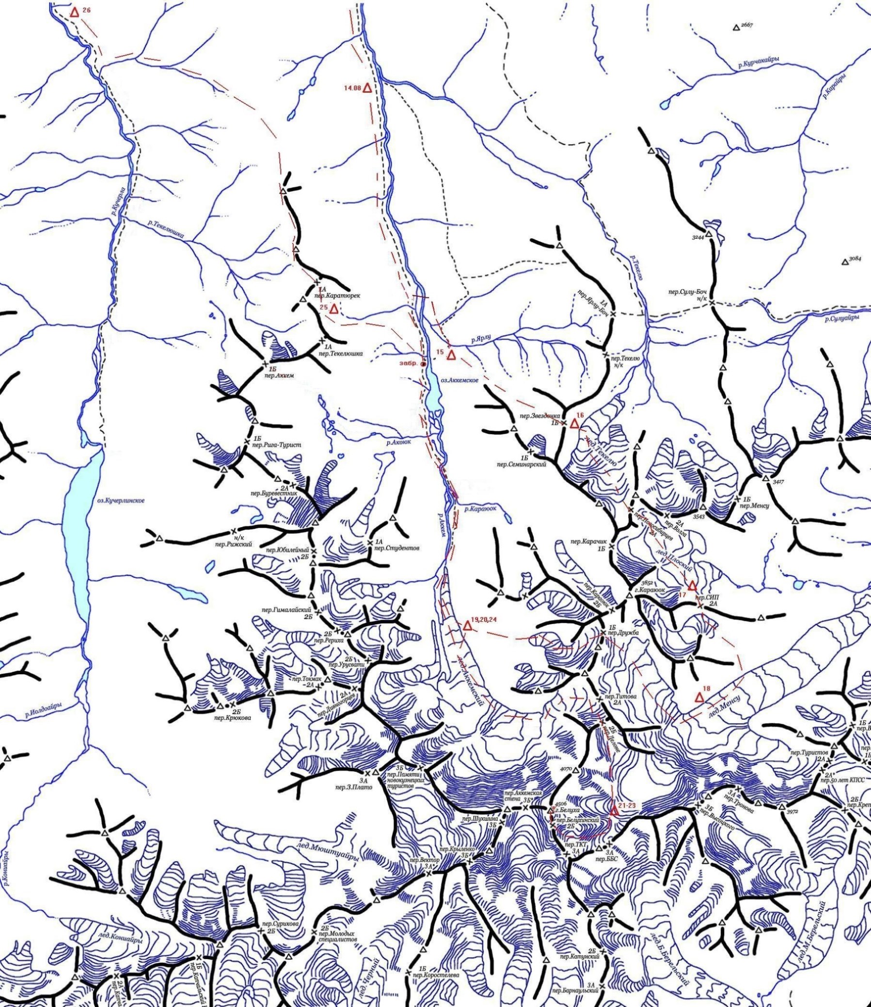 Пройдено 7 препятствий, среди них: 1 перевал н/к, 1 перевал 1А, 2перевала 1Б, 2 перевал 2А, 1 восхождение на вершину 2Б. Подробная нитка пройденного маршрутаПос Тюнгур – пер. Кузуяк(н/к) – р.Аккем- оз. Аккемское - пер Звездочка(1Б)- ледн. Текелю -пер. Новосибирцев(2А) – ледн. Плоский - пер. СИП(2А) – ледн Менсу- пер Дружба(1Б) – ледн Аккемский – Радиальное восхождение г. Белуха Вост.(пер. Делоне 2А – подъем по «подушкам» на гребень ведущий к вершине (2Б)- г. Блуха Вост. 4506м-спуск по пути подъема) – оз Аккем - пер.Кара-Тюрек(1А) - р. Кучерла-пос. Тюнгур Определяющие препятствия маршрута