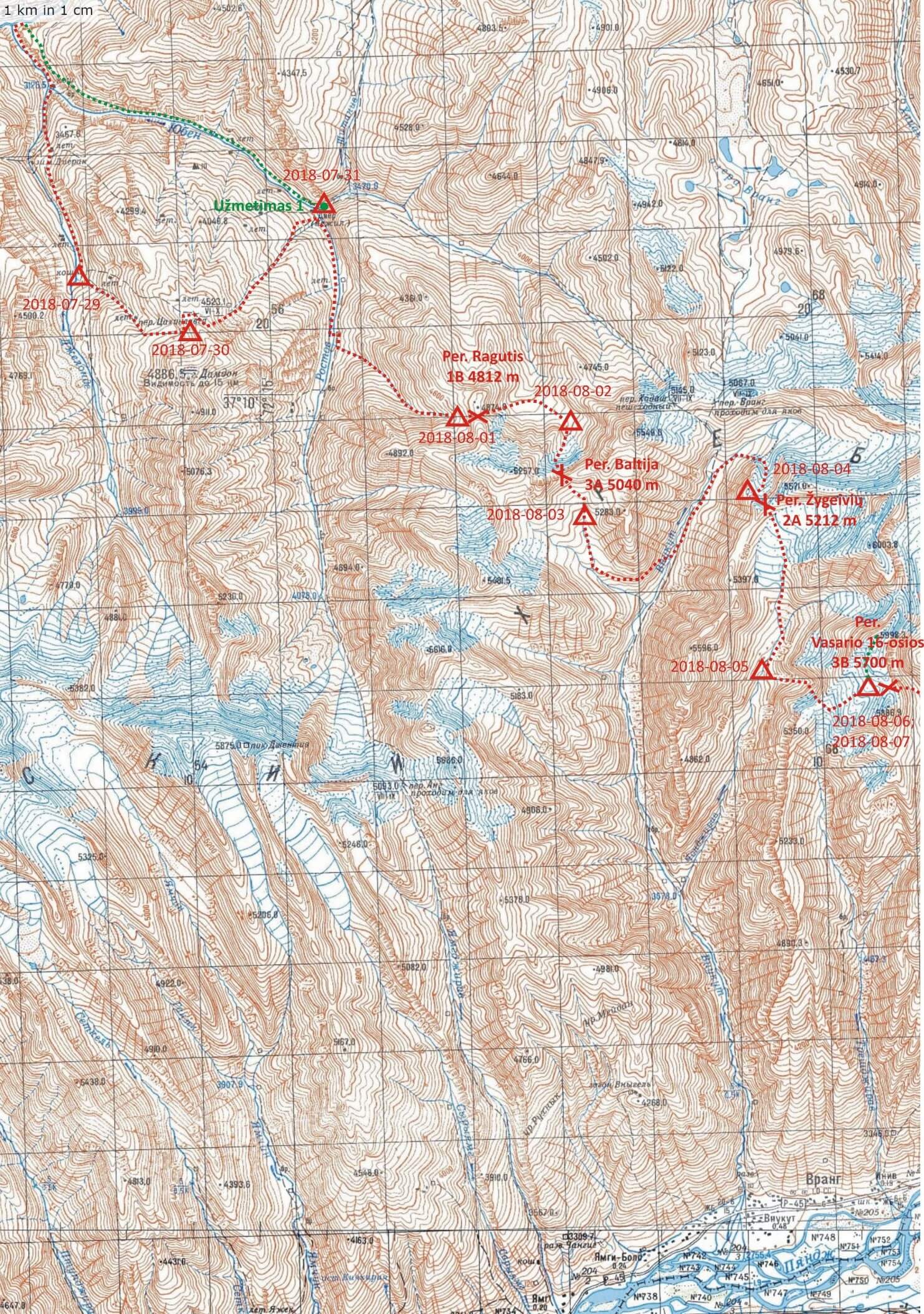 Идея похода и краткая характеристика районаВ 2018 г. вся Литва отмечала столетие восстановления Литовского государства. Мы хотели отметить этот красивый юбилей по-своему. С самого начала года мы вынашивали идею о походе, достойном имени столетия Литвы. Горы Юго-Западного Памира уже с 1964 г. стали для литовских альпинистов своими. В 1964 г. лучшие альпинисты Литвы того времени здесь провели экспедицию, во время которой взошли на безымянную 6080 м. вершину и назвали её именем Литвы. В той же экспедиции ещё двум вершинам присвоили имена - Чюрлёнис и Донелайтис. С тех пор в честь различных знаменательных событий литовцы возвращаются в этот отдалённый горный район и каждый раз литовскими именами называют ещё несколько безымянных вершин или перевалов. Самая продуктивная и особо примечательная экспедиция в долину реки Вранг в 1984 г., организовал A. Гудялис. В том году на картах появились ещё девять литовских вершин, таких как „КПИ“, „Литуаника“, „Дарюс и Гиренас“, „Витаутас Дидисис“, „Академик Баршаускас“, „Aудра“ и др. В настоящее время на Юго-Западном Памире есть свыше 20 вершин, названных литовскими именами. Юго-Западный Памир имеет глубокие литовские традиции и в сфере горных походов. Альгимантас Юцявичус провел здесь не один поход сложнейшей категории во время которых появились перевалы Литуаника 2А, Чюрлёнис 3Б (до сих пор никто больше по нему не проходил) и другие перевалы. Вероятно, более всего впечатляет поход 6-ой к.с. нашего легендарного руководителя на Юго-Западном Памире в 1989 г., когда он прошел по 9-ти литовским вершинам, оставляя на каждой из них тогда ещё запрещенный национальный флаг Литвы. После распада Советского Союза в Таджикистане была гражданская война, которая на долгое десятилетие закрыла весь район. Литовцы суда вернулись лишь в 2003 г., а в 2004-ом, ровно 40 лет спустя после первопрохождения вершины Литва, первый раз на Юго-Западном Памире поход прошла автономная группа клуба туристов Вильнюсского Университета под руководством Шарунаса Зигмантаса. В её составе первый раз поход 5-ой к.с. в горах прошёл и руководитель группы нынешнего похода Юрас Йорудас. Изучив историю альпинизма Литвы, более подходящего района для горного похода в честь столетия Литвы найти было невозможно. С февраля месяца 2018 года начали изучать район, читать последние и менее свежие отчеты. Маршрут похода мы наметили такой, чтобы взойти на как можно больше литовских вершин, а также, чтобы в маршрут входило несколько никем не пройденных, безымянных перевалов и, конечно-же, восхождение на вершину „Литва“. Поход мы запланировали в самой высокой части горного хребта Шахдара. Чтобы увидеть панорамы хребта со всех сторон мы решили начать поход со стороны долины Шахдара, пройти сквозь горы, которые нас интересуют, главный горный хребет пересечь несколько раз и спуститься к реке Пянж, протекающей по Таджикско-Афганской границе. Горный хребет Шахдара является самым южным горным хребтом Памира. Район славится хорошей погодой – практически нет летних осадков, что гарантирует небольшое количество снега в этом районе, хотя средняя высота хребта составляет 5600 м, а высота самой высокой вершины Карла Маркса - 6720 м. Так как нам удалось собрать сильную, амбициозную и спортивную группу, решили попытаться пройти горный поход 6-ой (наивысшей) категории сложности. В ра