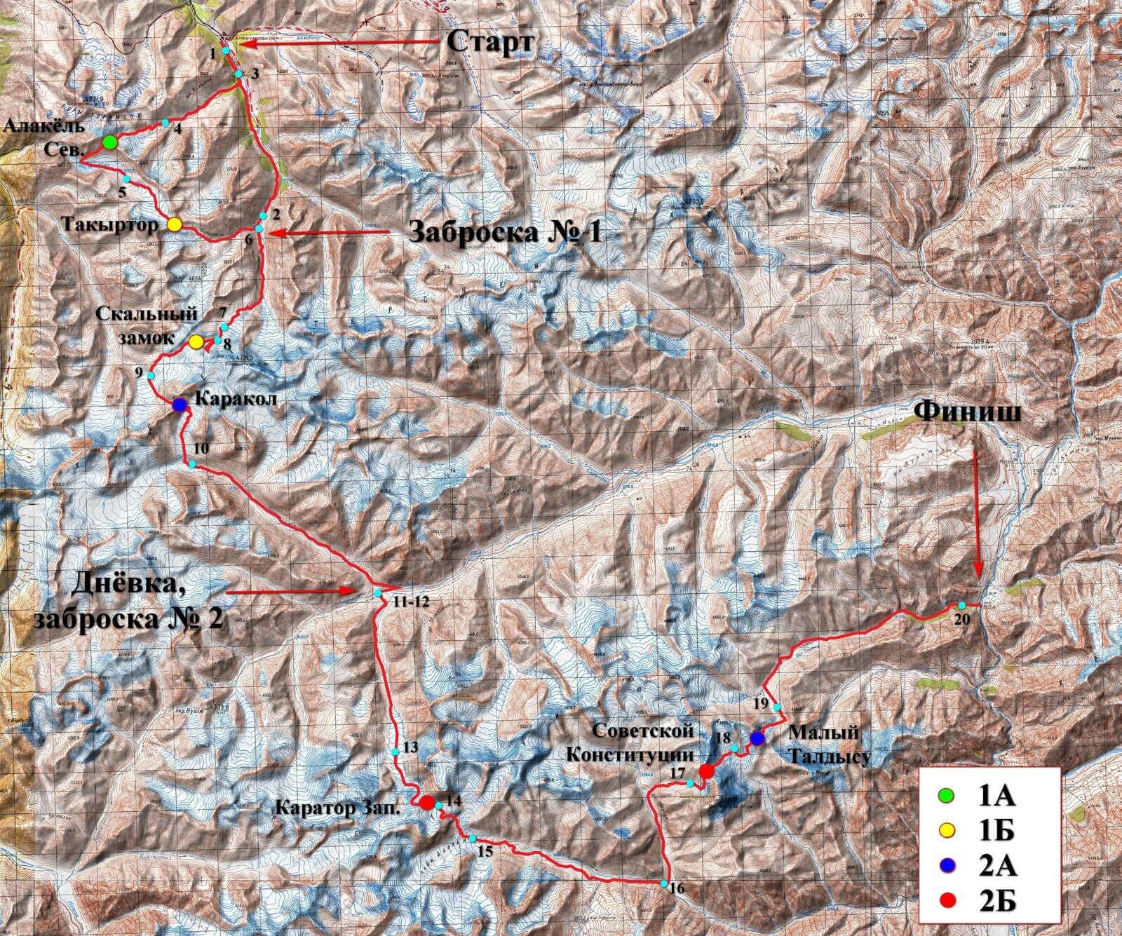 Подробная нитка маршрута Заявленная д.р. Алтын-Арашан – д.р. Кельдыке–пер. Алакёль Северный, 3884 м, 1А – оз. Алакёль – пер. Такыртор, 4024 м, 1Б – д.р. Такыртор – д.р. Чон-Узень – [пер. Туристов Татарии, 4300 м – пер. Каракольский Вост., 4300 м] (св., 2А) –лед. Караколтор Вост. (№ 65) – в. Аксу, 4711 м, 1Б, рад. – пер. Караколтор Юж., 4460 м, 2Б – лед. № 61 – д.р. Караколтор – д.р. Куйлю Вост. – д.р. Каратор – лед. Каратор – пер. Валерия Грушина, 4906 м, 2Б – лед. Куйлю Южн. – пер. Целинный, 5027 м, 2Б – лед. Айлампа – д.р. Теректы - д.р. Эки-Чат – пер. Советской Конституции, 4712 м, 2Б – лед. Аютор – пер. Талдысу Зап., 4506 м, 2Б – лед. Талдысу Мал. – д.р. Мал. Талдысу – д.р. Сары-Джаз. Выполненная д.р. Алтын-Арашан – д.р. Кельдыке – пер. Алакёль Северный, 3845 м,1А – оз. Алакёль – пер. Такыртор, 4036 м, 1Б – д.р. Такыртор – д.р. Чон-Узень – пер. Скальный замок, 4231 м, 1Б – лед. Кёльтор Вост. – пер. Каракол, 4240 м, 2А - лед. Караколтор Вост. - д.р. Караколтор – д.р. Куйлю Вост. – д.р. Каратор – лед. Каратор – пер. Каратор Зап., 4623 м, 2Б – лед. Каратор Вост. – д.р. Теректы – д.р. Эки-Чат – пер. Советской Конститу- ции, 4711 м, 2Б – лед. Аютор – пер. Талдысу Мал., 4497 м, 2А – д.р. Мал. Талдысу – д.р. Сары-Джаз. Определяющие препятствия маршрута