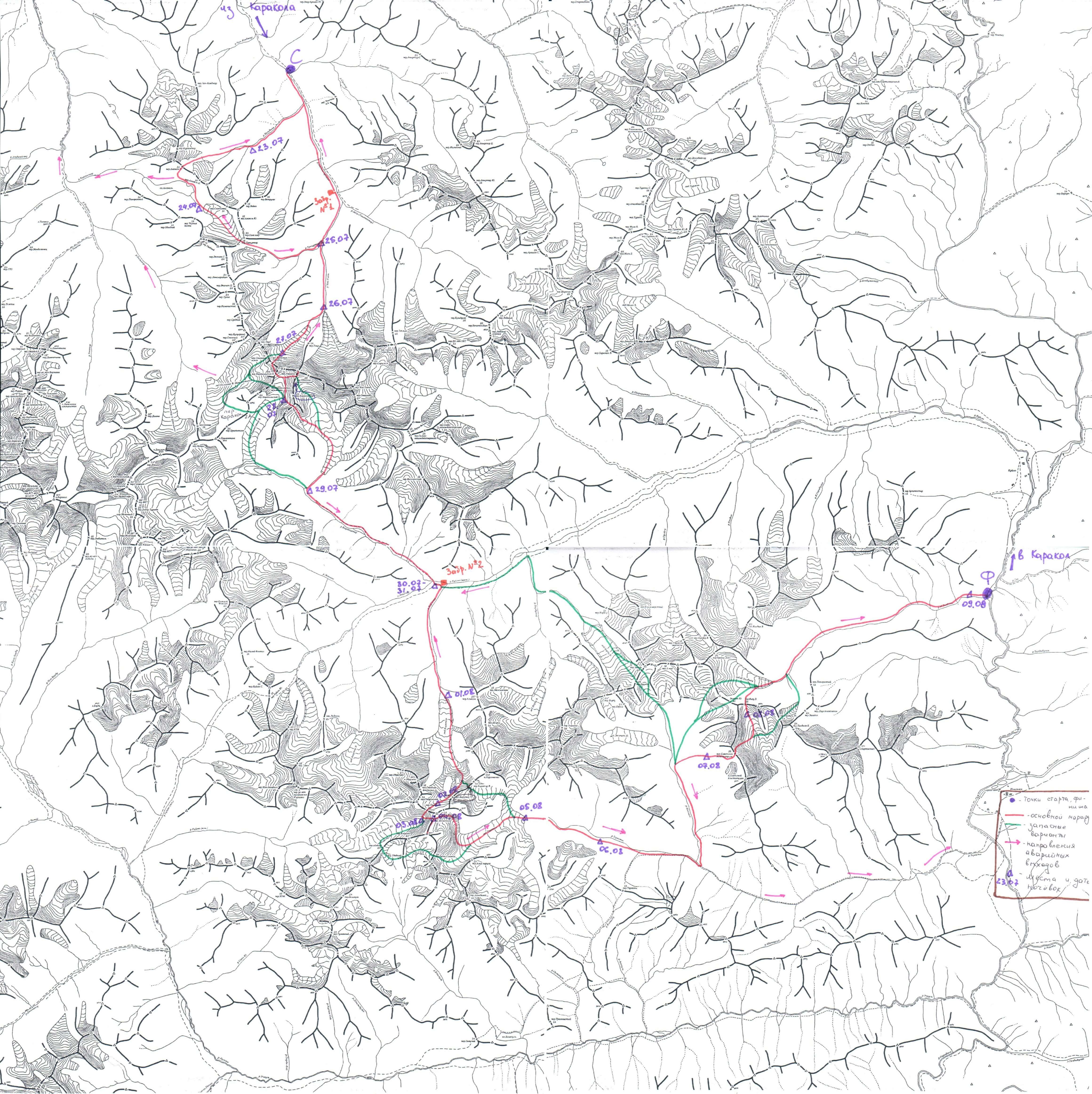 Граница между Терскей-Алатау и Куйлю проходит по долине реки Куйлю Вост., вдоль которой по левому берегу проложена грунтовая дорога вплоть до слияния её исто- ков: рек Ашутор и Караколтор. В этом месте, на правом берегу Ашутора находится кош, в котором можно организовать заброску, заехав туда на машине. Дорога проходима для машин типа УАЗ Буханка, время в пути в одну сторону от Каракола до коша занимает по- рядка четырёх часов. Отличительной особенностью хребта Терскей-Алатау является высокая степень обжитости его северных долин. Практически по каждой из них проложена дорога, есть обустроенные горячие источники, много пастбищ (и, как следствие, троп). При этом высота, до которой можно заехать на машине, небольшая – в районе 2500 м, поэтому можно разработать маршрут похода с плавной акклиматизацией. Сложность перевалов, вершин и траверсов на Терскей-Алатау варьируется от 1А до 3Б, в главном хребте есть несколько пиков выше 5000 м, что позволяет проводить походы самых разных категории сложности и без особых проблем закладывать различные запасные варианты маршрутов. Основное оледенение сосредоточено на главном хребте. Близость озера Иссык-Куль определяет большое количество осадков и периодов непогоды. Хребет Куйлю по сравнению с Терскей-Алатау более компактный, при этом технически в целом более сложный: перевалов начальных категорий очень мало. Район характеризуется мощным оледенением, высоты долин – не ниже 3000 м, количество пятитысячников больше, чем на Терскей-Алатау. Населённой является только долина реки Куйлю Вост. По имевшимся у нас описаниям, в долинах рек Теректы и Малый Талдысу также должны располагаться коши, однако по факту их не оказалось. Логически маршрут, общая продолжительность которого (включая дни заезда и выезда) составила 19 дней + 1 запасной, на этапе планирования разбивался на три части: Акклиматизационная часть Стояла задача получить плавную акклиматизацию в северном отроге хребта Терскей-Алатау, а также начать поход с постепенным увеличением категорий сложности перевалов (1А – 1Б). Кроме того, запланировано было посещение красивейшего озера Алакёль и диких горячих источников в долине реки Экичат. Разминочная часть В этой части было заложено дельнейшее увеличение высоты и сложности перева- лов, переход через главный хребет Терскей-Алатау (2А, св. – 1Б, рад. – 2Б) и выход к за- броске в долине реки Куйлю Вост. Техническая часть В последней части маршрута, проходившей по хребту Куйлю, была запланирована основная высотная и техническая работа: прохождение четырёх перевалов 2Б, один из которых (пер. Целинный) – высотой более 5000 м. С целью осмотра района выход планировалось пройти его насквозь с запада на восток, с выходом в д.р. Сары-Джаз. На поход было сделано две заброски. Первая (с едой и специальным снаряжением для разминочной части маршрута) была организована в долине реки Чон-Узень. В 660 м выше слияния рек Чон-Узень и Такыртор к берегу реки подходит осыпной вынос, на склоне которого удобно закапывать мешки с заброской (N42°17'06,33" E78°38'01,41"). Вторую заброску мы отправили вместе с дружественной группой Петроградского клуба туристов в кош в д.р. Куйлю Вост. (N42°07'39,38" E78°42'16,23"). У этого же коша мы сделали днёвку. Изменения маршрута и их причины Запланированный маршрут был пройден с большими изменениями по запасным вариантам, 