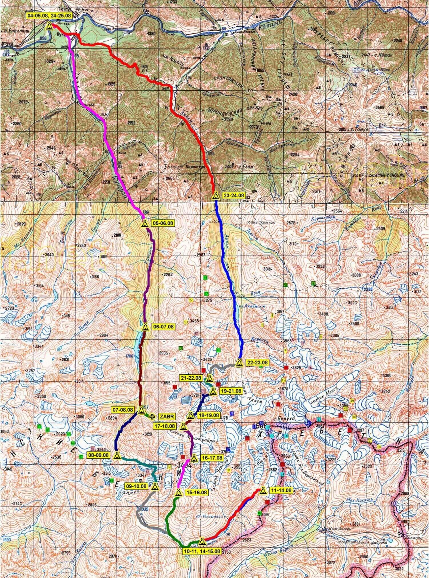 Обзорная карта пройденного маршрута Техническое описание прохождения группой маршрута Направления «левый» и «правый» приводятся в орографическом смысле, если явно не указано иное. Время используется местное - +4ч от московского, если явно не указано иное. Чистовое ходовое время (ЧХВ), равно как и время подъемов и спусков указано без учета привалов. Общее время прохождения препятствия указано от начала подъема до окончания спуска, включая все привалы и другие остановки. Все координаты указаны в градусах в системе WGS84. Использовались верёвки по 50 метров.