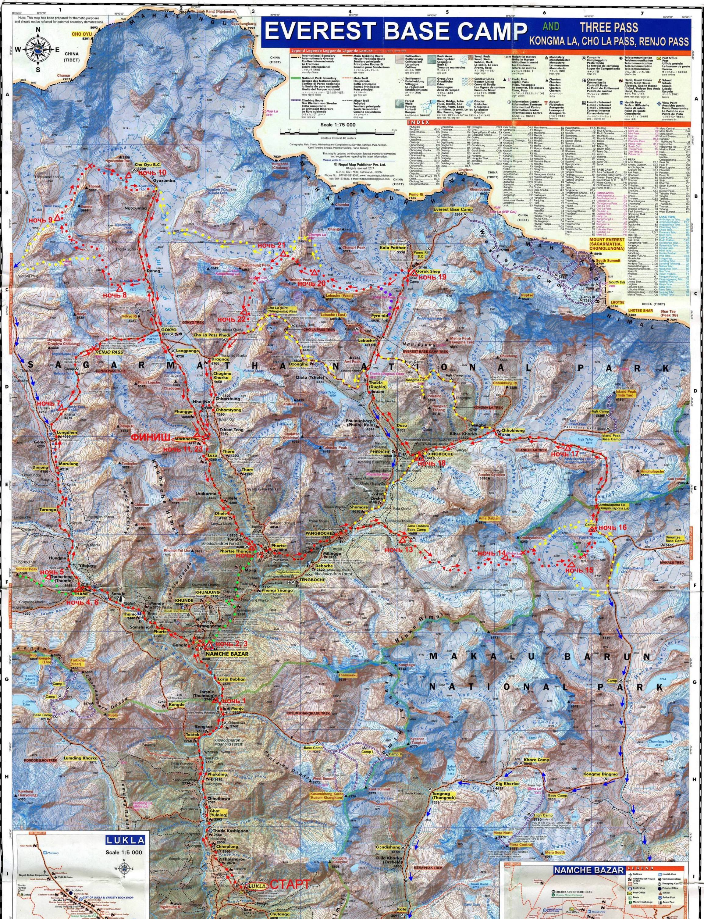 Суммарный перепад высот: 25 000 м (подъемы/спуски: 12 000 м/13 000 м). Подробная нитка маршрута: Маршрут заявленный: г. Лукла – д.р. Дуд Коши - пос. Намче-Базар – пос. Форце Танга (радиально в целях организации заброски) – пос. Намче Базар – д.р. Боти Коши – п. Таме – Сандер Пик (2А, 5361 м, радиально) – пос. Лунгден – д.р. Ренджо Кхола – пер. Ренджо Ла (1А, 5418 м) – пос. Гокио, ледник Нгозумба – озеро Тонак – безымянный перевал к югу от пика Сумна между вершинами 5637 м и 5799 м (предположительно 2А, 5570 м, первопрохождение)-лед. Лумсумна – пер. Тонак Ла, к северу от вершины Тонак (1Б, 5600 м) – озеро Гьязумба-лед. Нгозумба – д.р.Дуд Коши – пос. Форце Танга – д.р.Имджа Кхола – пос. Пангбоче – д.р.Чолунгче Кхола – лед. Наре – пер. Минбо Ла (2Б, 5845 м) – лед. Хунку Нуп – безымянный перевал между вершинами 5888 м и 5829 м (предположительно 1Б, 5700 м, первопрохождение) – лед. Хунку, озера Панч Покхари – пер. Ампхулапча (2Б, 5845 м) – лед. Ампхулапча – д.р. Имджа Кхола – пос. Дингбоче – лед.Кхумбу – пос. Горакшеп – лед. Шангри Нуп – пер. Шангри Ла Южный (2Б, 5697 м) – лед. Гаунара – пер. Чола Кол (2Б, 5500 м) – д.р. Накток Кхола – пос. Драгнак – д.р. Дуд Коши - пос. Мачермо Маршрут пройденный: Маршрут пройден в заявленном варианте, за исключением одного незначительного изменения: из поселка Дингбоче мы сразу совершили подход под перевал Шангри Ла Южный, не заходя в поселок Горакшеп. Это позволило сэкономить силы на подходе, не пересекая ледник Шангри Нуп с северного края на южный, а пройдя изначально по его правому южному краю. Перевал Чола Кол по факту прохождения мы оценили как 2А, а не 2Б, как предполагалось предварительно. Определяющие препятствия маршрута.