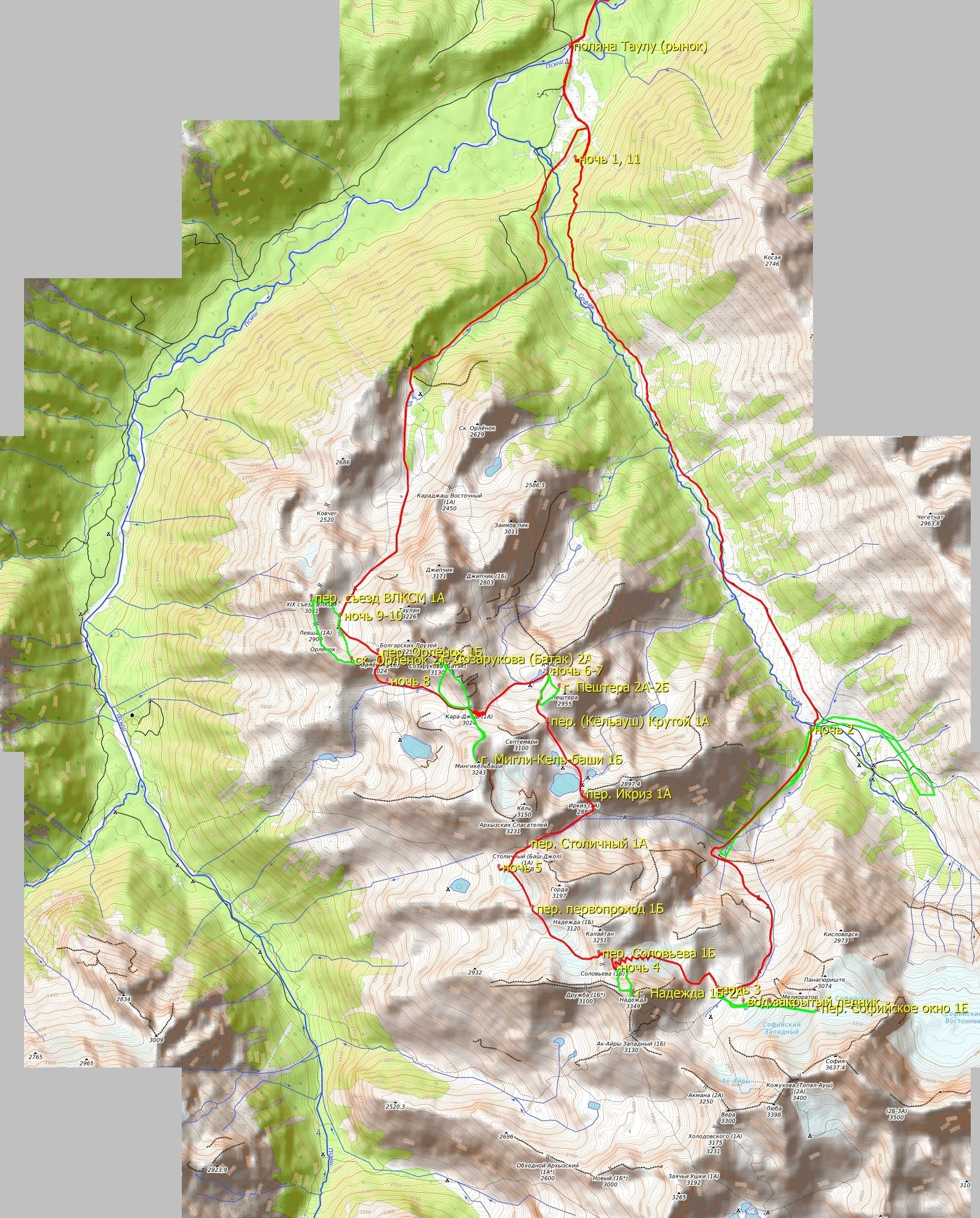 Вершины: г. Надежда (1Б), г. Пештера (2Б), г. Мигли-Кель-Баши (1Б), г. Созарукова (2А), г. съезд ВЛКСМ (1А), г. Орлёнок (2А). Траверсы: гребня на подходе к г. Надежда (1Б), гребня от г. 19 съезд ВЛКСМ до скал Орлёнок (2А). Суммарный перепад высот маршрута (подъем + спуск) составил 12500 метров. Подробная нитка маршрута Заявленный маршрут: Поляна Таулу - р. София - пер. Ак-Айры (1Б) – г. Надежда (1Б) - пер. Соловьева (1Б) - пер. Столичный (1А) - пер. Икриз (1А) - Софийские озера - пер. Крутой (1А) – оз. Верхняя запятая - г. Пештера (2Б) - пер. Караджаш (1А) - г. Мигли-Кель-Баши (1Б) - пер. Орленок (1Б) – г. Орлёнок (2А) – оз. Орленок - руч. Орлёнок – р. София - поляна Таулу Пройденный маршрут: Поляна Таулу - р. София - пер. Софийское окно (1Б) – г. Надежда (1Б) - пер. Соловьева (1Б) - пер. (первопроход) (1Б) - пер. Столичный (1А) - пер. Икриз (1А) - Софийские озера - пер. Крутой (1А) – оз. Верхняя запятая - г. Пештера (2Б) - пер. Караджаш (1А) - г. Мигли-Кель-Баши (1Б) – г. Созарукова (2А) - пер. Орленок (1Б) – г. 19 съезд ВЛКСМ (1А) - г. Орлёнок (2А) – оз. Орленок - руч. Орлёнок – р. София - поляна Таулу – пос. Архыз. *Жирным выделены изменения в маршруте. Высотный график похода