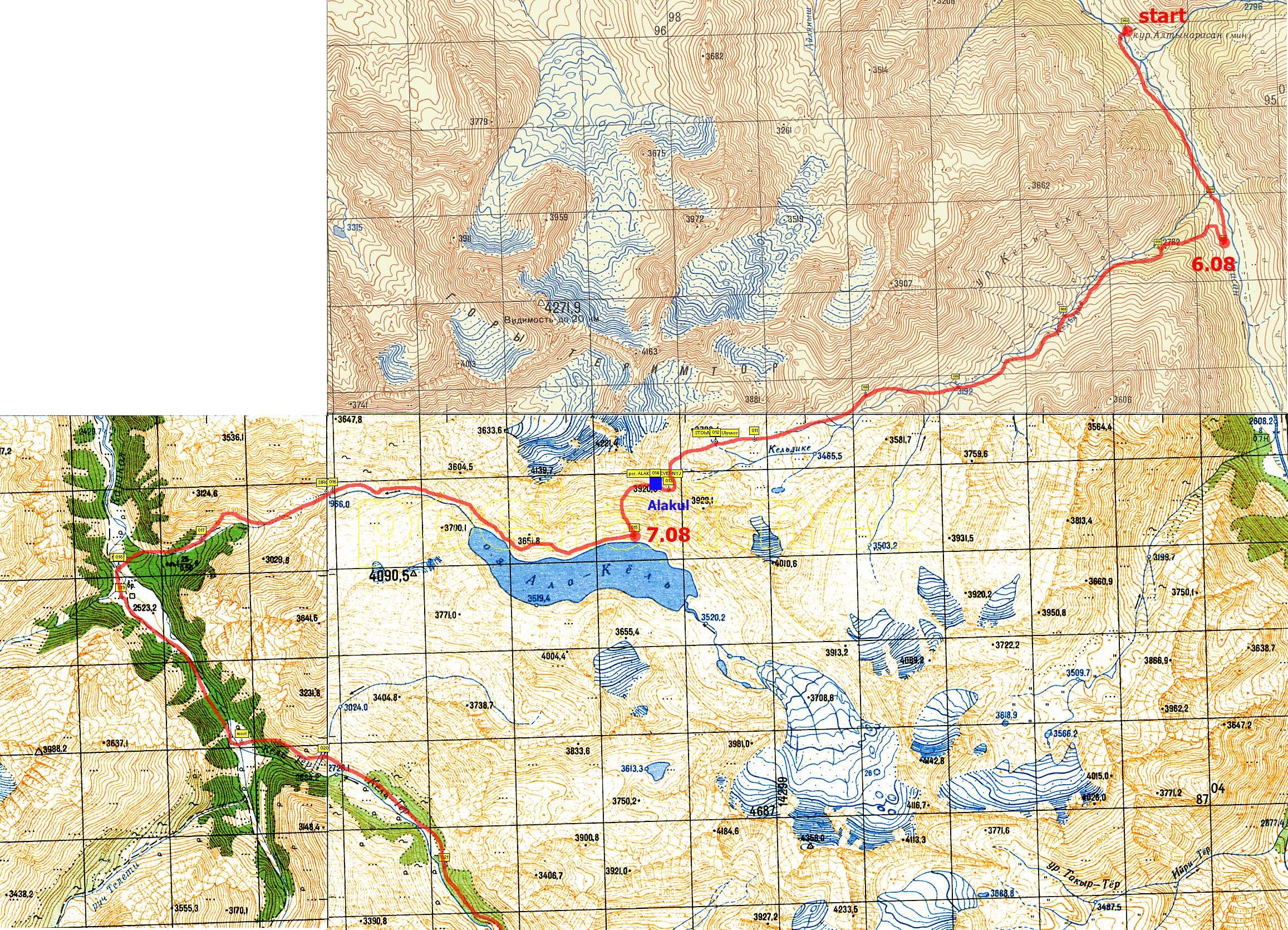 Всюду в отчёте, если не оговорено особо, термины ‘левый’ и ‘правый’ понимаются в орографическом смысле. Время – UTC+7, Новосибирск. 06 августа. Г. Новосибирск – аэропорт Манас – г. Каракол – кур. Алтын- Арашан – долина р. АрашанВыход (В): 17:34. Стоянка (С): 18:40 Пройдено: 3.4 км (2486 – 2587 = + 101 м) Из Новосибирска в Бишкек летим рейсом в ночь с пятницы на субботу. Таким образом нам удаётся хотя бы на заезде максимально использовать отпускное время, которым располагают участники похода. В аэропорту Манас нас встречает водитель, и, по сути, маршрут начинается уже здесь, так как приходится сразу надевать рюкзаки и идти в кромешной тьме на стоянку. Загружаемся, до отказа заполнив собой и рюкзаками 18-местный микроавтобус, и едем. Дороги в это время свободны, так что проблем с выездом из города не возникает. Погода хорошая: ни дождя, ни жары. Останавливаемся на завтрак посередине пути, а затем – искупаться в Иссык-Куле близ бывшего санатория министерства обороны на южном берегу. К базе Ханина подъезжаем ближе к обеду. За 8 лет, прошедших после предыдущего визита руководителя в Каракол, база существенно обновилась, она отремонтирована, к ней пристроен новый кирпичный корпус с комнатами для постояльцев, появился корпус конторы со складом снаряжения. Закупаем бензин на ближайшей заправке и готовим заброску для завоза в долину Каракол, упаковав её в большие ‘китайские’ сумки. Неприятным известием стало сообщение о полностью смытой дороге и, как следствие, о невозможности доехать до ‘альплагеря’ близ речки Аютор на машине. Чтобы не суетиться и не терять время, обедаем в столовые базы. Достаточно вкусно, но немного дороже, чем в кафе. После этого загружаемся в ‘Урал’ с будкой и едем. Проехав через Теплоключенку (сейчас село переименовано кыргызами в Ак-Суу), въезжаем в ущелье Арашан, и вскоре ощущаем насколько хуже стала дорога за последние годы. Местами она теперь сравнима по своей разбитости с путём заезда в долину Актру на Алтае. К курорту Алтын-Арашан подъезжаем около 16 (по местному времени, то есть около 17 по времени, принятому нами в походе), выгружаемся и выходим. Светит солнце, но не жарко, к тому же мы, перейдя по мостику на левый берег, практически сразу оказываемся в тени. Пересекаем несколько мелких ручейков и входим под сень леса. Тропа сырая, но не очень скользкая, грязи почти нет. Подойдя к Кельдыке, мостик не ищем (он должен быть несколько выше по течению, и в нашей ситуации идти к нему смысла нет), а переходим ручей босиком вброд. Время клонится к вечеру, и надо искать место для ночлега. Есть две альтернативы: либо остаться в долине Арашана, либо попытаться подняться вверх по Кельдыке. Учтя все обстоятельства: хмурящееся небо, полукилометровый набор высоты до ближайшей стоянки наверху, малое количество времени до заката солнца, решаем поискать место поблизости. Пройдя немного вверх по долине, находим практически сухое и почти не загаженное место, при этом достаточно (для общего спокойствия) удалённое от стоянок пастухов. Пока ставим палатки, верховья долины резко заволакивает облаками, и вскоре нас начинает поливать дождь. После ужина он прекращается и позволяет спокойно погулять перед сном. (Фото12 Фото13) 07 августа. Долина р. Арашан – р. Кельдыке – пер. Алакуль северный (1А) – оз. Алакуль Подъём (П): 5:33. В: 6:44. С: 16:00 Пройдено: 10.1 км (2587 – 3916 – 3558 = + 1329 - 358