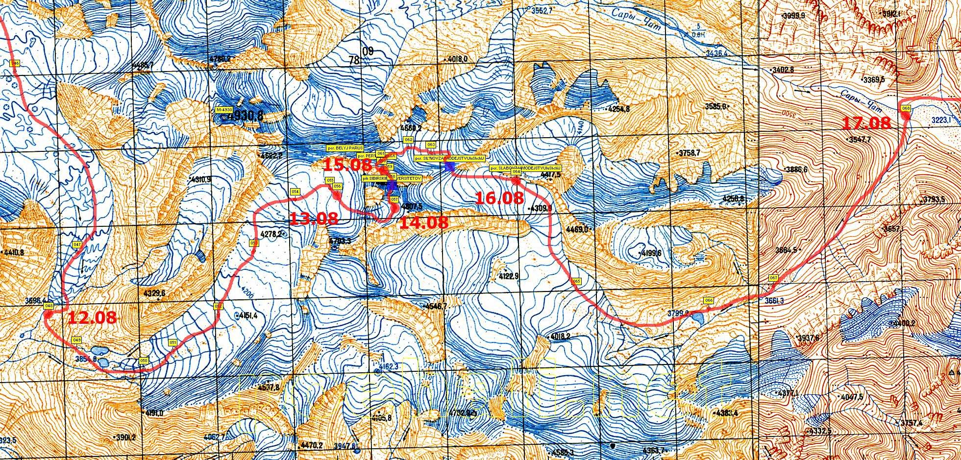 Отклонения от заявленного маршрута На траверсе пика Сибирских университетов спустились с вершины по северо-западному гребню вместо запланированного восточного. От продолжения маршрута после выхода в долину Сарычат пришлось отказаться из- за отставания от графика. За оставшиеся до вылета самолёта дни мы не успевали выйти на север через намеченные перевалы. График движения