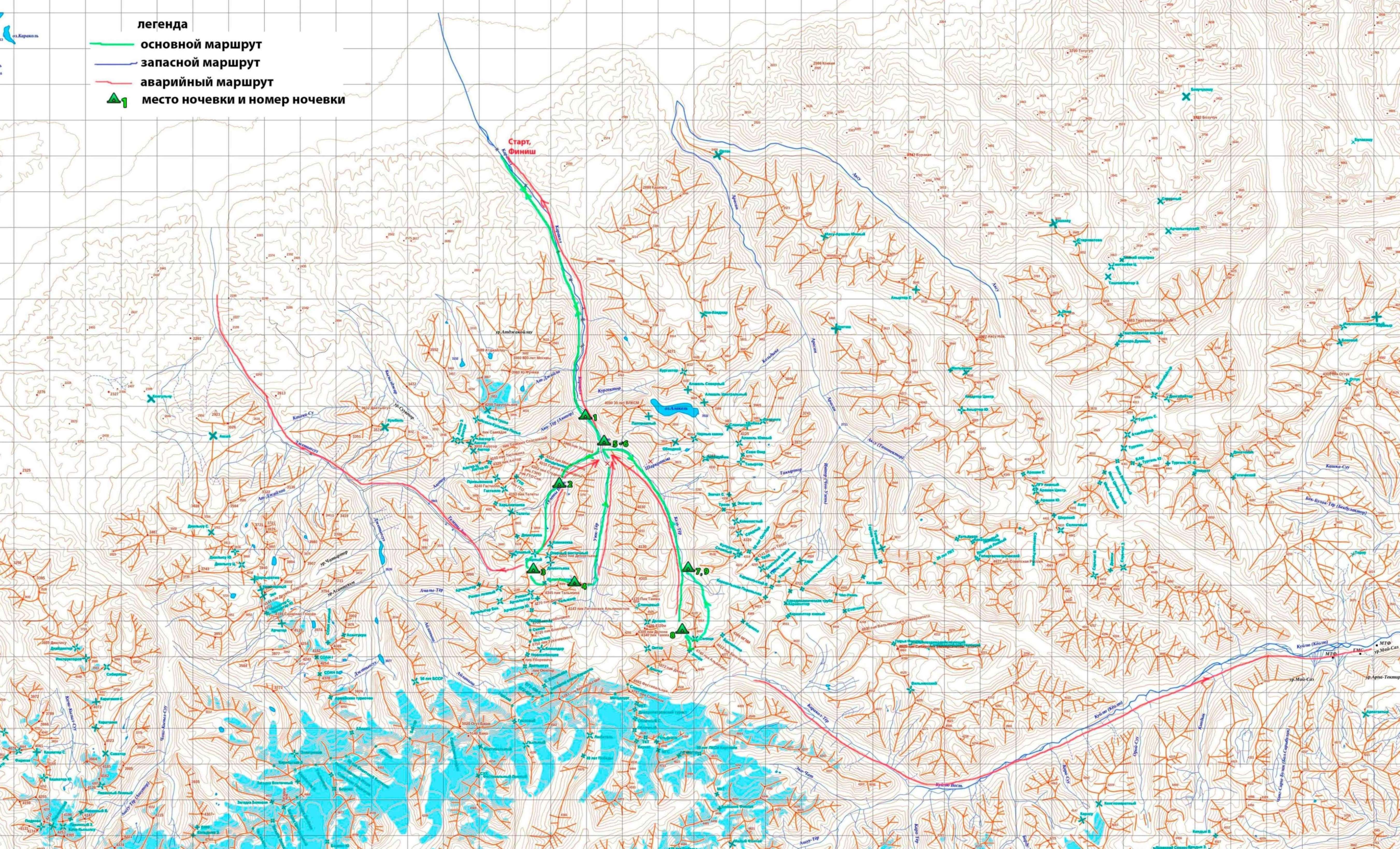 р.Каракол-пер. Озерный (1Б, 3700 м) - пер. 40 лет Киргизии (2А, 4000 м)- пер. Эпюра + в.Альбатрос Зап. по юго-зап. Гребню (2А, 4485 м) - пер. Караколтор (2А, 4340 м)- пик Вильнюсского университета (2А, рад 4930 м) - пер. Степкина (2А, 4450 м) - пер. Хатиджи (2А, 4200 м) - р. Арашан- пер. Аныртор С. (1А, 3700 м) - пос. Теплоключенка Пройденный маршрут р.Каракол-пер. Озерный (1Б, 3700 м) - пер. 40 лет Киргизии (2А, 4000 м)- пер. Эпюра (2А, 4340 м радиально) – пер. Солнце (1Б, 4000 м) – Каракол. Картографический материал Определяющие препятствия маршрута