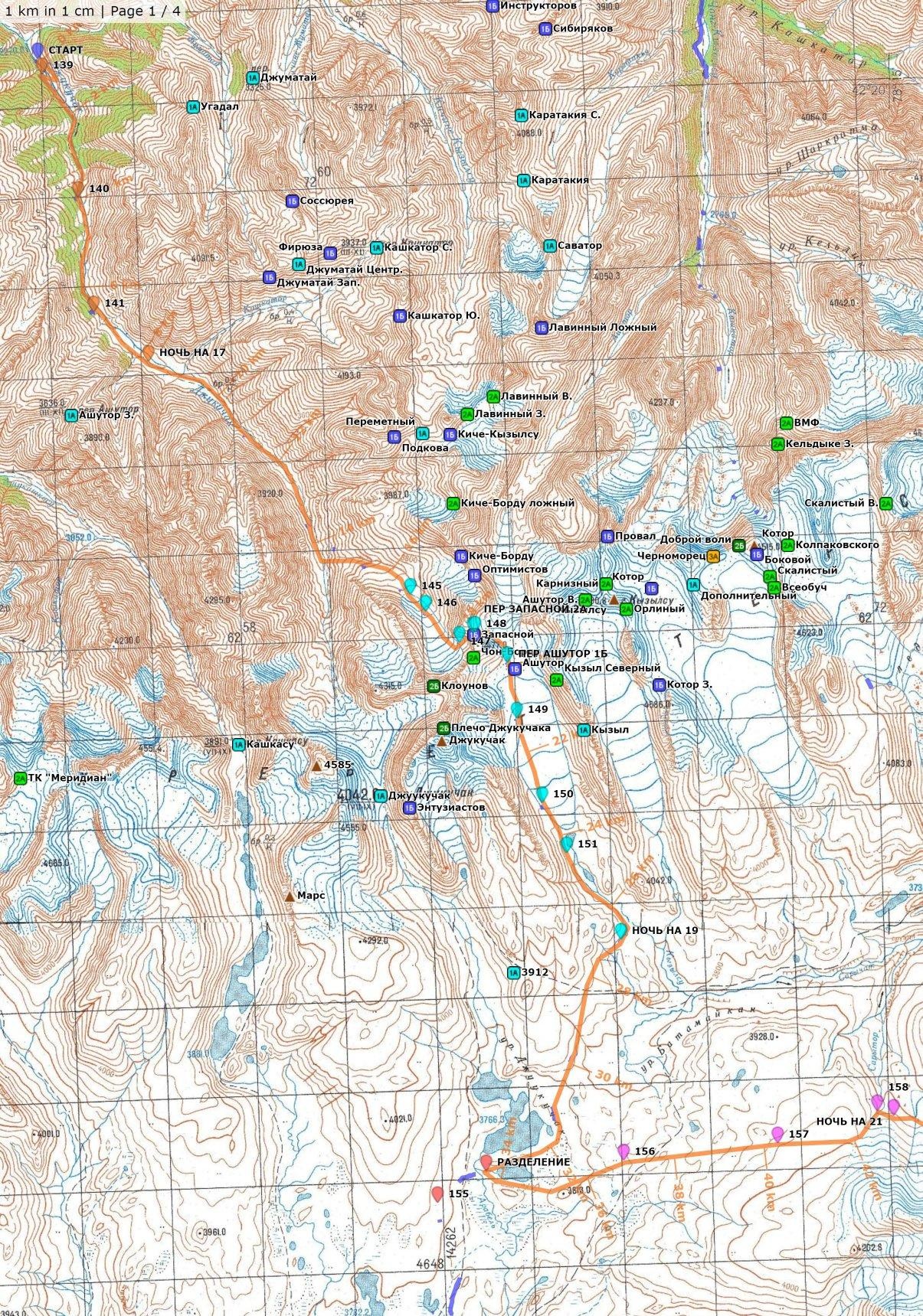 д. р. Джуукучак – [пер. Запасной (2А, 4220)+пер. Ашутор(1Б, 4160)] – д .р. Кызыл-Суу (ур. Бата-Майнан) – ур. Джуукучак – рад. выход к проходной рудника Кумтор – д. р. Са- ры-Тёр (отм. 3730) – пер. Сарытор Ц. (2А, 4573) – л. Петрова – пер. Джаман-Су Ц (2А, 4480) – л. Джаман-Суу – пер. Шукшина Василия (2А, 4620) – л. Петрова – пер. Клешня (2А, 4630) – пер. Кара-Сай С. (2А, 4560) – л. Сев. Кара-Сай – пер. Лагерный (2А, 4620) – л. Коёнду – [пер. Каинды (1Б, 4320) – в. Турклуба МГУ (2А, 4971)(кольцо – траверс)] – л. Южный Кара-Сай – д. р. Карасай – пос. Кара-Сай. Препятствия