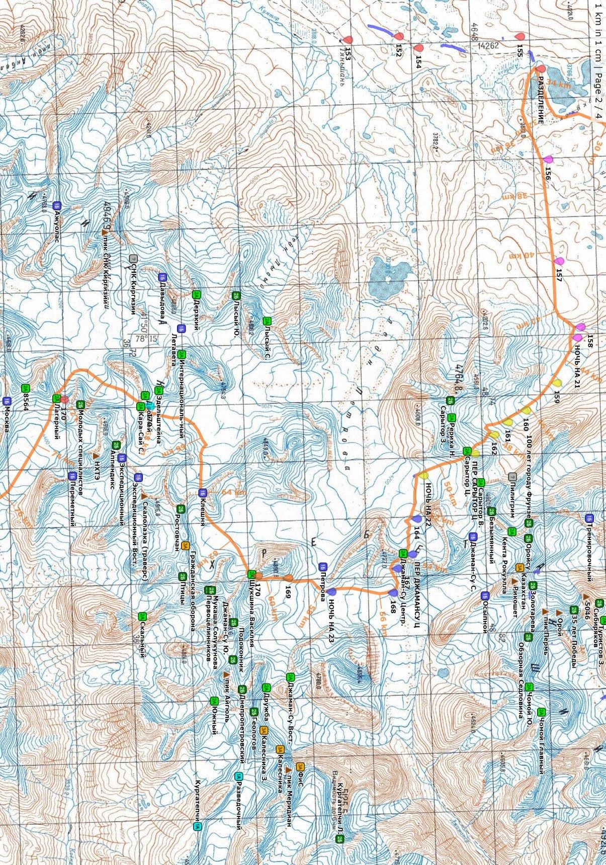Рисунок 1. Высотный график. Схемы маршрутаНиже приведён общий вид маршрута в масштабе 1см : 2,5 км, а также отдельными листами в формате 1 см: 1 км. Карты созданы с помощью сайта nakarte.tk. РаскладкаЕды было 600 г/чел-день. Газа было 42 г/чел-день. Две трети дней – с горячими обедами. При этом зачастую горячий обед съедали уже в точке бивака. Снаряжение Особенности неспециального снаряжения