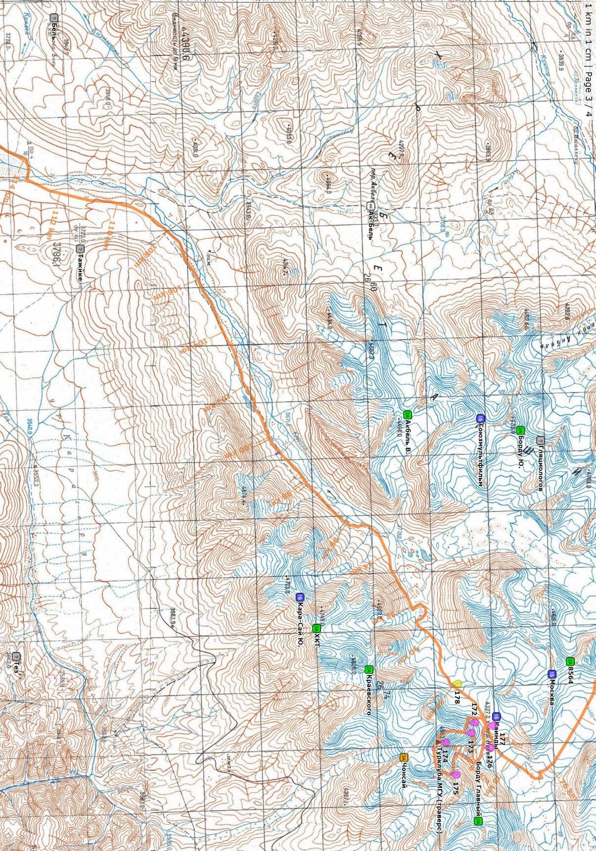 Расчётный вес группового снаряжения получился 4,82 кг/чел. Максимально несли еды на 9 суток – это 6,35 кг/чел брутто с газом. Ограничение веса заплечного личного снаряжения – 9,1 кг (считая без ботинок, треккинговых палок и того, что надето на себя в жаркой долине). Для женщины использовались коэффициенты носимого веса: 0,15 по групповому снаряжению и 0,65 по суммарной раскладке (0,57 по общественной части раскладки) относительно мужчин. Расчётный вес рюкзаков получился: Мужчины: максимум 21,7 кг, минимум 14,9 кг. Женщина: максимум 14,4 кг, минимум 10,0 кг. В целом участники уложились в ограничение по весу, быть может незначительно за него выходя. ЛогистикаСтраховку покупали на сайте saveprolife.ru. Страховые полисы послали в Аксай-тревел. Они заверили, что по такому страховому полису готовы выслать вертолёт. Обмен валюты можно произвести прямо в аэропорту, хотя курс там не очень выгодный: на 4..5 хуже, чем нормальный. С другой стороны по дороге (в Бишкек и Каракол мы не заезжали) мы не обнаружили обменников, поэтому вплоть до окончания маршрута довольствовались тем, что наменяли в аэропорту. Логистику от Бишкека, а также получение газа нам организовал Юрий Траченко: 7504332@gmail.com. В аэропорту Бишкека нас встретила машина, где уже был газ в нужном количестве. Машина довезла нас до села Сару, где осуществлялась пересадка на машину Вадима Зангиева. Логистику в районе Каракола и Терскея нам организовывал Вадим Зангиев: 80zangiev@gmail.com. Берёт он недёшево, зато организует всё весьма надёжно. У Вадима машина с хорошей проходимостью. Он заранее оформил нам пропуска в погранзону (тре- буется для посещения южной стороны Ак-Шийрака и села Кара-Сай). Документы следует высылать за месяц. Вадим забрал нас от села Сару и довёз до места старта в долине Джуукучака, отм. 2300, взяв за это 4000 сом. Также он привёз нам заброску к проходной рудника Кумтор и отдал её из рук в руки, взяв за это 10000 сом. Для выезда из села Кара-Сай нужно было отдельно звонить Вадиму, чтобы он нас забрал за 12000 сом, но мы решили сэкономить и добраться на попутном транспорте. Получилось, что мы почти ничего не сэкономили, а в удобстве и комфорте потеряли. Вадим также помог нам с логистикой уже в Караколе после похода, подсказал с размещением, свозил на дикий пляж на оз. Иссык-Куль. Техническое описание