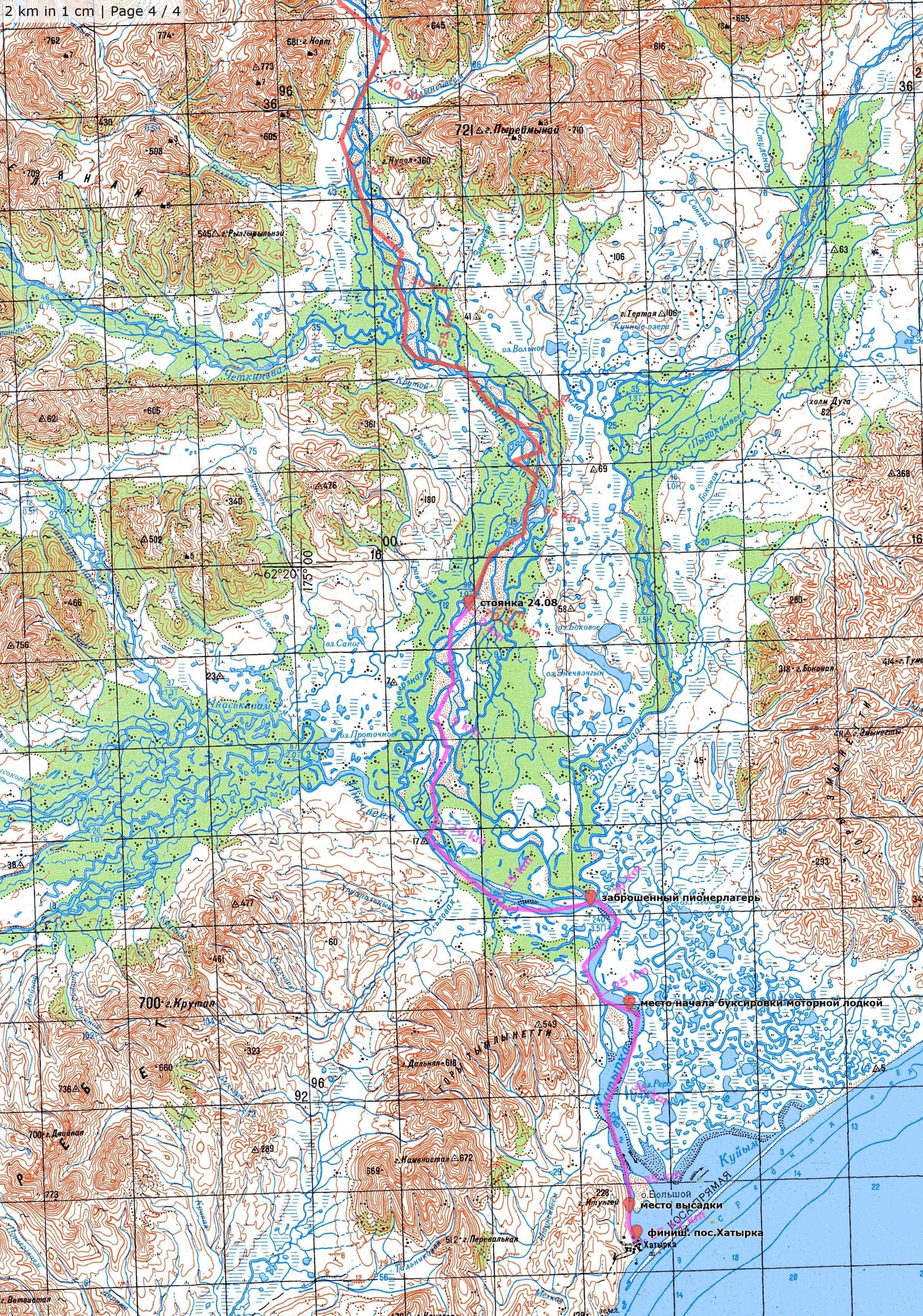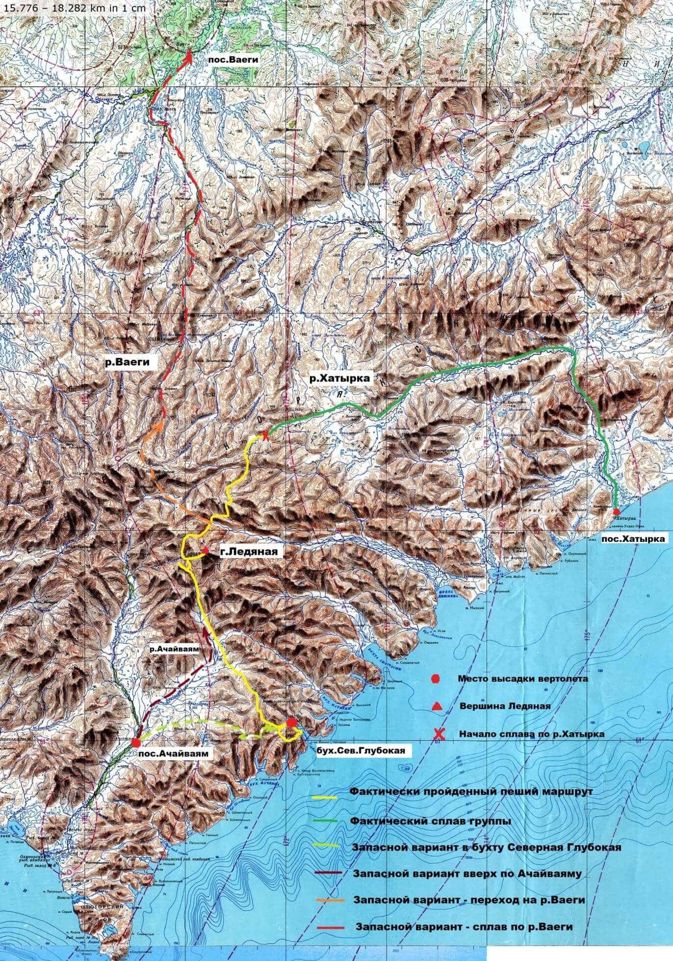 ИТОГИ, ВЫВОДЫ И РЕКОМЕНДАЦИИ ПО ПРОХОЖДЕНИЮ МАРШРУТА. За 30 ходовых дней было пройдено 343,3км пешеходной части , 360км. водной части (всего 703,3 км.) . Бродов 5 в том числе 1А – 3 н/к – 2. Переправ 1 Перевалов 13, в том числе 1А – 2 н/к – 11. Совершено восхождение на вершину 1Б – 1. Каньонов 12, в том числе 1Б – 3 1А – 5 н/к – 4. Количество дней с осадками – 13. Минимальная температура воздуха, по ощущениям, -2°С (дважды замерзала вода в кружке). Максимальная - +20°С, а на солнце и выше. Пройденный маршрут характеризуется достаточной технической сложностью и большой протяжённостью, полной автономностью, что потребовало от участников отличной физической, технической и психологической подготовки. Очень сильные требования должны выдвигаться к ремонтнику и составу походного ремнабора, а так же к аптечке (у нас с этим обстояло все хорошо, из болезней – только небольшой ожог. Еще пяточная шпора. Но ее лечение несовместимо с длительной пешей частью, её остаётся только терпеть). Поход был пройден успешно, в пределах графика, который в силу наличия свободного времени участников был составлен с запасом. Данный маршрут рекомендуется группе, очень хорошо подготовленной физически. Очень важна психологическая совместимость участников, а так же единство целей похода для всех и каждого из участников. К недостаткам похода следует отнести сложность организации заброски участников на начало маршрута, ее высокую стоимость. Необходимо учесть сложность растительного покрова, значительно затрудняющего передвижение и наличие каньонов и ущелий. Нитка маршрута построена логично, грамотно выбрано первоначальное место заброски, если не забывать о мечте побывать на берегу Берингова моря. Включение в маршрут радиальные или кольцевые заходы в попутные хребты (Снеговой, Укэлаят) разнообразило бы его и позволило бы исключить большой пологий прогон вдоль р.Ачайваям. Мы не сделали так по причинам, изложенным в пункте 2.3 и таблице. Для повышения мобильности группы и скорости передвижения, включения в маршрут сложных скальных и ледовых препятствий, облегчения прохождения технически сложных участков можно организовать отдельную заброску водного снаряжения и продуктов на сплав к началу водного участка. Это удорожит поход, но сделает его более насыщенным в спортивном плане. Предполагаем, что при достаточном уровне воды и меньшей загруженности плавсредств, сплав можно начинать по р.Хатырка от впадения притока Зеленый, т.е. на 7км выше начала сплава нашей группы. Карты М1:100000, найденные в сети на ресурсе nakarte.tk (ныне nakarte.me) полностью удовлетворили наши потребности. Для GPS достаточно векторной карты Дороги России для Garmin. Что касается поселков и встреч с людьми: Погранпропуска, необходимые на территории Чукотки, упразднены с июня 2018, нужно только в поселке (Хатырка например) сразу явиться в погранслужбу, сказать кто ты и куда движешься. Далее они лишь по телефону отслеживают твое перемещение. Пограничники нам оказали помощь и содействие (угостили хлебом и рыбой, когда мы появились в поселке, а магазины были уже закрыты), а так же больше, чем администрация, помогали в поисках возможности улететь, и т.д. Проблему жилья мы решали по-разному: в Петропавловске-Камчатском жили у знакомых наших знакомых. В поселке Тиличики нас приютила начальник местной электростанции Федорова Жанна Станиславо