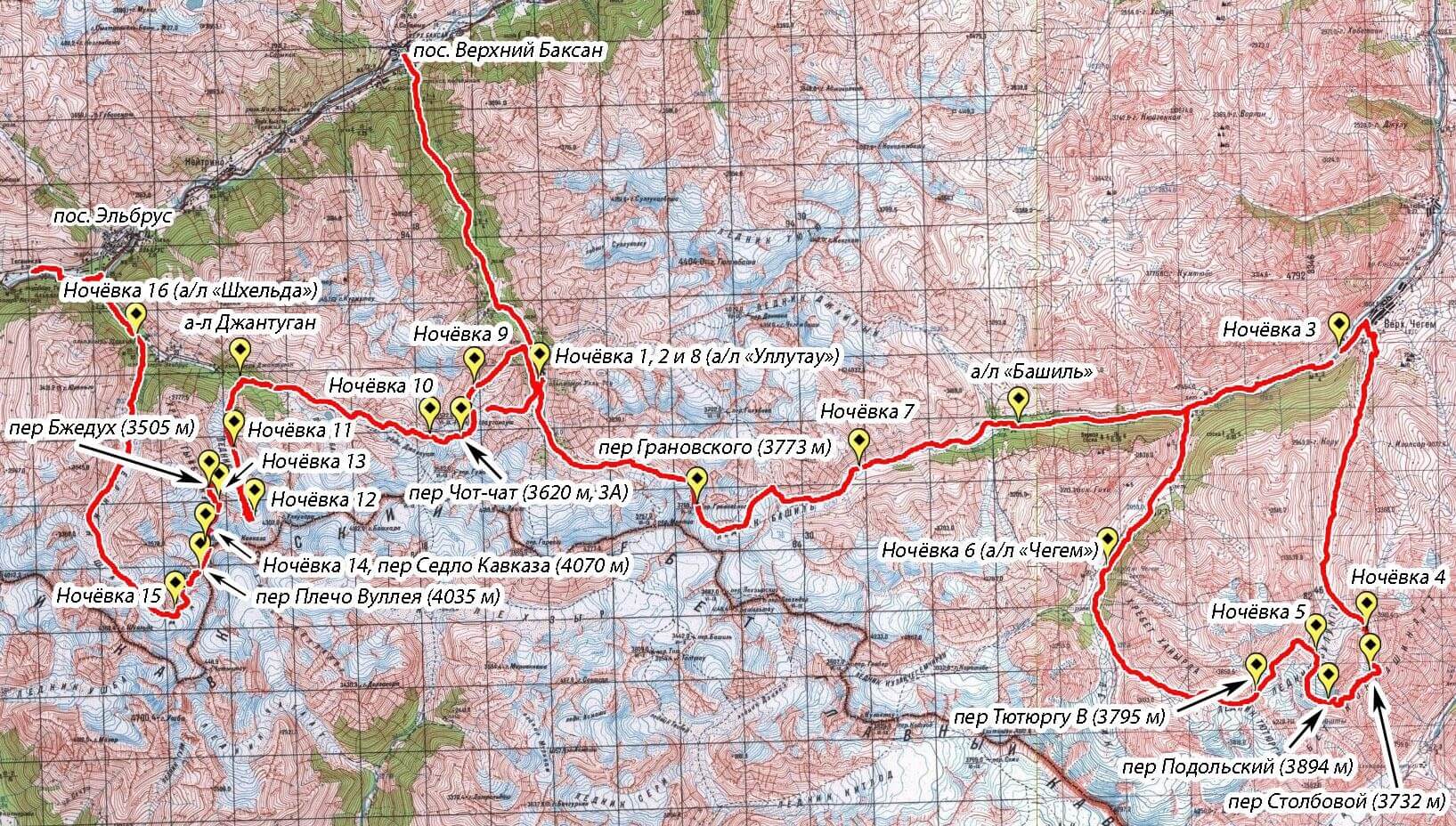 Нитка маршрута заявленная Пос. Верхний Баксан - дол. р. Адыр-су - а/л “Уллу-тау” - дол. р. Куллумкол - пер. Голубева (2А) - дол. р. Башильауз-су - пос. Верхний Чегем (Булунгу) - дол. р. Кору - пер. Столбовой (2А) - пер. Подольский (2Б*) - лед. Булунгу - пер. Тютургу Восточный (1Б) - дол. р. Тютюргу - дол. р. Шаурту - т/б “Чегем” - дол. р. Башильауз-су - т/б “Башиль” - лед. Башиль - пер. Грановского (2А) - а/л “Уллу-тау” - дол. р. Чат-су - пер. Чотчат (2Б) - лед. Джанкуат - а/л “Джантуган” - лед. Кашкаташ - пер. Технической Интеллигенции (3А) - лед. Бжедух - трав: пер. Седло Кавказа + п. Кавказ Восточный (сумм. 3А) - лед. Двойной - пер. Плечо Вуллея (2Б) - лед. Шхельда - а/л “Шхельда” - пос. Эльбрус. Нитка маршрута пройденная Пос. Верхний Баксан - дол. р. Адыр-су - а/л “Уллу-тау” - дол.р. Чат-су (рад) - дол. р. Адыр-су - пос. Верхний Баксан - пос. Верхний Чегем (Булунгу) - дол. р. Кору - пер. Столбовой (2А) - пер. Подольский (2Б) - лед. Булунгу - пер. Тютургу Восточный (1Б) - дол. р. Тютюргу - дол. р. Шаурту - т/б “Чегем” - дол. р. Башильауз-су - т/б “Башиль” - лед. Башиль - пер. Грановского (2А) - а/л “Уллу-тау” - дол. р. Чат-су - пер. Чот-чат (3А) - лед. Джанкуат - а/л “Джантуган” - лед. Кашкаташ - пер. Бжедух (2Б)-лед. Бжедух - трав: пер. Седло Кавказа + п. Кавказ (сумм. 3А) - лед. Двойной - пер. Плечо Вуллея (2А) - лед. Шхельда - а/л “Шхельда” - пос. Эльбрус - пос. Азау - “Приют 11” - в. Эльбрус Западный (2А) - пос. Азау. Технические характеристики Продолжительность похода: 18 дней, 186,9 км Основные препятствия: Траверсы: 2А - 1 3А - 1 Перевалы: 1Б - 1 2А - 2 2Б - 2 3А - 1 Вершины: 2А - 1. Максимальная высота: 5 642 м (в. Западный Эльбрус) Максимальная высота ночевки: 4 141 м (скалы выше «Приюта 11») Максимальный набор высоты: 1 698 м (подъем по дол.р. Кору) Максимальный сброс высоты: 1743 м (спуск с пер. Тютюргу Восточный) Суммарный набор высоты: 13 910 м Суммарный сброс высоты: 13 667 м Суммарный перепад высоты: 27 577 м График движения по дням фактический