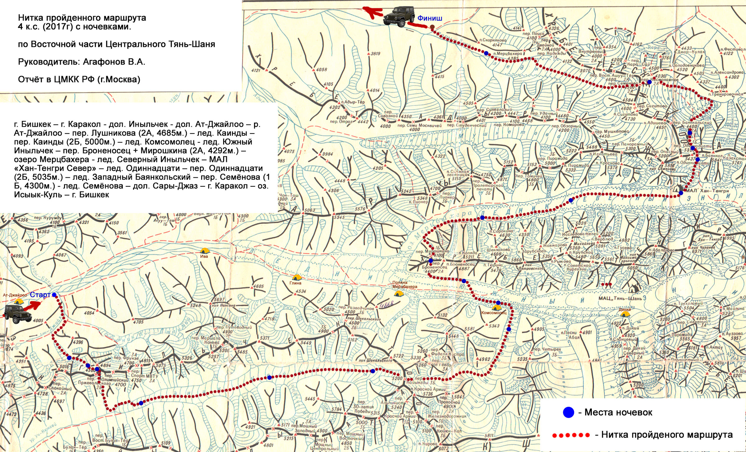 Организационные сведения Оформлением пропусков в пограничную зону занимались самостоятельно и заблаговременно, обратившись в соответствующие службы в Бишкеке. Тем, кто не имеет возможности сделать это самостоятельно, рекомендуем воспользоваться услугами одной из туристических фирм, специализирующихся на этом горном районе («Ак-Сай Трэвел», «Тянь-Шань Трэвел» и др.). В 2017 году стоимость оформления пропуска на одного человека составила = 35$. Группа перед выходом на маршрут застраховалась в страховой компании «РЕССО- гарантия» на 35 000 $, каждый. (Компания ассистанс - Savitar Group). По возможности организации спасработ в районе договорились с компанией «Ак-Сай Трэвел» в Бишкеке, оставив им копии страховых полисов, паспортов и маршрутной книжки. Большое внимание было уделено вопросу питания. Весь поход питались сублиматами изготовленными фирмой JAWAFOOD (http://rww.myjino.ru) – Виктор Яхонтов, Телефон: +996555890067 (Бишкек). Сублиматы были изготовлены и расфасованы специально для нас по предварительному заказу, с учетом количества участников, необходимой калорийности и напряженности похода. Важные транспортные вопросы по трансферам в район и обратно из г. Каракол решали через частную транспортную компанию: – Денис, Телефон: +996556421742, +996779368940. Спасибо большое Денису, остались очень довольны что обратились именно к нему. Человек пунктуальный, обязательный, профессионал в своем деле. Заявленный и пройденный маршрут Заявленный маршрут: г. Бишкек – г. Каракол – дол. Иныльчек – дол. Ат-Джайлоо – р. Ат- Джайлоо – пер. Лушникова (2А, 4685м.) – пер. СКТО «Спартак» (2А,4800) – лед. Каинды – пер. Каинды (2Б, 5000м.) – лед. Комсомолец – лед. Южный Иныльчек – пер. Броненосец + Мирошкина (2А, 4292м.) – озеро Мерцбахера – лед. Северный Иныльчек – МАЛ «Хан- Тенгри Север» – лед. Одиннадцати – пер. Одиннадцати (2Б, 5035м.) – лед. Западный Баянкольский – пер. Сигитова (2А, 4600м.) – лед. Семёнова – дол. Сары-Джаз – г. Караколоз. Иссык-Куль – г. Бишкек Пройденный маршрут: г. Бишкек – г. Каракол – дол. Иныльчек – дол. Ат-Джайлоо – р. Ат- Джайлоо – пер. Лушникова (2А, 4685м.) – лед. Каинды – пер. Каинды (2Б, 5000м.) – лед.Комсомолец – лед. Южный Иныльчек – пер. Броненосец + Мирошкина (2А, 4292м.) – озеро Мерцбахера – лед. Северный Иныльчек – МАЛ «Хан-Тенгри Север» –лед. Одиннадцати – пер. Одиннадцати (2Б, 5035м.) – лед. Западный Баянкольский – пер. Семёнова (1Б, 4300м.) – лед. Семёнова – дол. Сары-Джаз – г. Каракол – оз. Иссык-Куль – г. Бишкек Пройденный маршрут полностью соответствует заявленному, кроме двух моментов: